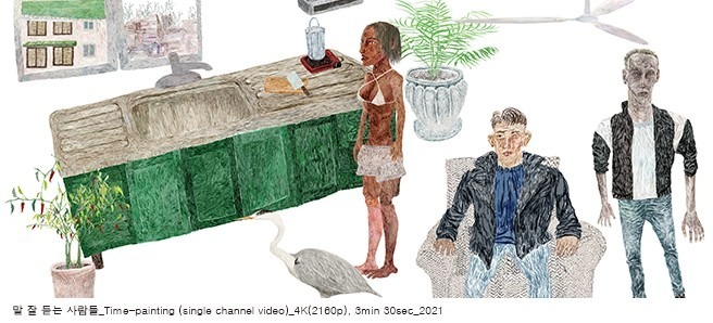 유령 같은 시간의 잔상을 재생시키기 OLED, QLED 등 스스로 발광하는 디지털 평면 디스플레이의 눈부신 진화는 현실보다 더 생생한 현실감을 선사한다. 우중충한 현실보다 더 이상적인 현실상을 반짝이는 스크린 위에 살아 움직이게 만든다. 좀 더 선명하고, 좀 더 찬란하고, 좀 더 매끄러운 움직임이 구현되는 가상의 스크린 위로 ‘기술나라의 푸른꽃’은 그렇게 손에 바로 잡힐 듯하다. 동시대 미술에서도 생생한 현실감과 자연스러움을 장착한 디지털 아트의 기술적 역량은 갈수록 그 입지를 넓혀가고 있다. 작품의 지향점이나 기술적 매체는 각각 다르지만 몰입감 있는 환영적 세계, 나아가 증강 현실을 열어주는 많은 작업들이 대중적 인기를 구가하고 있다. 현실을 잠시 구멍 내는 희열이야말로 예술에게 대중이 가장 기대하는 역할이기 때문일 것이다. ‘메타버스’라는 용어가 ‘4차 혁명’ 이후 등장한 또 다른 깃발처럼 휘날린다. 하지만 우리는 이미 현실이라는 물리적 ‘유니버스’를 초과한 세계를 살아내고 있다. 우리는(대개 도시에 거주한다고 치자.) 온통 디지털 디스플레이로 둘러싸인 세계에 살고 있다. 아침에 눈뜨자마자 확인하는 스마트폰 액정부터 TV, 컴퓨터 모니터, 그리고 광고 전광판들… 버스 안이나, 거리나, 집 안 어디에서도 디지털 디스플레이로부터 도망치기란 불가능에 가깝다. 그리고 그 스크린들에는 언제나 내 곁의 사물들보다 더 찬란하고 완벽한 형상들이 넘쳐난다. 오히려 우리는 이 완벽하지 않은 현실의 사물과 인물을 완벽해보이게 만드는 애플리케이션과 장치들로 보정하고 매끈하게 만들어 온라인에 디스플레이한다. 이승훈의 디지털 애니메이션 작업은 그러한 광학적 디스플레이를 일종의 통로로 삼되, 현실적인 감각의 증강과는 다른 방향을 향한다. 우리가 미술사에서 알고 있는 초현실주의가 현실을 초월하는 어떤 이상적인 상태의 재현이나 환상과는 정반대이듯이, 이승훈의 디스플레이는 현실보다 더 매끈한 디지털 환영을 오히려 삐걱거리고 울퉁불퉁한 매질로 변형시킨다. 이상한 말이지만, 나는 그의 애니메이션을 보는 순간 메렛 오펜하임의 가 떠올랐다. 모피로 만들어진 찻잔과 티스푼은 따스하고 매끄러운 유기질의 감촉을 떠올리려는 찰나, 그 환기된 정서를 불쾌하고 난감하게 뒤집어버린다. 이승훈의 작업은 ‘오브제’가 아니고 디지털 평면 회화지만, 오펜하임의 찻잔처럼 익숙하고 편안한 감각을 거스르는 반항적 텍스처를 드러낸다. 말하자면, 그의 애니메이션 회화는 디지털 디스플레이에서 으레 기대하는 매끈하고 환영적인 이미지, 현실보다 더욱 실감나는, ‘자연스러움’을 자랑하며 ‘살아나는animated’ 이미지를 배반한다. 메렛 오펜하임의 찻잔은 일종의 농담이면서 무의식 속에 각인된 그 무엇이 뒤집혀 나오는 언캐니한 사물이며 현실 이미지의 배후를 열어보이는 촉매제다. 이승훈의 작업에서 분절되고 이상하게 확대되고, 반복적으로 삐걱거리는 인물, 사물, 동물, 식물들의 형상 또한 희미한 (불)쾌를 불러일으킨다. 거기엔 은밀한 농담의 뉘앙스 또한 깃들어 있다고 나는 짐작한다. 그는 “디지털 평면에서 일종의 시간의 원근법을 만들어내고 싶었다”고 이야기한다. 처음 들었을 때 무슨 말인지 잘 이해되지 않았다. 대신 그의 그림에서 원근법이 철저히 깨져있다는 점은 금방 알아챌 수 있었다. 또 애니메이션이지만 서사 구조가 없을 뿐 아니라 루프되는 짧은 장면에서조차 세부적으로 생산되는 의미, 혹은 이야기가 거의 없다. 본디 투시 원근법은 서사의 한 장면을 구현하는 데 탁월한 재현 기법이다. 대략 콰트로첸토 시기부터 시작된 원근법적 회화들은 흐르는 이야기가 일시 정지한 한 장면으로서, 우리는 그 한 장면으로부터 캐릭터, 이야기, 역사, 신화라는 장대한 총체를 환기한다. 하지만 또 해체적이고 탈원근법적인 그림은 현대 회화가 지닌 패러다임이라 이 그림이 디지털 디스플레이로 재생된다 한들 그다지 새로울 것은 없다. 유독 흥미로운 점은 그의 그림에서 인물들(특히 여성의 형상들)이 너무 줌인되어 있거나, 비율이나 그리드가 맞지 않고 다소 음침한 왜상으로 그려져 있다는 것이다. 무엇보다도 이 작업들은 분명 애니메이션이지만 동작의 부드러운 움직임을 구현하는 데 그다지 관심이 없어 보인다는 점이다. 인물의 피부든 옷의 광택이든 식물, 사물의 표면이든 경련 같은 미세한 움직임, 혹은 기계적이고 반복적인 단순한 움직임이 주를 이룬다. 그러한 움직임으로 인해 형상들은 ‘살아났다animated’기보다 오히려 부동적으로 보인다. 그리고 여기서 작동하는 모션은 비현실적이고 망상적이어서 그 부동성을 훑어 관찰하는 빛의 시선에 가깝다(때문에 나는 빅토리아 시대 사후 사진Post-mortem photography을 떠올리기도 했다). 그는 디지털 펜과 포토샵을 사용해 세필 기법으로 형상을 그린다. 이미지를 확대한 상태에서 이뤄진 장시간의 작업으로 인해 어그러지는 형상과 색채의 변화가 누적된 시간들을 드러낸다. 이를 재생시키는 일은, 말하자면 붓질의 시간적 축적을 재생시키는 셈이다. 보통 디지털 디스플레이로