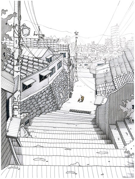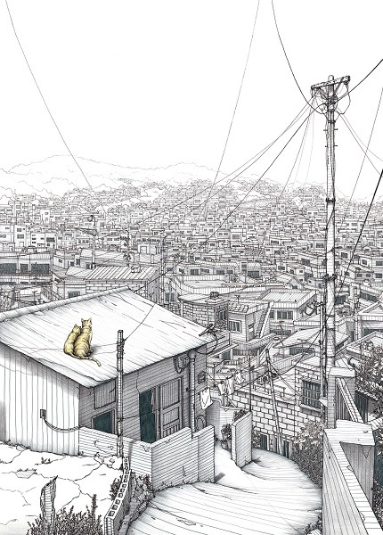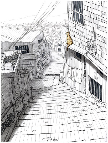특정 장소들을 배경으로 그곳을 바라보는 나와 공간이 주는 감성을 그곳에서 살아가는 길고양이를 통해 다양한 삶의 모습들을 이야기하려고 하였다.따뜻하고 정겨운 감성과 차갑고 외로운 감성들이 대립하지 않고 공존하며 삶의 흔적들로 곳곳에 남아 있는 모습들을 담백하고 섬세하게 담아내려고 하였다. 서울의 여러 비슷한 곳들을 찾아다니며 그린 것을 시작으로 이 연작은 연고지로 배경을 넓혀가며 현재에 이르고 있다. 여러 마을의 골목길들은 우리들의 집 바깥에 걸친 공유지다. 그럼에도 불구하고 골목길은 완전히 공적인 곳이라고 할 수 없는 그 무엇을 담고 있다고 할 수 있다. 이와 같은 일종의 경계를 표현함에 있어 작가의 삶과 함께 이야기 하고자 하였다. 예전에 있던 곳, 지금 머물고 있는 곳, 그리고 언젠가 돌아갈지도 모르는 곳, 그 어디에도 전적으로 기댈 수 없이 쉼 없는 모습들을 의미하기도 한다. 과거와 현재의 삶이 공존하며 그것은 시각적으로 표현될 때 각각의 특별함이 되어 계속해서 작품으로 이어지고 있다.