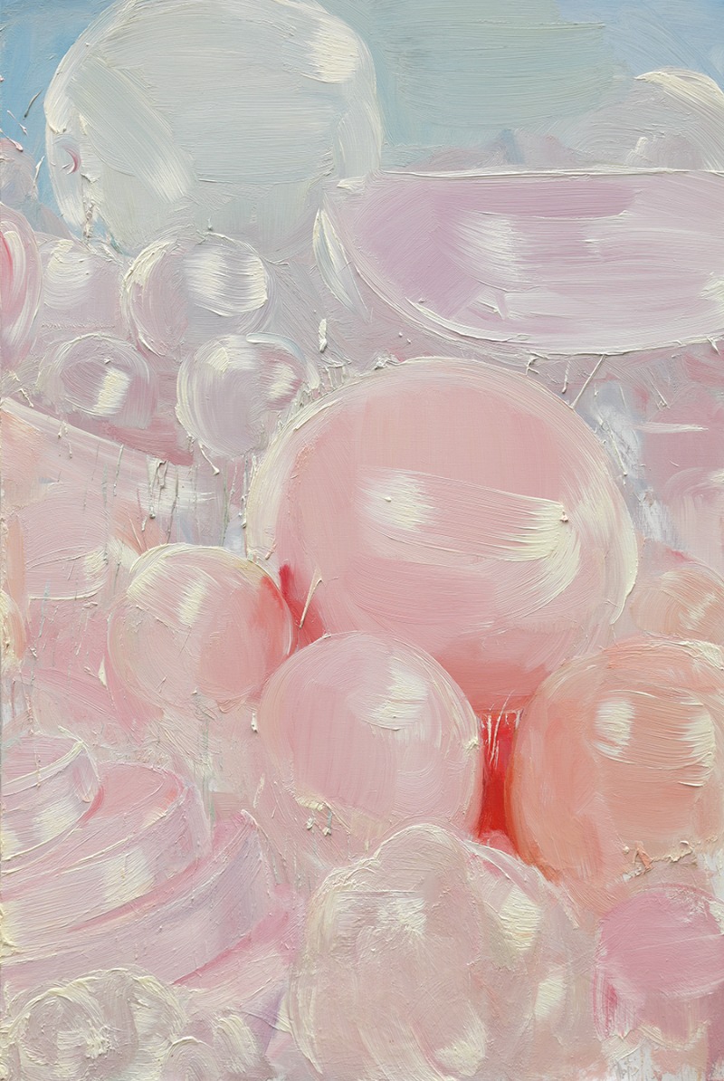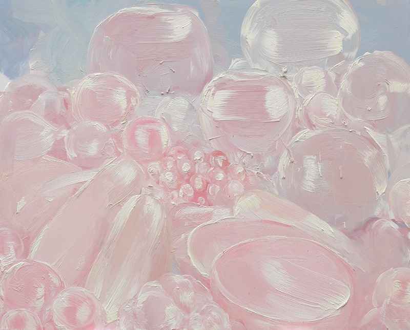 정물시리즈는 과도한 빛에 의해 사물의 그림자와 어두움이 사라지고, 고유색은 휘발된 사태를 표현한 작업이다. 광택제와 조명으로 발광하는 듯한 과일은 실제보다 더 풍만해 보이고, 부위별로 포장된 고기는 더 이상 피를 흘리지 않는 ‘살(肉)’ 이 되었다. 흠집 나고 고통 받는 살이 우리의 시야 밖으로 사라지고, 그 자리에 반짝이는 것들의 매혹과 살의 관능이 대신한다. 나는 그러한 “전환의 결과”와 “대체”를 그려내고자 한다. 김진 (출처= 플레이스막2)