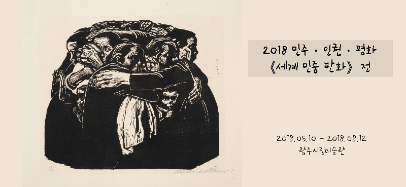 2018 민주·인권·평화 <세계 민중 판화>전 광주시립미술관은 2013년부터 광주민주화운동의 정신을 기리고 공유하고자 민주·인권·평화전을 개최해 오고 있다. 이번에 개최하는 <세계 민중 판화>전은 케테 콜비츠, 도미야마 다에코, 오윤 작가의 판화 작품을 통해 인간 생명의 존엄과 가치, 오월 광주의 비극, 그리고 민중의 삶과 신명을 느껴볼 수 있는 전시가 될 것이다. 케테 콜비츠는 독일 출생으로 인간생명에 대한 존엄과 가치, 전쟁의 참혹함과 평화의 소중함을 작품으로 보여준 위대한 예술가이다. 이번 출품작품들은 일본 사키마 미술관 소장품으로 전쟁으로 인한 희생자들과 살아남은 자들의 아픔, 그리고 전쟁에 대한 공포를 목판으로 표현한 <전쟁>연작 7점을 포함 15점이 전시된다. 사회적 약자들과 전쟁 피해자들을 위해 삶과 예술을 일치시켰던 케테 콜비츠의 작품들은 보는 이들의 마음에 큰 울림으로 남을 것이다. 도미야마 다에코는 일본 고베 출생의 양심적인 일본인으로 일본의 침략과 만행을 고발하고, 특히 한국민에 대한 원죄의식을 담은 내용을 주테마로 그려오면서 인권의식을 계몽하는데 앞장서 온 예술가이다. 전시 출품작품들은 광주시립미술관 하정웅컬렉션으로 1980년 당시 광주민주화운동 소식을 접한 그가 이 사건을 세계에 호소하고자 제작한 판화시리즈 중 일부이다. 오윤은 짧은 생을 살았지만 1980년대 이후 괄목할만한 예술적 성과로 인해 한국 민중미술을 대표하는 작가로 평가받는다. 오윤은 사람들과 어울리는 것을 좋아했고 풍류를 즐길 줄 알았으며, 회화가 갖는 단일성보다는 복제 가능한 판화를 선택해 민중의 삶과 신명을 목판으로 표현하였다. 그의 목판 작업은 당시 다양한 인쇄물의 삽화로 대중들에게 전파되었으며 후배작가들에게도 많은 영향을 미쳤다.