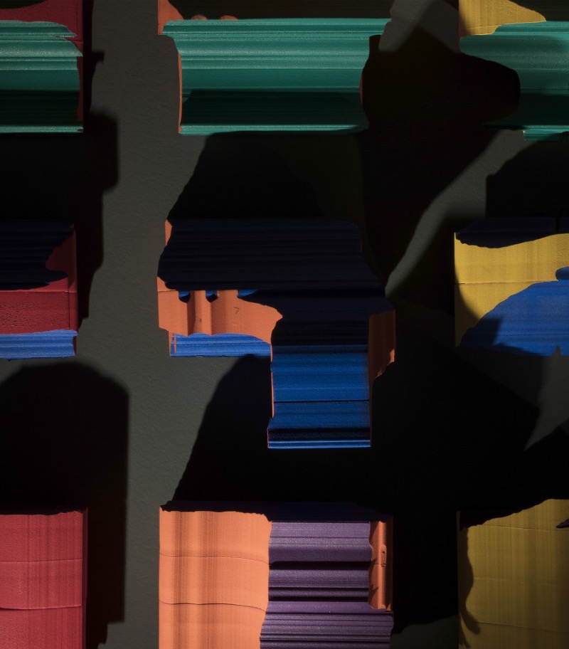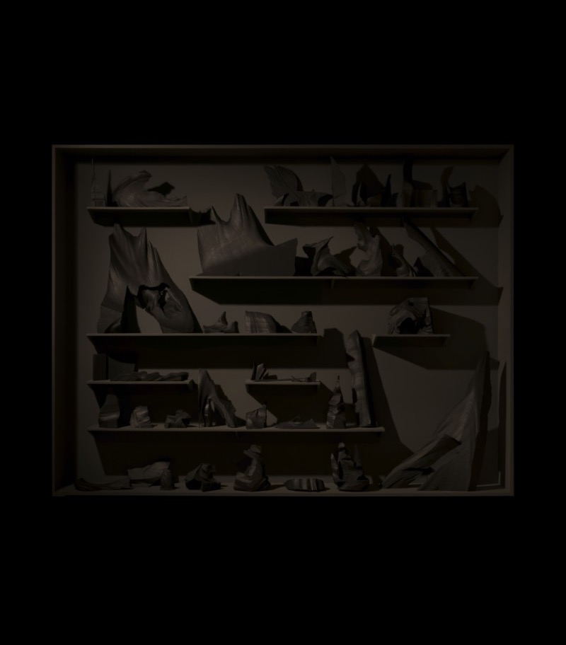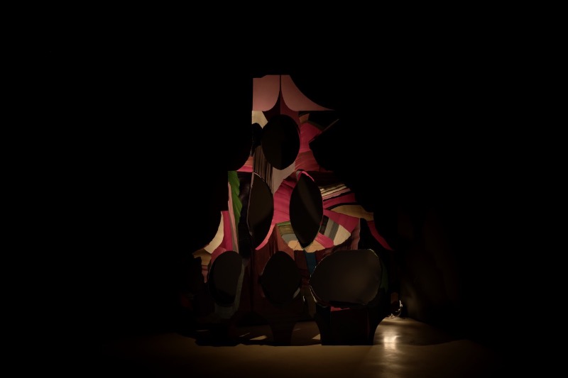 두 바퀴 회전 (장혜정 기획자) 이것은 여러 개의 임시적인 만남이 반복적으로 일어나는 상황 그 자체일 수 있다. 가라앉지 않기 위해 계속해서 바다의 표면을 회전하며 부유하는 배가 그려내는 물결, 글과 이미지의 결속과 분리가 되풀이되는 시간, 불명확한 이야기와 깜박이는 불빛 만을 부여받은 관객과 전시의 불완전한 조우, 김용관과 장혜정의 결과를 알 수 없는 실험의 현장. 그리하여 그 만남들을 통해 포착되는 미지의 풍경을 보려고 하는 시도이다. 《두 바퀴 회전》은 꽤 오랜 시간 되풀이 된 김용관과 장혜정이 나눈 대화에서 비롯된다. 그러나 진정 단초가 된 것은 주고받은 내용이 아니라 대화라는 거듭된 행위이다. 지속적으로 이야기를 나눈다는 것은 처음 내린 판단을 변화시키거나, 망각하고 있었던 내재된 생각들을 상기하고, 새로운 것을 발견할 수 있는 시간을 번다는 것과도 같다. 이 둘의 대화도 그러하다. 그러므로 두 바퀴는 김용관과 장혜정일 수 있다. 두 개의 바퀴는 쉬지 않고 돌며 매번 다른 점에서 만나고, 그 미끄러지는 듯한 스침은 일시적이지만 흔들리지 않는 축은 만남을 유지시킨다. 대부분 김용관의 작업들은 그가 상상하거나 만들어낸 가상의 규율과 조건으로 운용되는 미지의 세계를 전제로 한다. 그 가상의 세계는 우리의 눈 앞에 실존하지 않지만, 김용관이 써 내려간 글로써 존재한다. 그의 글 안에 기록된 규칙들은 작은 단위의 모듈로 만들어지고, 임의적으로 배열되고 쌓이며 추상적 이미지로 전환된다. 작가가 최종 도달한 추상적 이미지만을 처음으로 접했던 장혜정은, 대화라는 행위의 반복을 통해 그의 시각 이미지의 저변에 깔려있던 이야기의 힘에 대하여 생각한다. 그리고 그 둘의 관계에 대해서 생각해 본다. 따라서 두 바퀴는 이미지와 텍스트일 수 있다. 중첩되어 있지만 작가가 쌓아 올린 수많은 이미지화 단계에서 가려진 이야기를 이미지와 동일한 선상에서 회전하도록 재배치하기로 한다. 김용관이 2014년 즈음 쓴 <시계방향으로의 항해>라는 미완의 글은 나선형을 그리며 시계방향으로 순환하고 있는 거대한 크루즈선를 배경으로 한다. 이미지의 신과 이야기의 신의 대화로 만들어진 이 크루즈선상의 세계는 외부에서 새롭게 유입되는 자원이 차단된 곳으로, 존재하는 어떤 물건이나 자원도 버리지 못하고 해체와 재조합의 과정이 되풀이되며 유지되는 세계이다. 이 위태로운 세계에서의 삶을 영속하기 위하여 시계방향으로의 회전과 반시계방향으로의 회전을 주장하는 상반된 두 의견이 존재한다. 두 입장은 첨예하게 대립하지만 결국 목적은 하나다. 침몰하지 않는 것. 김용관이 떠올린 가라앉지 않기 위해 끝없이 제자리 돌기 하는 세계를 함께 상상해본다. 그리고 그 세계가 작가를 통해 다시 이미지로 구현되는 모습을 따라가 본다. 전시장에는 <시계방향으로의 항해>를 모티브로 구축한 새로운 세계가 존재한다. 그 세계가 만들어지는 순서는 다음과 같다. 작가는 1800x1600x1000cm 크기의 아이소핑크 육면체를 원형으로 삼는다. 1. 스티로폼과 아이소핑크를 임의로 쪼개며, 파편적인 조각물을 만든다. 2. 1번 조각물을 모방하며, 조금씩 다르거나 더 선명한 조각물을 만든다. 3. 2번 조각물의 형태를 여러 시점에서 관찰하고, 특정한 시점의 실루엣 모양으로 납작한 유리 조각물을 만든다. 4. 다시 두께를 부여하고, 조각물을2개씩 교차시켜 교집합이 되는 부분 만을 남긴다. 5. 1~4번의 과정에서 무의식적으로 반복하는 조각 방식과 형태를 변주하며 또 다른 조각물을 만든다. 6. 5번 조각물의 표면과 결을 관찰하며, 공통으로 등장하는 규칙적 특징을 찾아 사진으로 담는다. 7. 5번 조각물을 단순한 모티브로 전환하고, 동일한 이미지를 증축 또는 반복하며 새로운 이미지를 탐구한다. 8. 1~7번의 과정에서 발견되는 시각적 특징들을 규칙/조건/단위로 삼아 모듈의 단위로 응축 시킨다. 9. 모듈 중 하나를 선택하고 임의로 쌓아 올리며 조각물을 만들고, 그 표면을 깎는다. 10. 3D 프로그램을 사용하여, 표면을 깎기 전 상태의9번 조각물을 구부리기/늘리기/잡아당기기 만으로 위상학적으로 동형인 조각물을 만든다. 그리고 표면을 깎는다. 이 조각물은 그가 상상하는 다음 세계를 구축하는 원형이 된다. 작가에 의해 한없이 해체되고 변주되고 때로 비약되는 이미지는 미지를 향한 명확한 방향을 지시하거나 세계의 모습을 제시하는 것과는 거리가 멀다. 도리어 그 반대이다. 밝음 보다는 어둠의 시간이 더 길게 느껴지는 공간에서는 아무리 애를 써도 전체를 볼 수 없고, 대신 의지하게 되는 내레이션 역시 길은 안내하기보다는 방향 감각을 더욱 상실하게 만들지도 모른다. 하지만 이것은 길을 잃은 것이 아니다. 미지는 말 그대로 “알지 못함”이다. 이 알지 못하는 세계는 어쩌면 규정되거나 관습적인 방식으로는 알아차리지 못하는 것이 당연할지 모른다. 그러니 익숙한 태도로 이미지의 표피를 더듬으려 애쓰기 보다는, 조타를 잡았던 손을 놓고 물결의 흐름에 따라 배가 항해하도록 두는 시도가 필요하다. 그것이 나와 만나 어떠한 방향으로 회전하게 될지는 아직 알 수 없