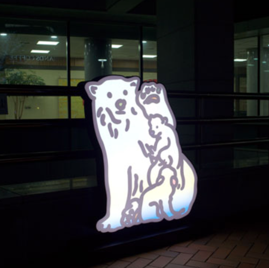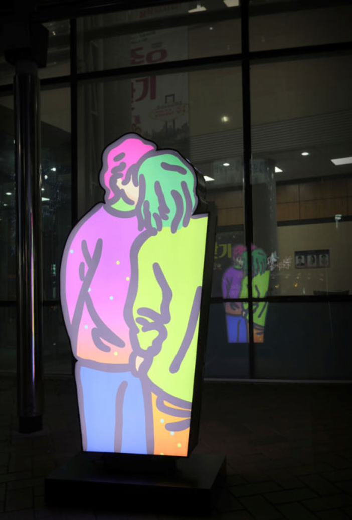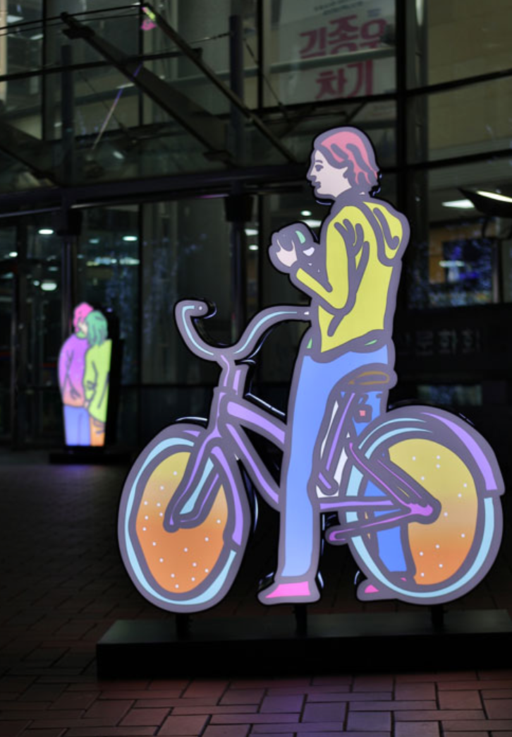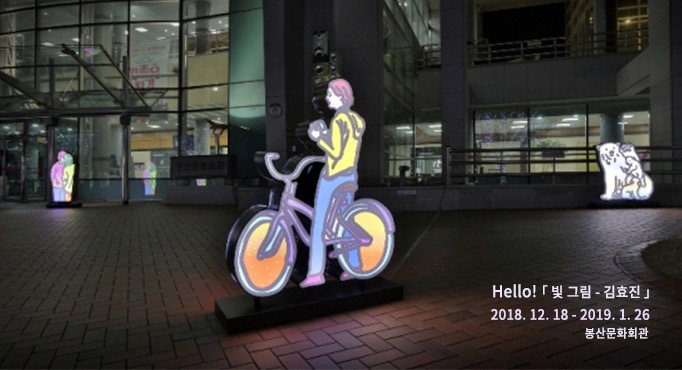 아무런 생각 없이 거리를 걷다가 문뜩, 입을 맞추는 ‘연인’ 이미지의 빛 덩어리를 맞닥뜨리는 낯선 상황이 재미있다. 환하도록 빛이 나는 ‘자전거를 탄 사람’과 ‘북극곰’ 가족을 만나는 것도 유쾌하다. 건물 안에서 만나는 ‘강아지를 안고 있는 사람’과 ‘책을 보고 있는 사람’, ‘신문을 보는 사람’ 그리고 창가의 ‘뒷모습’도 아기자기한 즐거움을 준다. 마땅히 해야만 할 일을 하는 고달픈 모습이 아니라 물질적으로든 시공간적으로든 넉넉함을 즐기는 모습의 이미지라서 그런지 바라보는 것만으로도 입가에 웃음이 번져난다. 게다가 가끔 가볍게 끼어드는 사색思索은 덤이다. 봉산문화회관 야외 광장과 복도, 계단에서 우연히 만날 수 있는 이번 ‘빛 그림-김효진’ 설치미술전은 그동안 주목하지 않았던 거리의 어떤 장소 혹은 건물 밖 광장과 건물 내부의 구석지고 정형적인 실내 공간들 사이를 다시 바라볼 수 있도록 주의注意를 환기喚起시킨다. 김효진 작가는 주차장으로 내려가는 계단실의 벽면이나 엘리베이터 앞에 놓인 의자 옆, 바깥 풍경이 보이는 계단 층의 유리 벽면 등 무의미하거나 지루하게 느껴져 대부분 스쳐 지나쳤던 공간에 LED 조명으로 밝게 빛나는 ‘빛 그림’을 설치하였다. 이들 ‘빛 그림’은 무미건조하며 어둡고 딱딱한 도심의 건물 내․외부와 주변을 환하게 밝혀주는 친화적인 존재감을 드러낸다. 작가의 ‘빛 그림’에 등장하는 이미지들은 주로 일상생활 속에서 발견한 것들이다. 작가의 평소 드로잉을 살펴보면, 집 안에서 창문을 통해 바라보는 풍경, 책상 위에 널브러져 있는 음식들과 젓가락, 휴대전화기, 장식용 양초, 스탠드, 펼친 책, 펜, 거실의 화분 식물과 싱크대 위의 그릇 등 일상의 장면들을 바라보고 선택하여 그린다. 어떤 경우에는 걷거나, 자전거와 보드를 타거나, 수영을 하거나, 잔디밭에 앉아 여가餘暇를 즐기는 일상의 신체행위를 바라보고 그리기도 한다. 작가가 바라보고 그려낸 일상이 새로움으로 다가오는 것은 시선을 사로잡을 만큼 단순하고 명료하게 굵은 선으로 그린 드로잉 방식 때문일 것이다. 우리는 복잡하고 흐릿한 것들을 과감하게 생략해버린 굵고 두꺼운 선을 바라보면서, 개인의 경험과 기억, 시간들이 얽히고 축적되어 혼재하는 삶의 복잡함과 다양한 면모들을 여유롭게 바라볼 수 있는 힘을 환기시켜주는 경험을 할지도 모른다. 한편, 작가의 ‘빛 그림’을 제작하는 과정에는 대중과의 소통에 관한 실험이 엿보인다. 직접 찍은 사진이나 인터넷에서 발견한 이미지를 따라서 자유롭게 드로잉을 하고, 그 드로잉 선을 굵은 펜으로 덧 그려서 선 정리를 한 후에 컴퓨터 작업으로 옮긴다. 옮겨진 드로잉 이미지는 컴퓨터 그래픽 프로그램으로 선을 더 굵고 선명하게 강조하거나 생략, 변형하여 드로잉 이미지의 독자적인 분위기와 성격을 강화한다. 그리고 원하는 색을 선택하여 입힌 후에는 광고전문 업체에 의뢰하여 조형물을 제작하는 것이다. 이처럼 작가는 다양한 일상생활의 소재와 만화를 닮은 선화線畵 기법, 상업광고 제작시스템의 이용 등을 자신의 미술 작업 속으로 끌어들이는 방식으로 주관적인 예술에서의 대중성을 다각적이고 다층적으로 실험한다. 1미터 정도 크기의 플라스틱 박스 안에 담긴 500여개의 LED 불빛이 박스 표면에 그린 선명한 그림들을 밝히고, 그런 박스 몇 개가 장소성에 적합하게 설치되어 스치듯이 지나가는 사람의 시선을 사로잡는 것, 어둑해질 무렵 봉산문화길 거리에서 확인되는 빛들의 아름다운 향연饗宴들, 이것은 생명감 넘치는 도시의 에너지와 인간이 함께 살아 움직이는 전율의 상태를 드리운 것이며, 또한 야외와 실내의 경계를 드나들며 대중을 향한 동시대 예술 소통의 인터페이스를 확장하고 지속하려는 작가의 실험일 것이다. 이러한 일체의 실험은 40여 년 전 이 지역의 야외 설치미술에서부터 시작되어 오랜 시간 동안 이곳을 생육지로 여기는 현대미술의 기억들과 겹쳐지면서 앞으로도 지속될 것으로 짐작된다. 이 ‘빛 그림’ 전시에서 언급하는 야외 설치미술은 1977년 “제3회 Contemporary Art Festival DAEGU”를 기점으로 현재에 이르는 대구의 실험미술Contemporary Art와 연결된 현재, 또 이 지역과 공간, 실험적인 전시 형태가 조직되는 생육의 상태를 상상하고 있다. 그리고 1977년에서 2018년으로 이어지는 설치미술의 정신적 연결 기반이 ‘실험’과 ‘소통’이며, ‘실험’과 ‘소통’을 생육해온 ‘서식지’로서 대구를 다시 기억하고, 또한 지리적으로 그 중심부에 위치한 이곳이 그 주요 지역임을 인식하려는 것이다. 이에 따르는 1977년의 실험정신과 당시 미술가들이 전시공간을 확장하여 대중과 함께하려는 시도에 관한 현재와의 연결성은 김효진의 전시 설계를 통해서 짐작할 수 있으며, 이 전시의 실험적인 태도를 선택적으로 조명하면서 우리시대 실험미술가의 ‘태도’와 그 이전의 기억들을 다시 돌아보는 전시가 되리라 기대한다. 그리고 우리가 주목해야할 김효진의 태도는 세계와 인간 감성에 대한 관계, 몰입과 놀이, 일상과 자연성自然性의 은유, 형식의 실험과 탐구 그 사이