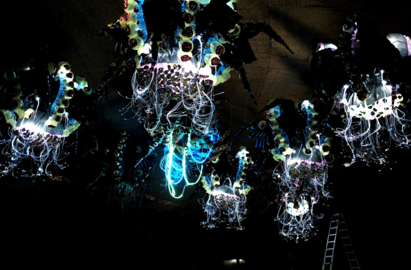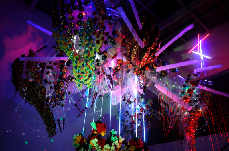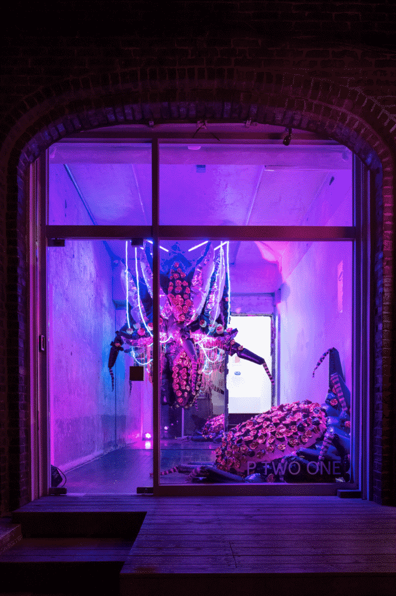 P21은 2019년 2월 27일부터 3월 31일까지 이병찬의 개인전 <흰 코끼리>를 개최한다. 이병찬 작가는 현대사회 생산과 소비 시스템을 비판하는 입장을 견지하며 그 속에서 조성되는 기이한 생태계를 비틀어 보여준다. 도시화된 환경 속에서 무한히 부산(副産)되고 폐기되는 비닐봉지를 주요 매체로 삼으며 자신의 판타지를 더해 변종의 피조물을 만들어오고 있는 작가는, 이번 전시에서 새로운 설치와 조각을 선보이며 소비문화의 화려함에 맹목적으로 중독되어 ‘신성화 되지만 동시에 애물단지가 되어버린’ 존재를 끊임없이 생산하는 양태를 지적한다. 전시 제목 <흰 코끼리>는 문화/경제 용어에서 차용된 것으로, 이는 불교 문화권에서 신성하게 여겨지는 대상이지만 경제 용어로 사용될 경우 ‘유지를 위해 막대한 자본이 소요되나 실상은 무용한 존재’를 의미한다. 이병찬은 오늘날의 소비 생태계가 이처럼 어긋나는 두 가지의 중의적 상황에 처해있다는 생각으로, 휘황찬란하지만 폐기를 전제하는 조악하고 거대한 설치와 공산품의 생산 과정을 역으로 모방하여 만들어진 조각을 전시장에 옮겨놓는다. 전면이 유리로 되어있는 P21 전시장은 사람들을 현혹하기 위해 화려함으로 점철된 매장의 쇼윈도와 구분이 모호해지고, 보는 이의 눈을 사로잡고 이성을 마비시킨다. 하릴없이 부풀어졌다 사그라들기를 반복하는 비닐봉지는 오색의 비단 헝겊 조각이 서낭나무에 매어져 나풀거리는 모습과 결합되며, 도시 전체가 소비라는 신을 맹목적으로 모시는 신당과 다름 없음을 드러낸다. 그러나 이 신성한 비닐봉지 생명체는 진정한 생명력을 소유하지 못한 채, 공기로 채워진 몸을 가지고 허무하게 반짝이는 껍데기일 뿐이다. 자본의 힘이 무한대로 확장된 현사회에서는 상품 뿐 아니라 인간도 다양한 껍질로 스스로를 치장하고 과시한다. 작가는 일회용 라이터로 용접된 연약한 비닐 덩어리와 자극적인 원색으로 빛나는 LED 조명들을 혼합하며 이러한 알맹이 없는 사치스러움을 강조한다. 설치 작업과 함께 이번 전시에서는 3D 프린팅 조각을 새롭게 선보인다. 작가 본인이 만든 비닐봉지 생명체의 형태를 본 따 설계되고, 기계화된 생산 과정과 유사한 출력과 도색의 단계를 거쳐 단단하고 고운 표면을 갖게 된 조각은, 아직 완전한 작품이 되지 못한 부분품들이다. 이는 그가 지금까지 이어온 소비 생태계에 대한 연구를 확장시키려는 시도의 시작 단계를 보여주는 것으로 예술가로서의 창작, 공산품의 생산 그리고 소비의 행위가 혼재된 오늘날의 환경에 주목한다. 작가는 긴 시간 공들여 자신의 작업을 흰 코끼리와 같은 처지에 위치시키며 생산이라는 행위마저 소비하게 되어버린 기형적 현태를 비판하고, 그 안에서 예술가가 작품을 만들어낸다는 것의 의미에 대하여 자성적 질문을 던진다.