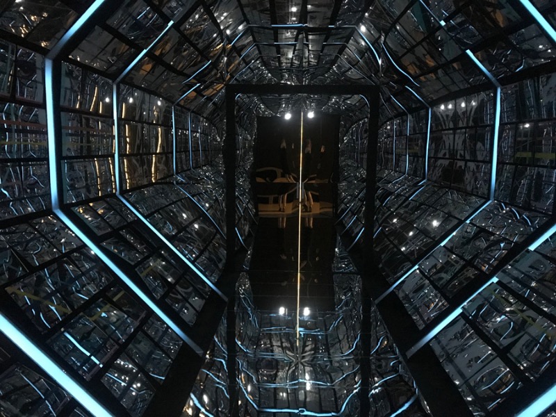 이번 전시에서 소개하는 <프라운스페이스(터널 버전)>(2019)는 온라인과 오프라인, 디지털과 아날로그처럼 대비되는 두 세상을 하나로 느끼며 살아가는 우리의 일상을 비춘다. 이 작품은 스탠리큐브릭(1928~1999)의 영화 ‘2001 스페이스 오디세이(1968)’에서 모티브를 얻어 기획된 <프라운스페이스> 시리즈의 두 번째 작품이다. 작가는 밀폐된 방 안의 모든 면에 설치된 거울패널 위에 쪼개진 도시의 모습을 교차시키고 그 위에 새로운 이미지를 계속 겹겹이 덧입혔다. 관람객은 일상적인 공간에서 이 방으로 진입하면서 반전을 느끼고, 무중력 공간에 그림 조각들이 펼쳐지는 환영을 경험할 수 있다. 이를 통해, 작가는 평면의 한계를 넘어서 눈에 보이는 공간이 아닌 그 너머를 보여주고자 한다.