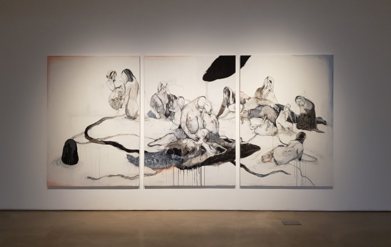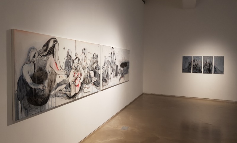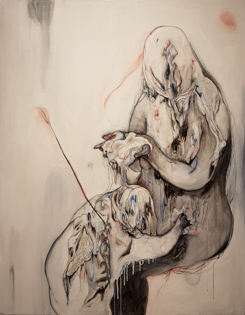 I wanted to show you the experience of exposing the pain with tangled hair and clumped flesh, sharing that feeling of pain, different individuals, different diversity. We look back on our lives through characters emblazoned with various memories.