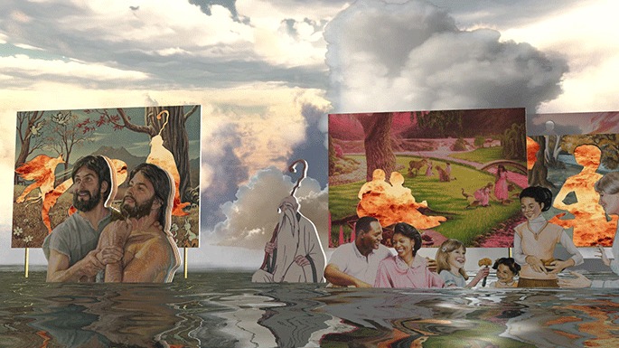 「나는 너를 지킨다」는 일본의 애니메이션 장면과 전 세계에서 벌어진 각종 사건·사고들을 조합한 파운드 푸티지 영상이다. 애니메이션 영웅의 다짐을 들려주는 내레이션은 위기의 상황을 보여주는 영상과 부조화를 이루며 무력화된다. 「스타 게이징」은 NASA가 제공하는 행성 자료를 바탕으로 제작한 영상이다. 편집과정에서 오류가 난 영상같기도 하지만 동시에, 심장이 뛰는 디지털 생명체 혹은 행성의 폭발 직전 모습과도 같은 생명력을 연상시킨다. 메시아적 콘텐츠의 대중문화에서 위기나 재앙이 유희적 콘텐츠로 소비되는 것에 대해 비판적으로 바라본 작가는 재패니메이션에서 주인공과 세계의 위기를 다루는 '세카이계(セカイ系)' 문법이나 시각적 구조를 차용하여 우리가 직면한 실재하는 위기들과 불완전한 세계에 대한 감각을 일깨운다. ■ 경기도미술관