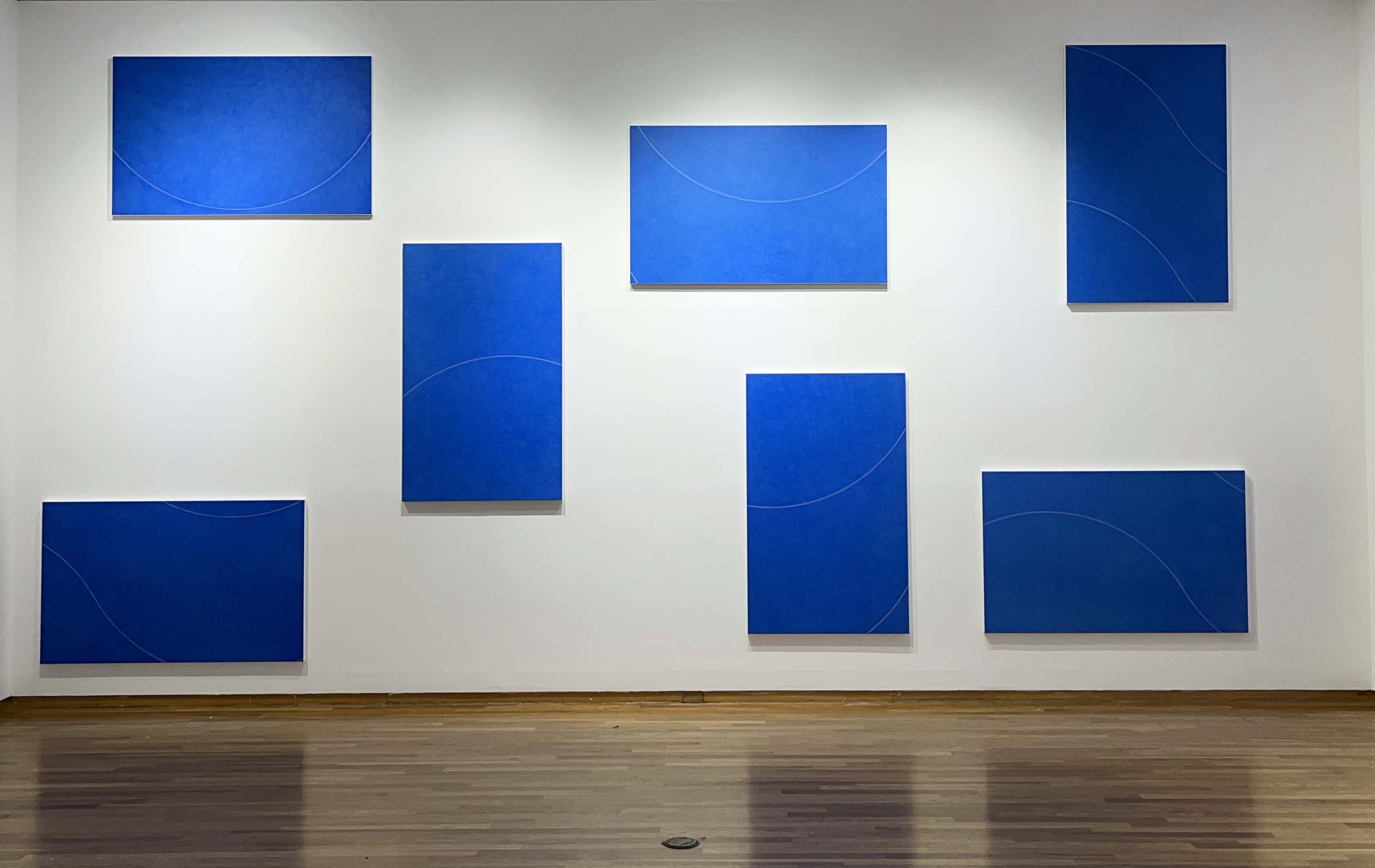 이번 전시 《무게의 궤도 Beyond the Line》에서 작가는 동일한 패턴을 공유하는 작품 총 30점으로 구성된 ‘Curve'를 유기적으로 배치하여 하나의 공간을 구성했다. 캔버스라는 제한된 프레임 안에 등장하는 곡선들은 하나의 패턴을 공유하며 변주와 반복적인 무한의 관념적인 공간을 만들어 낸다. 이 패턴은 원의 지름에 따라 4등분해 양 끝 부분을 이어 만든 것으로 파동 또는 흐름의 이미지를 연상케 하며, 예측 가능한 방식으로 되풀이되고 특별한 경계나 제약 없이 무한대로 확장해 나갈 수 있다. 각각의 작품이 독립적인 특성을 지니고 있지만 패턴의 질서와 규칙에 따라 정해진 자리에 위치하며 모두가 함께 연대하는 성격을 드러낸다.