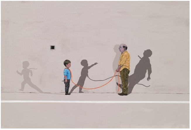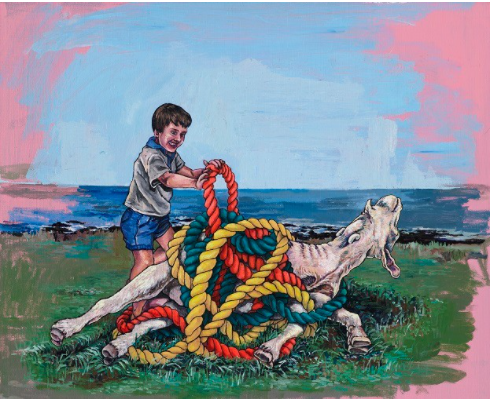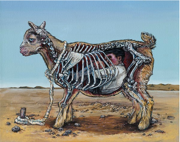 하지만 화면 안의 염소는 규격화된 하나의 도상처럼 보이지는 않는다. 고야와 고갱의 작품에서 보이는 것처럼 악마나 유령의 모습으로 공포감을 조성하지도 않고 위압적이거나 딱딱하고 건조한 분위기도 뿜어내지 않는다. 이는 미묘하게라도 인간에게서나 보일 법한 표정을 짓는 염소에게도 근거가 있겠지만 더 중요한 근거는 염소의 주변에 있는 아이들에게서 읽어낼 수가 있다. 쇠락하고 침잠하는 기운의 풍경이 경직된 시체처럼 고요하게만 박제되지 않은 이유를 그들에게서 찾을 수 있는 것이다.