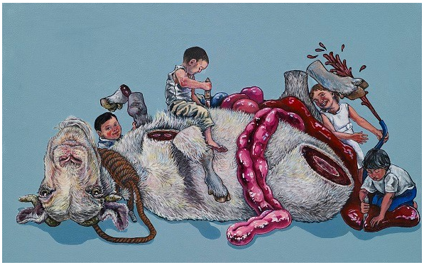 아이들은 순수하다. 순수하다는 것은 아담과 하와처럼 선과 악에 대한 개념이 정립되지 않았다는 것이기도 하다. 그렇기에 그들은 선악의 메타포를 통해 자유자재로 유희할 수 있다. 설다민이 표현하는 아이들은 데몬(Demon)이 친숙한 장난감이라도 된다는 듯이 줄로 얽고 잡아끌기도 하며 올라타서는 달리고 때때로 몸뚱이를 절단하고 도려내는 등의 잔혹한 짓을 벌이기도 한다. 하지만 이 잔혹할 수도 있는 광경은 홍조를 띠고 생동감에 그을려 건강하고 민첩해 보이는 아이들의 신체를 통해 놀이의 현장으로 탈바꿈된다. 또한 죽음에 대해서 호기심을 가질 수 있는 인간의 순수성으로 은유된 그들을 통해서 죽음이 박제되는 풍경의 기록이 되기도 한다. 아이들의 시선은 거리낌 없다는 듯이 정면을 향하고 있는데 그 시선이 화면을 목도하는 관람자의 것과 마주치는 순간 관람자에 대한 응시로 전환되며 우리를 사건의 현장으로 유인한다. 나아가 우리는 유희의 대상으로서 도륙되고 떼 지어 정지해 있는 순간에도 끝까지 화면 너머에 초점을 맞추고 있는 염소가 자아내는 오묘한 섬뜩함에 매혹되어 충동을 느낌으로써 기꺼이 사건의 공범이 되기를 자처한다.
