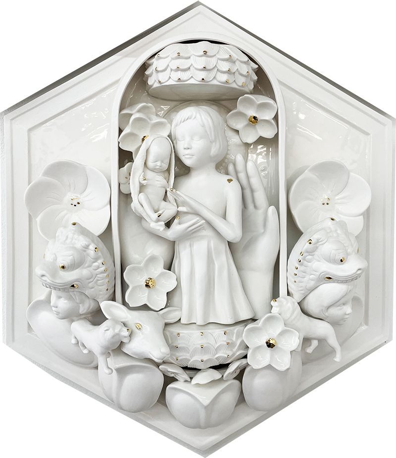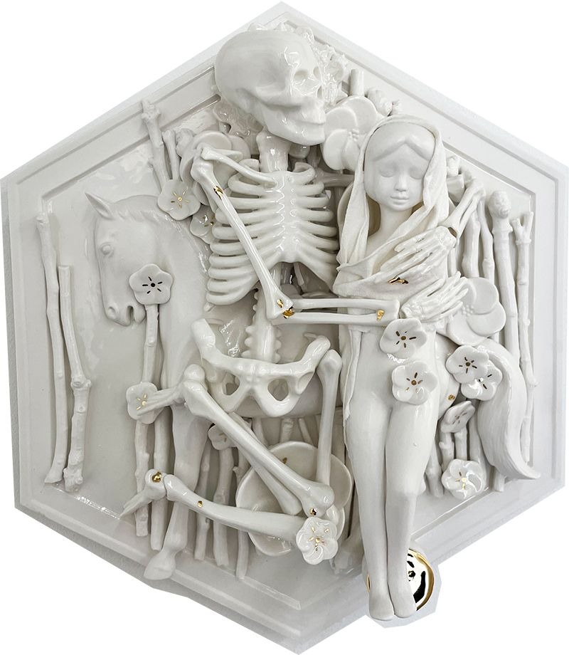 세라믹을 기반으로 한 이윤희의 작업은 그 자체로 이야기를 빚어내고 스스로 빛을 낸다. 백색의 매끈한 표면 위에 금빛으로 정교하게 그려낸 화려한 무늬가 특징적인 이 작업은, 생과 사를 상징하는 그로테스크한 도상을 빼곡하게 나열하고 조합하여 이윤희만의 독자적인 작품 세계를 형성한다. 도자기법 중 대량생산이 가능한 산업도자 기법인 주입성형방식과 정교하고 세밀한 장식적 묘사와 채색이 결합한 그의 작업은 장면마다 언어화된 혼종 이미지가 이야기를 형상화한다. <피안의 밤>(2017), <La divina commedia-신곡>(2014) 등은 그가 긴 호흡으로 집약적인 노동과 수행의 과정을 거쳐 만들어낸 이야기들로, 소녀, 해골, 절단된 신체, 동식물 등의 이미지들을 프레임 안에 깊숙히 집어넣어 인류 역사에 침전된 욕망과 결핍, 삶과 죽음, 죄악과 성찰의 서사를 생산하고 있다. 따라서 이윤희의 작업은 입체와 부조의 형태를 띠고 있음에도 프레임 안으로 깊숙하게 자신의 서사를 압축시킨 것이다. 그리고 관객이 마주하는 그 순간, 세라믹 위에 새겨진 이야기들을 펼쳐놓는 납작하고도 깊은 조각들은, 종교화나 역사화에서 느낄법한 비장함과 숭고미를 떠오르게 한다.