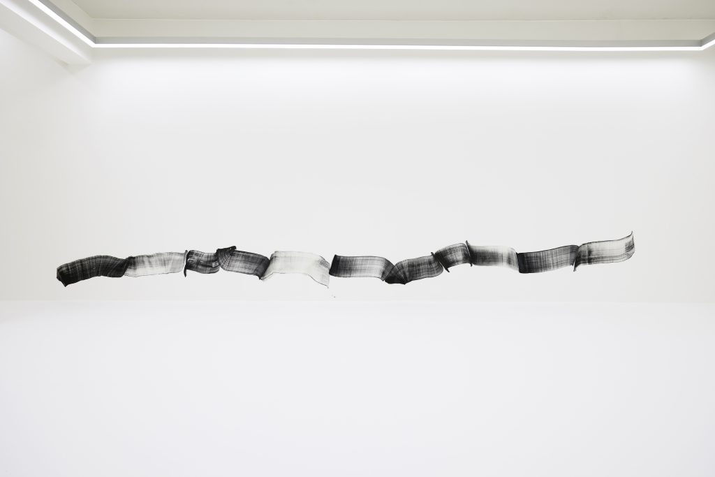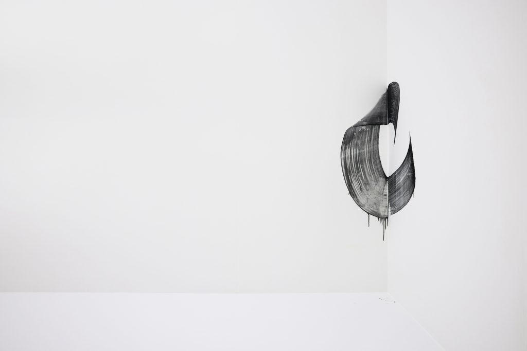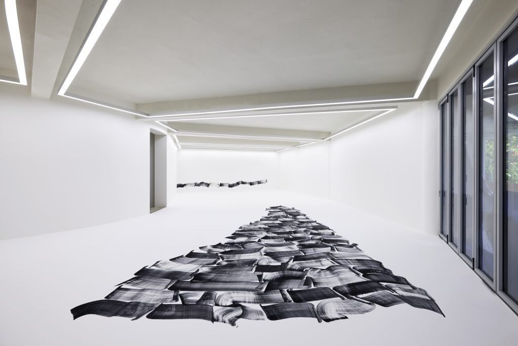 이번 전시에서 작가는 조현화랑 공간에 맞는 ‘회화-인스톨레이션’을 적극 시도하였다. 달맞이 전시장 1층 공간 자체가 캔버스인 것처럼 벽과 바닥을 종이로 씌어서 그림 공간을 설정했다는 점에서 이전의 전시들과 차별화된다. 관람객은 그림의 무대인 종이 위에 올라 작품의 일부가 될 수 있으며, 전시장 환경의 섬세함을 온몸으로 느낄 수 있다. 달맞이 2층에 설치된 작품 〈불로부터(Issu du feu white line)〉는 검정 숯으로 화면을 만들고 그 위에 오일 파스텔을 활용하여 흰 선들을 그렸다. 나뭇결이 그대로 드러나는 메마르고, 부서지기 쉬운 숯 조각을 깎고 붙여 평면적으로 조합한 표면 위에 흰색의 드로잉 라인을 더했다. “숯은 나에게 있어 변하지 않는 바탕이 되고 나의 감성은 손을 빌려 선을 새긴다”는 작가의 말을 해석하면 숯의 물질성과 흰 선의 드로잉이 만나 흑과 백, 그리고 선과 여백의 관계성에서 음과 양, 밝음과 어둠, 존재와 부재의 개념이 공존함을 이야기 한다. 또한 작가는 바닷가와 맞닿아 있는 조현화랑이 갖는 특성을 생각하면서 공간 자체를 하나의 화면으로 해석하였고 부산 밤바다에 비가 내리는 풍경을 연상하였다.