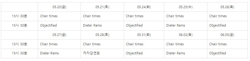 영화 예약 : https://booking.naver.com/booking/12/bizes/421288/items/4419152 장소 : KCDF갤러리 지하 1층 - KCDF자료실에서는 2022 공예주간을 맞이하여 <의자로 읽는 디자인> 전시를 개최합니다. 공예주간 슬로건 '우리집으로 가자' 에 맞추어 가장 사적이면서 실내 생활에 밀접한 가구인 의자를 주제로, 관련 도서들과 디자인 의자 17점을 함께 전시하여 의자의 디자인적 의미와 가치에 대한 이해를 높이도록 하였으며, 직접 디자인 의자에 앉아 체험해 볼 수 있는 기회를 제공합니다. 5월 28일에는 '의자의 세계', '의자의 재발견' 등의 저서를 집필한 김상규 교수(서울과학기술대학교 산업디자인전공) 의 전문가 강연도 개최될 예정입니다. 또한 전시 기간 내에는 관련 디자인 영화들이 상영됩니다. 특히 세계적 가구 브랜드 Vitra사의 협력으로 의자의 역사를 조명하는 다큐멘터리 'Chair times: a history of seating - from 1800 to today'가 국내 최초로 한국어로 상영되며 그 외 디자인 영화들이 함께 상영될 예정입니다. 우리의 일상에 밀접한 가구인 의자에 대한 도서, 영상 등 다양한 자료를 통하여 디자인의 흐름과 삶에 미치는 영향을 살펴볼 수 있는 유익한 시간이 되시기를 바랍니다. (출처 = KCDF 갤러리(한국공예·디자인문화진흥원))