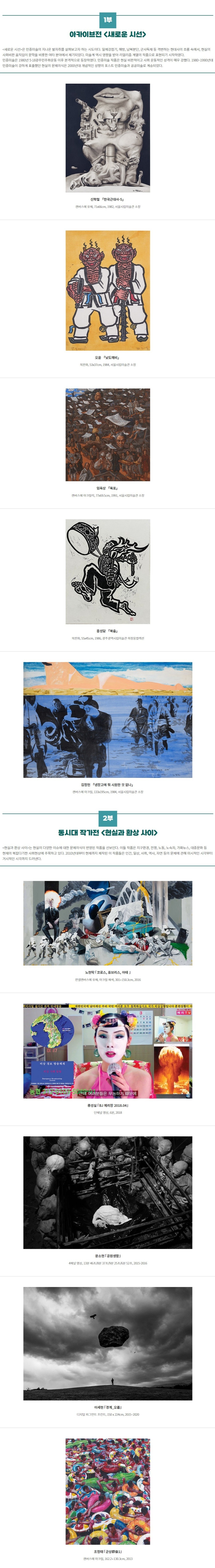 <다면체 미로 속의 진동>은 1980년 5.18광주민주화운동 이후 지금까지 한국 민중미술의 흐름과 현재적 의미를 살펴보고, 미래의 방향성을 모색하려는 시도이다. (출처 = 국립아시아문화전당)