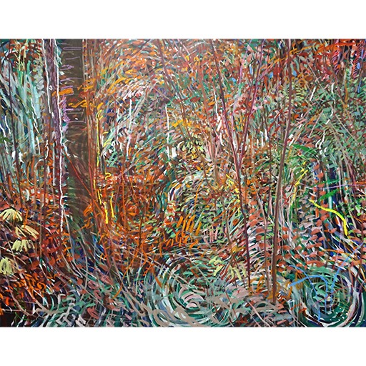 최근에 진행하고 있는 풍경화들은 마치 그가 키우는 식물들처럼 다양한 양상을 보여주었다. 먼발치에서 바라보는 풍경은 지금껏 묘사해온 방법으로는 그 감각을 담기 힘들었을 것이다. 개별화된 모양으로 드러났던 대상들은 이제 화면 전체를 채우며 꿈틀거리는 색감의 움직임 속 으로 흡수되었다. 어떤 캔버스는 번져나가는 색채를 주 배경으로 삼았고, 어떤 캔버스는 얇고 긴 붓 터치를 반복적으로 그려나가며 화면을 점유해갔다. 또 어떤 캔버스는 나뭇가지들의 자 유분방한 뻗침에 조응하며 선의 불규칙한 패턴을 이어나갔다. 혹은 화려한 색감이 흩뿌려지듯 꽃의 만개가 가득한 화면을 만들어내기도 했다. 이번 전시 “검은 숲”이 박이도에게 중요해 보 이는 것은 이처럼 기존의 작업 형식으로부터 벗어나 많은 것들을 변화시키고자 하는 태도가 드러나기 때문이다. 하나의 대상을 집요하게 들여다 보아왔던 묘사의 대상은 이제 꽤 먼 거리 에 위치한다. 작가와 대상 간 크게 벌어진 거리의 변화는 화면 속에서 그 대상이 조화롭게 섞 이거나 스며들고, 엉켜가면서 표현되었다.