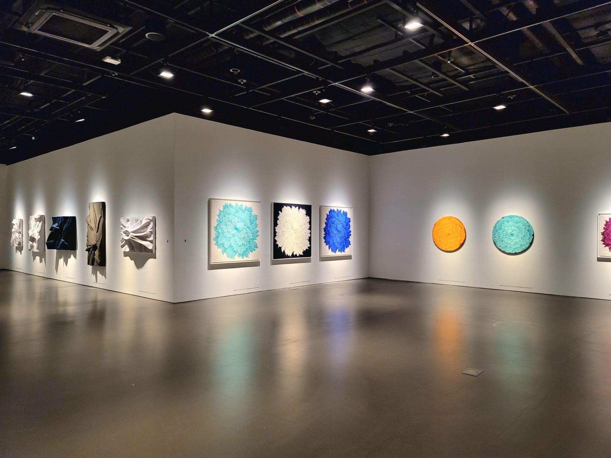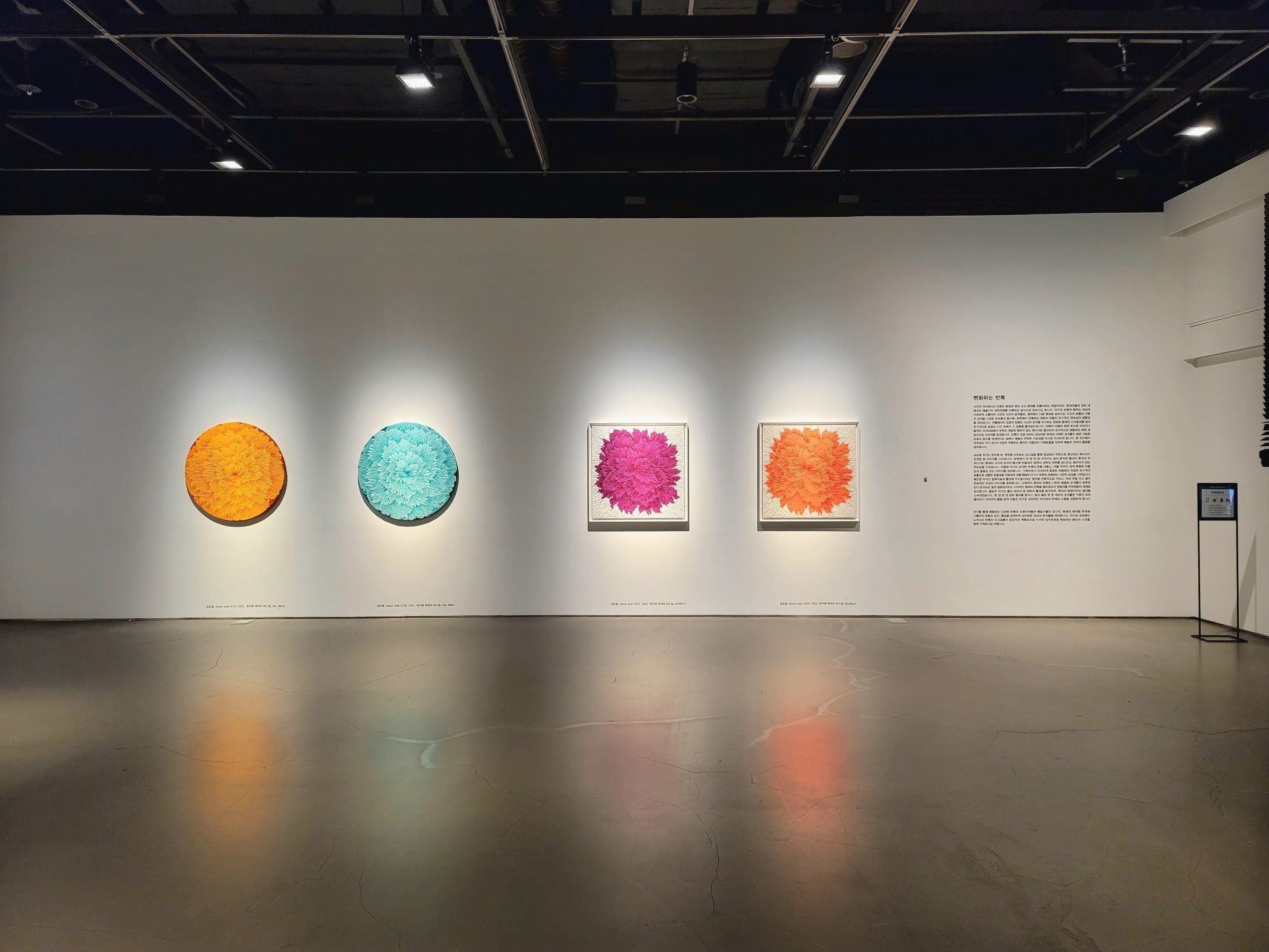 김순철 작가는 한지에 앞·뒷면을 아우르는 바느질을 통해 중심에서 주변으로 확산되는 에너지가 만개한 꽃 이미지를 그려냅니다. 화면에서 한 땀 한 땀 이어지는 실의 흔적은 물성의 촉각과 퍼져나가는 동세의 시각적 감각이 동시에 전달되어 화면의 내부와 외부를 넘나드는 관계의 망이라는, 끊어지지 않는 연속성을 드러냅니다. 이는 과거와 미래가 순환하는 자연성과도 맞닿아 있다고 할 수 있습니다.