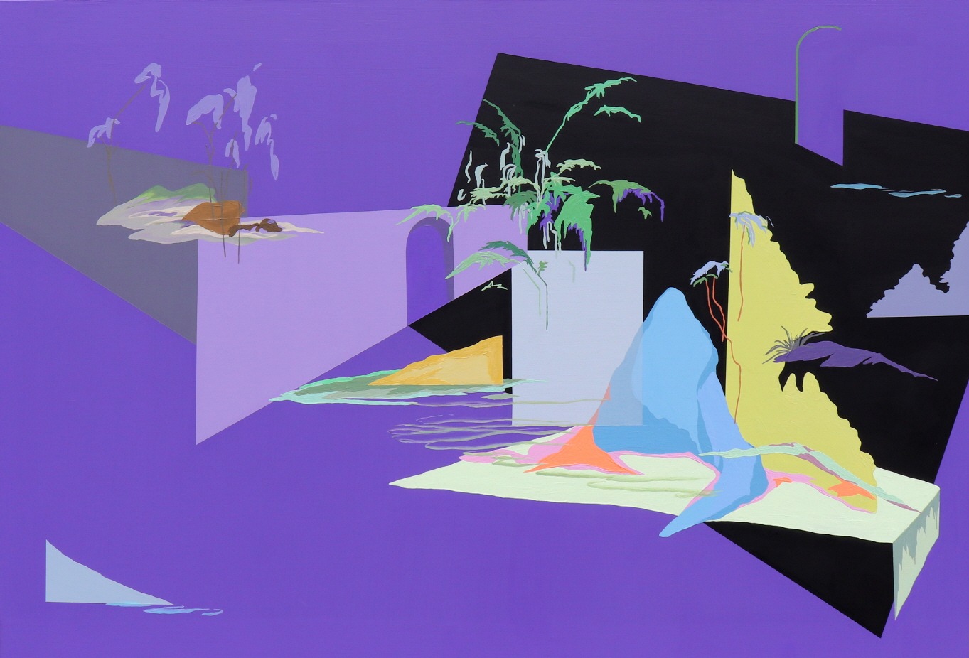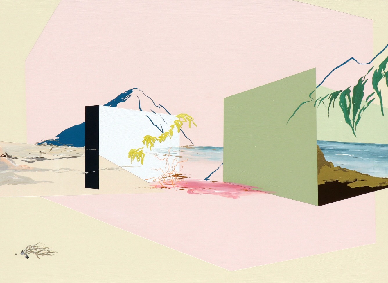 작가노트 1. 김명준, Kim Myeongjun 나는 불안 속에서 산다. 세상의 어떠한 것도 통제될 수 없는 세상이 올까 봐, 최소한 나 스스로에게서 통제할 수 있는 부분은 얼마나 되는지에 관한 생각 때문이다. 작업은 여기에서 시작한다. 과거부터 흥미롭게 여겼던 일들, 예를 들면 수족관을 만들고 생태계를 구축했던 일, 잔디에 약을 치고 소나무의 모양을 철사로 잡아 만드는 과정들을 보는 것, 동물원의 동물을 보며 지배의 욕구를 느낀 것, 나에게 흥미롭게 다가오는 것들을 통해 내가 불안을 해소했던 것처럼 캔버스 안의 세상을 내가 정복하고 싶다는 갈망에서 말이다. 요즘 들어 나의 유튜브 알고리즘엔 도저히 통제되지 않는 전쟁, 환경오염과 이로 인한 재해에 관한 영상이 자주 올라온다. 이런 뉴스나 다큐멘터리, 시사 프로그램을 접했을 때 자연과 인류 서로를 정복의 대상으로 생각하고 공존의 가치를 무시하며 살아온 대가를 에어컨이 틀어진 방구석에서 배달음식을 먹으며 마주하게 된다. 더욱 불안과 가까워진다. 작품 속 재난들은 멀리서 바라보면 폭죽놀이처럼 아름다워 보일지 모른다. 내가 방구석에서 단순히 재미를 위해 동영상을 시청하며 타인의 고통을 바라보는 것과 같다. 이처럼 우리는 안전한 장소에 발을 딛고 있다고 생각하는 것 같다. 좋은 의미로든 나쁜 의미로든 세상은 변화의 중심에 있다. 나의 작품 속 재난들은 멀리서 바라보면 폭죽놀이처럼 아름다워 보일지 모른다. 내가 방구석에서 단순히 재미를 위해 동영상을 시청하며 타인의 고통을 바라보는 것과 같다. 이처럼 우리는 안전한 장소에 발을 딛고 있다고 생각하는 것 같다. 하지만 역설적이게도 나는 관람자들이 캔버스 안 구축된 사건을 아름답게만 바라보지 않고 직면하고 있다는 상상을 하길 바란다. 풍경을 산책하며 그저 바라보는 것이 아닌 이미 사건 안에 있으며 통제할 수 없는 힘을 느끼길 원한다. 이미지를 마음대로 정제하고 그것을 다시 자유롭게 배치하는 통제의 과정은 나 자신도 사건들을 촉발하는 것에 일조하였다는 죄책감을 희석해 주는 돌파구가 되는 듯하다. 동시대를 진단하는 일에 있어서 예술가들은, 적어도 나에게 있어서는 세상을 혁명할 수 있는 큰 힘이 있다는 생각을 하지는 않는다. 그렇지만 나의 작업 행위 하나하나로부터 출발해 세상이 아주 조금씩은 바뀌고 있을 수 있다는 생각도 든다. 작업을 한다는 것은 스스로를 통제하는 일에서부터 출발하기 때문이다. 2. 정유빈, Jeong Yoobin 어릴 적부터 느껴온 사적 공간에 대한 결핍은 작업을 해나가면서 자연스럽게 공간에 대한 관심으로 집중되었다. 나만의 공간을 소유하고픈 욕구는 작업을 하는데 중요한 모티브가 되었다. 화폭 위에 공간을 자유자재로 분할하고 변화시키는 작업을 통해 공간에 대한 소유욕이 충족되는 대리만족을 느꼈다. 지극히 사적인 공간에 대한 관심 또는 소유욕은 작업과정에서 자연스럽게 확장된 실외와 자연의 영역으로 넓히게 되었다. 그중에서도 이쪽과 저쪽을 확연히 구분 짓는 벽이 아닌, 안과 밖을 연결하는 창문 프레임으로 이루어지는 세계에 더 많은 관심과 기대를 갖게 되었다. 더불어 프레임 밖으로 겹겹이 중첩된 풍경은 화면구성에 중요한 단초를 제공하고 있다. 화면 위의 건축물과 자연은 프레임 또는 구조적으로 단순화된 면으로 배열된다. 중첩된 프레임과 면으로 이루어진 화면 위에 공간은 안과 밖의 경계가 모호하디. 이렇게 화면에 재구성된 공간은 확산되거나 축소되기도 하여 낯익지만 낯선 공간으로 나타나는데, 그것은 차원이 다른 질서로의 도약을 기대케 한다. 화면을 자유로이 넘나드는 선들은 무한한 공간으로의 연결점이자 유동적인 의식의 흐름을 반영한다. 그 선들 사이에 유영하듯 배치된 형상들은 화면에 새로운 질서를 만든다. 이를 통해 보는 이에게 낯익기도 하지만 동시에 묘하고도 낯선 것으로 다가간다. 대상의 해체와 재구성 그리고 왜곡된 형태를 통해 비일상적인 의식의 흐름과 같은 시간성을 엿볼 수 있을 것이다. 또한 형태의 반복으로 이루어진 공간은 잠재된 가상의 세계를 암시한다. 주위를 둘러싸고 있는 수많은 건축물에 의해 가려진 자연 풍경처럼 익숙함에 미처 발견하지 못하고 지나쳤던 것들을 수집한다. 기억을 통해 수집된 이미지의 기록은 시간의 흐름에 따라 왜곡되고, 변형되어 머릿속을 유영하듯 떠다닌다. 처음 발견했을 때의 형태와 색감은 중요하지 않다. 익숙한 장소에서 당연시했던 것으로부터 특별하게 촉발된 낯설고 새로운 느낌의 이미지를 작업으로 옮기고자 한다. 일상 속에서 너무나 당연하다고 생각하고 지나쳤던 대상이 불현듯 낯설게 다가온다. 계절이 지나면서 가지만 앙상히 남은 나무, 갈라지고 벗겨진 나무껍질의 형태와 색, 빗물 고인 웅덩이, 덩그러니 떠 있던 구름 조각, 건물 틈 사이로 우뚝 솟아있는 산의 형태와 차도 위에 그어놓은 곡선, 건물마다 포인트로 칠해진 색 면까지 식상하고 하찮아 보였던 일상에 대한 새로운 발견은 비일상적 세계를 엿보는 틈이자 통로라는 생각이다. J.K.롤링이 쓴 ‘해리포터’에서 해리가 호그와트 마법학교에 가기 위