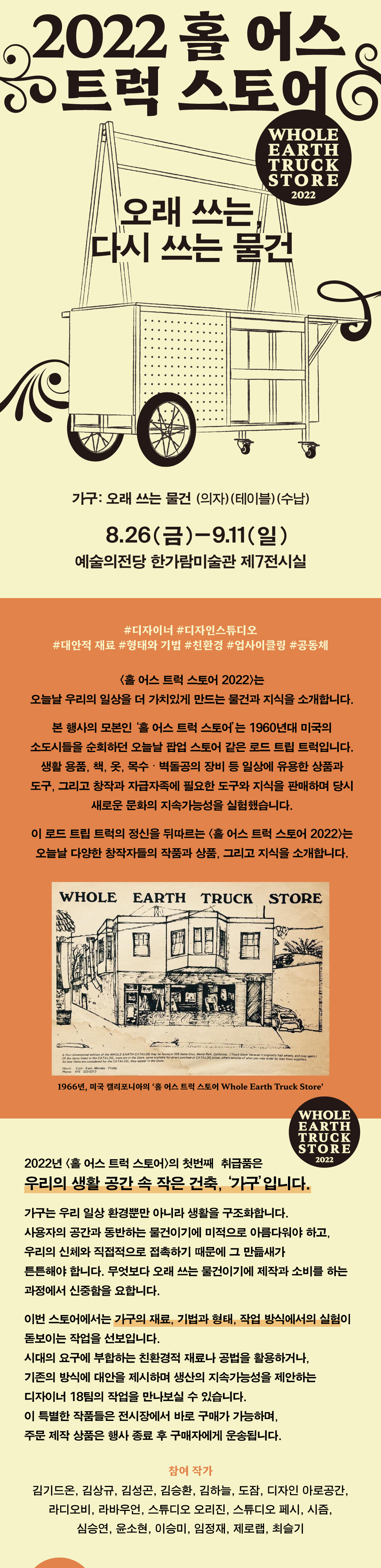 • 			《홀 어스 트럭 스토어 2022(Whole Earth Truck Store 2022)》는 오늘날 우리의 일상을 더 가치있게 만드는 물건과 지식을 소개합니다. 본 행사의 모본인 ‘홀 어스 트럭 스토어’는 1960년대 미국의 소도시들을 순회하던 오늘날 팝업 스토어 같은 로드 트립 트럭입니다. 생활 용품, 책, 옷, 목수∙벽돌공의 장비 등 일상에 유용한 상품과 도구, 그리고 창작과 자급자족에 필요한 도구와 지식을 판매하며 당시 새로운 문화의 지속가능성을 실험했습니다. 이 로드 트립 트럭의 정신을 뒤따르는 <홀 어스 트럭 스토어 2022>는 오늘날 다양한 창작자들의 작품과 상품, 그리고 지식을 소개합니다.