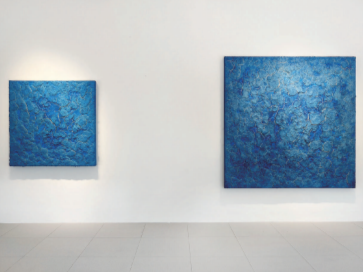 조현화랑은 질감과 색체 표현이 풍부한 대형 회화 작업을 주로 알려진 보스코 소디(Bosco Sodi, 1970년, 메시코시티) 작가의 개인전을 개최한다. 조현화랑에서 개최하는 소디 작가의 두 번째 개인전은 빛의 포착과 누출 사이를 스치는 듯한 대기광을 이용해 여태 탐구해온 자연 물성과 과정-집약적 심미성으로 회귀한다. 해운대 전시 공간에 설치된 소디의 혼합 매체 추상작은 동이 트키 직전 하늘이 머금은 푸르름을 떠오르게 한다. 새벽녘 고요가 약속하는 새로운 하루처럼 말이다. 작품 표면의 거칠음과 풍부한 질감은 평면 화면 위에 점토, 톱밥, 안료, 풀 등의 유기적인, 소재를 섞어 합착한 것으로, 그 창작조건의 흔적이 그대로 남아있다. 작품의 짙은 물성은 결국 재료와 작가의 막역한 관계, 작품 제작에 대한 몸의 ʻ수행’을 증거한다. 회화에 대한 그의 방법론은 기술보다 감각이다. 평면 화면 위에 혼합 점체를 분배하는 그의 손의 감각도 있겠지만 무엇보다 그의 주관적인 즉흥성의 차원이다. 그런 과정에서 발생하는 우연들, 실수와 불완전함도 그대로 수용하며 그의 심미적 표현력에 다양성과 설득력을 더한다. 보스코 소디는 자연의 엔트로피를 깊이 의식하는 작가다. 그의 작품세계는 시간과 세월의 흐름이 이루어내는 것을 탐구하며 결과적 형태에 집착하지 않는다. 작품의 형태는 결국 자연의 소재가 시간에 걸쳐 결정되기 때문이다. 그의 작품에 혼합 사용되는 흙과 점토도 원형적인 질감과 존재감을 더해주는 한 ʻ협력자’고, 본인의 몫을 다 한 작가가 물러나면 환경적 요인이 주체가 되어 시간을 통해 작품을 ʻ완성’한다. 온도, 습도, 기류 등이 요인이 되어 작품의 응고 및 경화가 이루어지며 작품 작가의 의지를 벗어나 표면에 점차 형성되는 균열의 깊이와 폭을 결정한다. <이른 아침, 어제>는 소디의 여태 작품과는 토양적 특색이 사뭇 다르다. 푸른 빛을 띄는 그의 근작들은 평면화면 앞에서 그림과 작가가 교환한 기의 흔적을 포착했다는 점에서 기존작과 같지만, 토지의 색이 아닌 창공의 색은 소디의 시선이 지평선 위로 넘어왔음을 암시한다. 작품의 선명한 푸른 빛은 해가 뜨기 직전 ʻ여명’의 시간(영미권에서는 이를 ʻblue hour’라 지칭한다)은 태양 광선이 오존층을 투과하는 입사각으로 인해 단파장 청색 빛이 산란되어 가시화되는 시간이다. 작가는 하루가 시작되기 직전, 박명의 일순간을 마주하며 자연과의 연결점을 찾고 시간의 흐름을 상기한다. 고로, 작가의 이번 개인전 제목은 그가 새벽녘 하늘에서 본 특정 남빛 음영에 대한 회고이자 그 빛과 고요 속에 작가의 마음속 잠잠하고 고요했던 마음챙김의 기억이다. (제공 = 조현화랑)