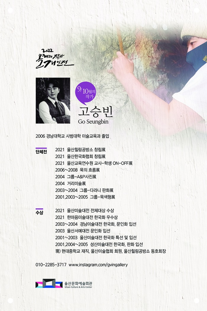 • 			울산문화예술회관(관장 김지태)이 우수한 지역작가를 발굴·지원하기 위해 마련한 ‘올해의 작가 (9~10월) 고승빈 전(展)’이 9월 1일부터 60일간 문화예술회관 상설전시장에서 열린다. 고승빈 작가는 경남대학교 사범대학 미술교육과를 졸업하고 지난 2021년 울산미술대전에서 대상을 수상했다. 뿐만 아니라, 2021년 한마음미술대전 한국화 부문에서 우수상을 수상하는 등 지역에서 활발하게 활동하고 있는 청년 작가이다.
