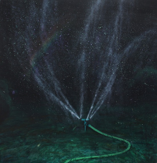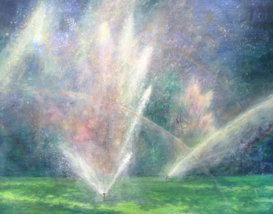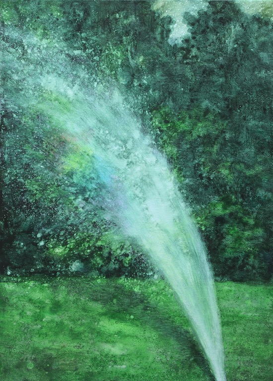 이번 전시에서는 물빛을 띄고 있는 대기를 주제로 대기와 분위기를 형성하는 물에 대한 작업들을 보여준다. 일상 속에서 분수를 관찰하며 물이 피어오르는 순간에 시원해지는 주변 온도를 느끼고 살갗에 촉촉히 닿는 물, 허공에서 반짝이는 빛과 옅은 무지개를 바라보며 물방울들을 가득 머금고 물빛을 발하고 있는 대기를 상상해보았다. ‘물빛’이라 하면 자연스레 푸른빛을 떠올리지만 투명성과 유동성을 가지고 주변 색을 반영하는 물은 수많은 색과 분위기로 연출될 수 있는 요소이다. 햇빛과 달빛 아래 분수, 스프링클러가 있는 숲과 공원, 햇빛과 물방울이 내려앉은 피부처럼 다양한 시간과 공간 속에서 반짝이는 물방울이 있는 상황과 풍경을 소재로 삼아 물과 빛으로 이루어진 대기를 화면 가득히 채워 나의 상상으로 빚어진 ‘물빛’을 띄고 있는 대기의 상태를 그림 속에 담아내고자 했다. 부드러운 물보라와 물방울이 뒤섞인 대기의 표현에 중점을 두고 색채의 분화와 번짐이 만들어내는 효과들을 내세워 찰나의 시간성을 켜켜이 부드럽게 쌓아가면서 순간의 감정들과 공기와 물의 움직임을 포착하고 안착하고자 했다. 대기와 그 속의 물은 투명하고 잡히지 않는 대상이지만 회화적 질료를 통해 화면 안에서 새로운 질감과 색감을 얻게 된다.