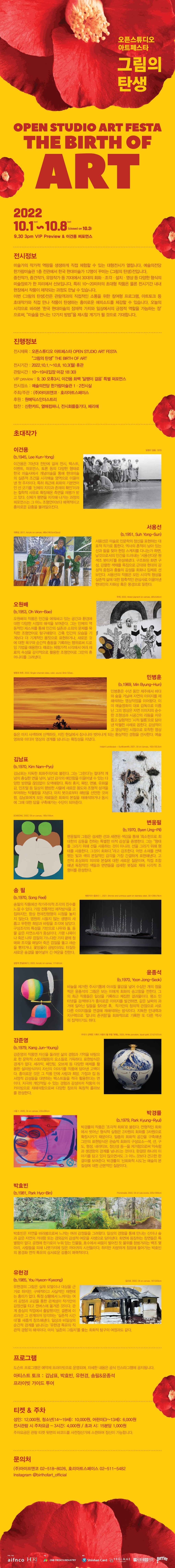 * 전시장소 : 예술의전당 한가람미술관 1ㆍ2전시실 * VIP preview : 9. 30 오후3시, 이건용 화백 ‘달팽이 걸음’ 특별 퍼포먼스 - 미술가의 작가적 역량을 생생하게 직접 체험할 수 있는 대형전시가 열립니다. 예술의전당 한가람미술관 1층 전관에서 한국 현대미술가 12명이 꾸미는 <그림의 탄생>전입니다. 중진작가, 중견작가, 유망작가 등 70대에서 30대의 회화ㆍ조각ㆍ설치ㆍ영상 등 다양한 형식의 미술장르가 한 자리에서 선보입니다. 특히 10~20미터의 초대형 작품은 물론 전시기간 내내 현장에서 작품이 제작되는 과정도 만날 수 있습니다. 이번 <그림의 탄생>전은 관람객과의 직접적인 소통을 위한 참여형 프로그램, 아트토크 등 초대작가와 직접 만나 작품이 탄생하는 흥미로운 에피소드를 체감할 수 있습니다. 오늘의 시각으로 바라본 ‘한국 현대미술의 잠재적 가치와 일상에서의 긍정적 역할을 가늠하는 장’으로써, “미술을 만나는 12가지 방법”을 제시할 계기가 될 것으로 기대합니다. 주최/주관 : (주)아이프앤코ㆍ호리아트스페이스 후원 : 원매딕스인더스트리 협찬 : 신한카드, 열매컴퍼니, 전시회를즐기다, 페리에 (출처 = 예술의 전당)