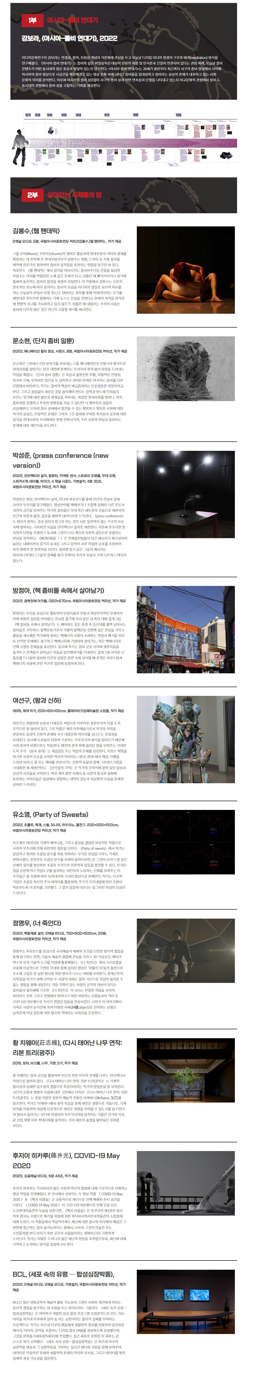 장소 : 문화창조원 복합전시 3관 및 복합전시 4관 - 동시대 아시아 주제 연구 기반의 기획전 ACC 콘텍스트 <좀비 주의>는 좀비의 상징성을 고찰한 전시이다. 20세기 초 서구 영화에 등장하기 시작한 좀비는 그 모습을 변모해가며 21세기 한국 영상문화의 주인공으로 등장한다. 시대와 국경을 초월하며 등장한 '오늘날의 괴물' 좀비는 어떻게 만들어졌을까. 이 질문에서 시작된 <좀비 주의>는 좀비를 대중문화 기획의 결과물을 넘어선, 한 시대가 품고 있는 시간성과 지역성을 흡수한 동시대의 상징으로 재해석한다. 1부 <아시아-좀비 연대기>는 20세기 초부터 최근까지 매체에 등장한 좀비물을 집대성하고, 이를 분석하여 시각화한다. 한국, 아시아, 서구의 대중문화에서 나타난 좀비의 다양한 양상을 한국사와 세계사에 등장했던 주요 사건들과 병치하여 좀비의 역사적 맥락에 대한 관람객의 이해를 돕고자한다. 또한 좀비가 우리 사회의 변화와 불안 그리고 고유문화를 반영하는 사회적 거울임을 조망한다. 2부 <살아 있는 시체들의 밤>에서는 한국, 일본, 대만에서 활동하는 현대미술가 10인/팀이 14점의 작품을 선보인다. 참여 작품들은 좀비라는 상징물을 다각적으로 표현하면서 우리가 직면하고 있는 생사, 욕망, 공포, 혼돈 등을 현대미술로 풀어낸다. ESG 실천의 일환으로 이전 전시공간의 가벽과 가구를 재활용하고 가벽 일부를 의도적으로 떼어내고 재조합해 디스토피아적 분위기를 연출한 것은 전시 공간 기획의 주목할 점이다. 이번 전시를 통해 시대를 은유하는 좀비의 가치를 재발견하고, 사회·문화적 상징으로서 좀비가 전달하는 지금 그리고 여기의 이야기를 나누는 기회로 삼고자 한다. (출처 = 국립아시아문화전당)