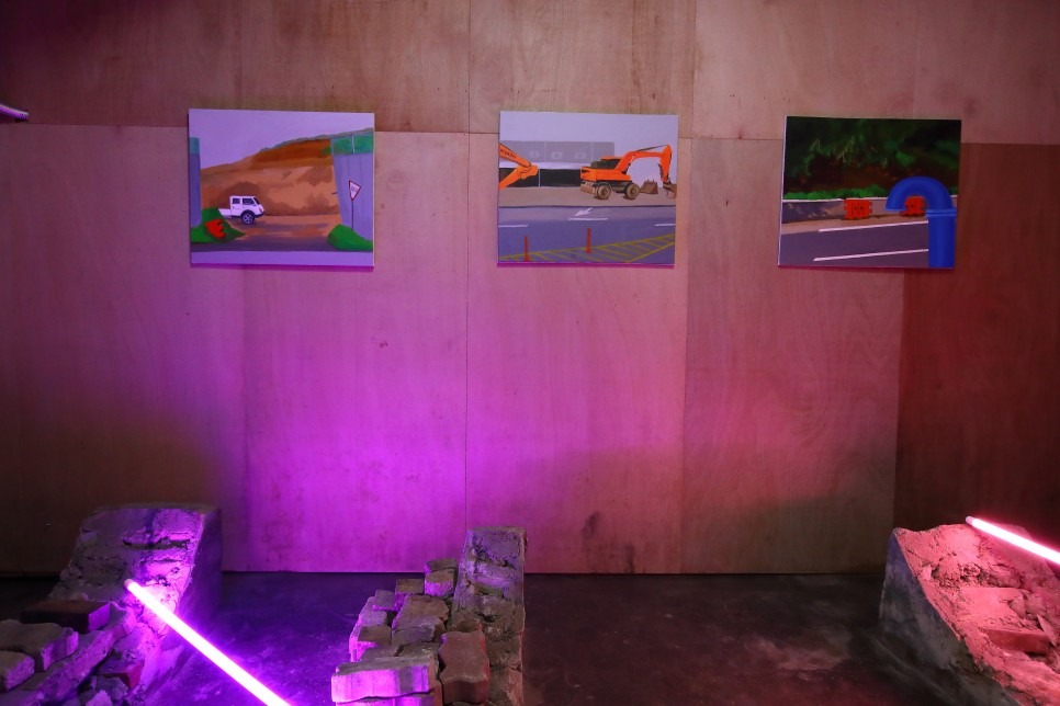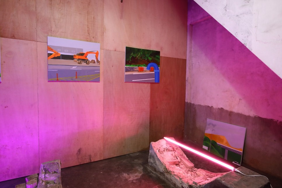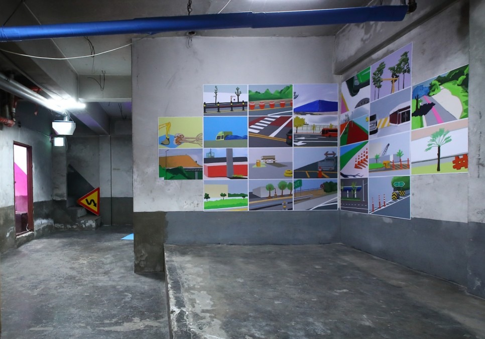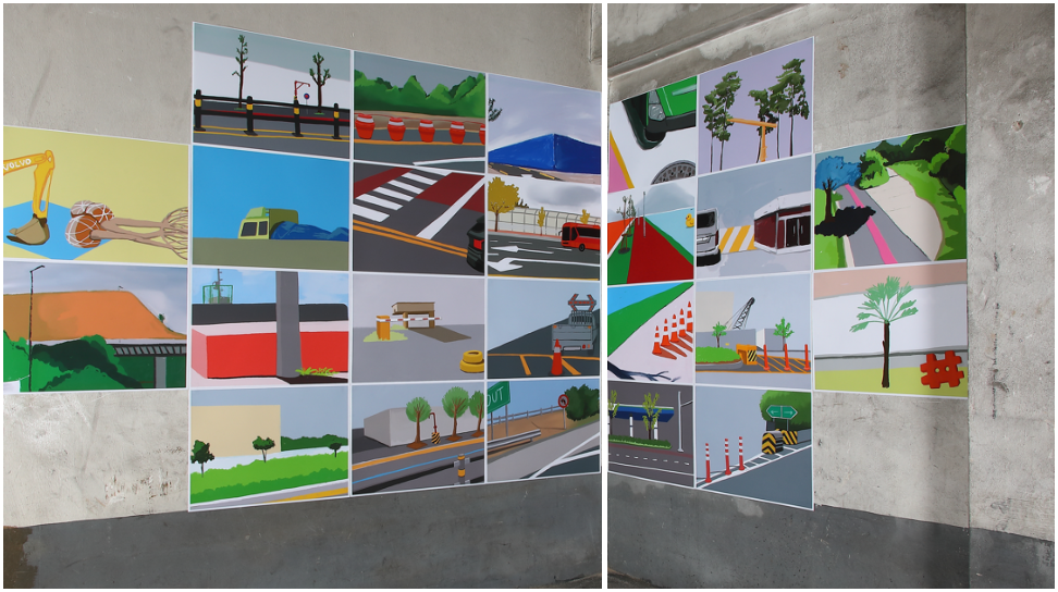 1 도로와 표지판, 건물의 공사현장과 같은 것들이 보인다. 한 가지 특이한 점은 사람이 아무도 없다는 것이다. 공허하고 외롭다. 지금 여기에 아무도 없다는 것은 살기에 적합할 곳이 아닐뿐더러 살아갈만한 여러 조건들이 없다는 것이다. 그래서 이 공간은 신뢰감이 들지 않는다. 썩 기분이 좋지 않은 꿈속의 공간, 마치 초현실주의의 그림처럼 건조하고 차갑고 딱딱한 느낌. 그렇지만 낯선 풍경은 아니다. 자동차를 타고 이동하면서 보게 되는 차창 밖 풍경들처럼 익숙한 장면의 연속이다. 생각해보면 그런 장면들은 [여기]에서 [거기]로 이동하는 동안에 어쩔 수 없이 지나치는 장소 같다. 말 그대로 풍경이라 할 수 있는 이미지를 프레임 안에 가두고 보니까 조금은 낯설게 느껴지는지도 모르겠다. 움직여야 마땅한 공간이 정지되어 있으니 권태로운 느낌마저 든다. 2 참 이상하다. 어찌됐든 이 전시의 제목은 <지극히 사적인 공간>이다. 그런데 그가 보여주는 이미지는 사적인 공간을 생각했을 때 쉽게 떠올릴 수 있는 장소들은 아니다. 그렇다면 ‘지극히 사적인 공간’이란 무엇일까? 어쩔 수 없이 가장 먼저 집을 떠올렸다. 누군가 나의 허락 없이는 들어올 수 없고 제도적인 보호를 받을 수 있는 물리적인 장소. 그 다음은 저장장치를 떠올렸다. 이를테면 핸드폰에 보관된 사진이나 메모 같은 것 말이다. 최근에 “내가 죽는 동시에 지금까지 사용했던 모든 저장장치가 폭파됐으면 좋겠다”는 생각을 하기도 했다. 내가 죽은 후에 누군가 집에 들어와서 본다고 해도 크게 상관이 없겠지만 내가 검색한 기록들이나 적어둔 글을 타인이 본다고 생각하면 조금 견디기가 어려울 것이다. 그렇기에 ‘가장 사적인 장소’는 어쩌면 경험이나 기억을 보관하고 있는 저장장치 같은 게 아닐까? 하지만 내가 바라보고 있는 화면이 어떤 방식으로든 나를 기록하고 있는 요즘, 실시간으로 모든 데이터가 저장되고 그게 어디로 흘러갈지 모르는 상황이라는 것을 생각하니 과연 사적인게 보존될 수 있을까하는 의구심이 들기도 한다. 3 이 전시에서 내가 주목한 것은 사적인 장소로 상정했던 ‘안’의 경계를 외부로 노출시킨다는 것이다. 그곳은 집이나 방처럼 물리적인 공간일 수도, 클라우드나 하드웨어 같은 장치일 수도, 우리의 감정이나 생각 같은 내면의 자리일지도 모르겠다. 확실한 것은 그의 이미지는 너무도 명백하게 ‘바깥’을 가리키고 있다는 것이다. 표지판이나 화살표처럼 무언가를 지시하는 것들은 분명 존재하지만 우리가 볼 수 있는 건 [여기]라는 프레임까지의 풍경이다. 제한적인 장면의 연속 가운데 표지판, 화살표 등이 가리키고 있는 지시 대상은 끝내 부재한다. 어쩌면 그것은 애석하게도 프레임 밖으로 미끄러져있는, 인식 바깥의 지연된 언어일지도 모르겠다. [저기] 글 모세 (작가제공)