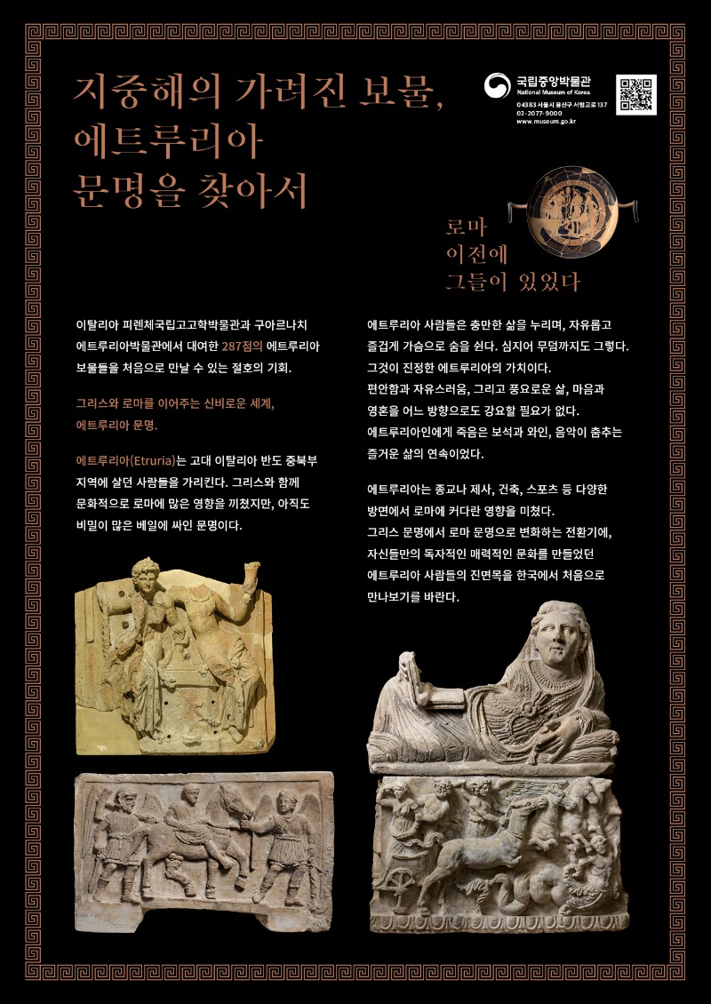 국립중앙박물관은 고대 지중해 문명의 한 축이었던 에트루리아의 역사와 문화를 소개하는 특별전 <로마 이전, 에트루리아>를 개최합니다. 에트루리아는 기원전 900년부터 기원전 100년경까지 이탈리아 반도 중북부 지역에 있던 고대 국가입니다. 에트루리아 사람들은 지중해에 살았던 모든 사람들 중에서 가장 매력적인 사람들로 평가되고 있습니다. 당시 역사가들은 에트루리아인들을 “다른 모든 사람들과 다른 태곳적 사람들”이라 여겼습니다. 베일에 싸인 그들의 기원과 언어, 종교는 에트루리아인들을 더욱 신비롭게 만들며, 오늘날에도 여전히 감탄과 매력을 자아냅니다. 로마 문화의 근간을 이루지만 아직 그 실체가 알려지지 않은 에트루리아. 이번 전시는 에트루리아의 문화를 살피며, 우리의 문화적 시야를 넓히고자 마련되었습니다. 국내에 처음으로 소개되는 약 300점의 전시품에는 에트루리아 사람들의 생활 모습과 세계관, 종교관, 사후 관념 등이 고스란히 담겨 있습니다. 2천여 년의 긴 잠에서 깨어나 우리 앞에 펼쳐진 에트루리아의 다양한 유물들은 죽어서도 현재의 삶이 이어지기를 바랐던 그들의 간절한 바람을 전합니다. 세련되고 신비로운 고대 유럽 문명의 하나로, 로마의 근간을 이룬 에트루리아. 이제 그 문명의 숨결을 함께 느껴보시기 바랍니다. 에트루리아사람들에게 죽음이란 여전히 보석과 와인, 그리고 춤을 추기 위한 연주용 피리가 있는 삶의 즐거운 연장이었다. 황홀한 축복, 천국도 아니었고, 고통의 연옥도 아니었다. 그저 풍요로운 삶의 자연스런 연장이었던 것이다. 모든 것을 생명, 삶이란 관점에서 본 것이다. And death, to Etruscans, was a pleasant continuance of life, with jewels and wine and flutes playing for the dance. It was neither an ecstasy of bliss, a heaven, nor purgatory of torment. It was just a natural continuance of the fulness of life. Everything was in terms of life, living. - D.H. 로렌스의 『에트루리아 유적 기행기』 중 -