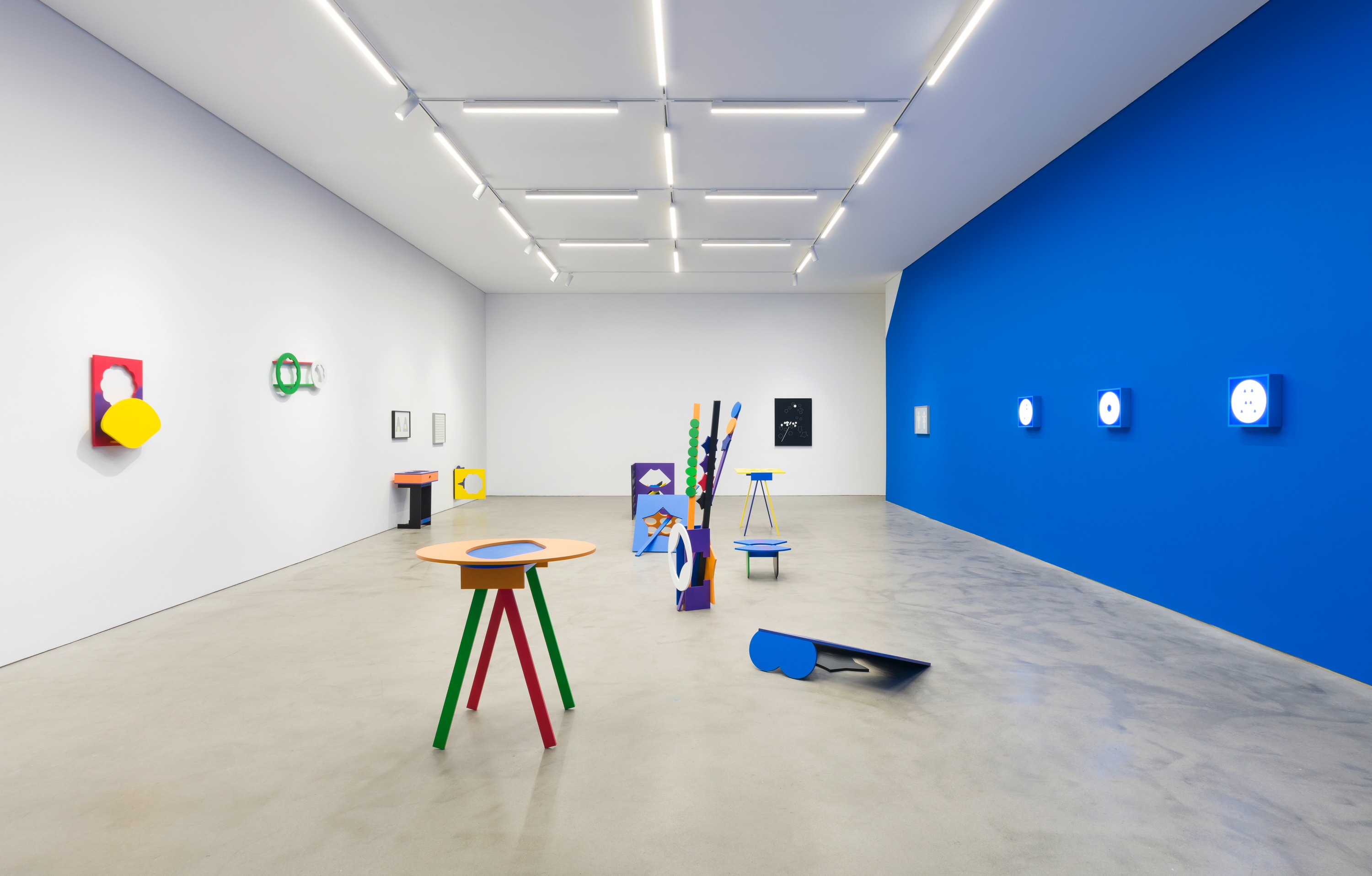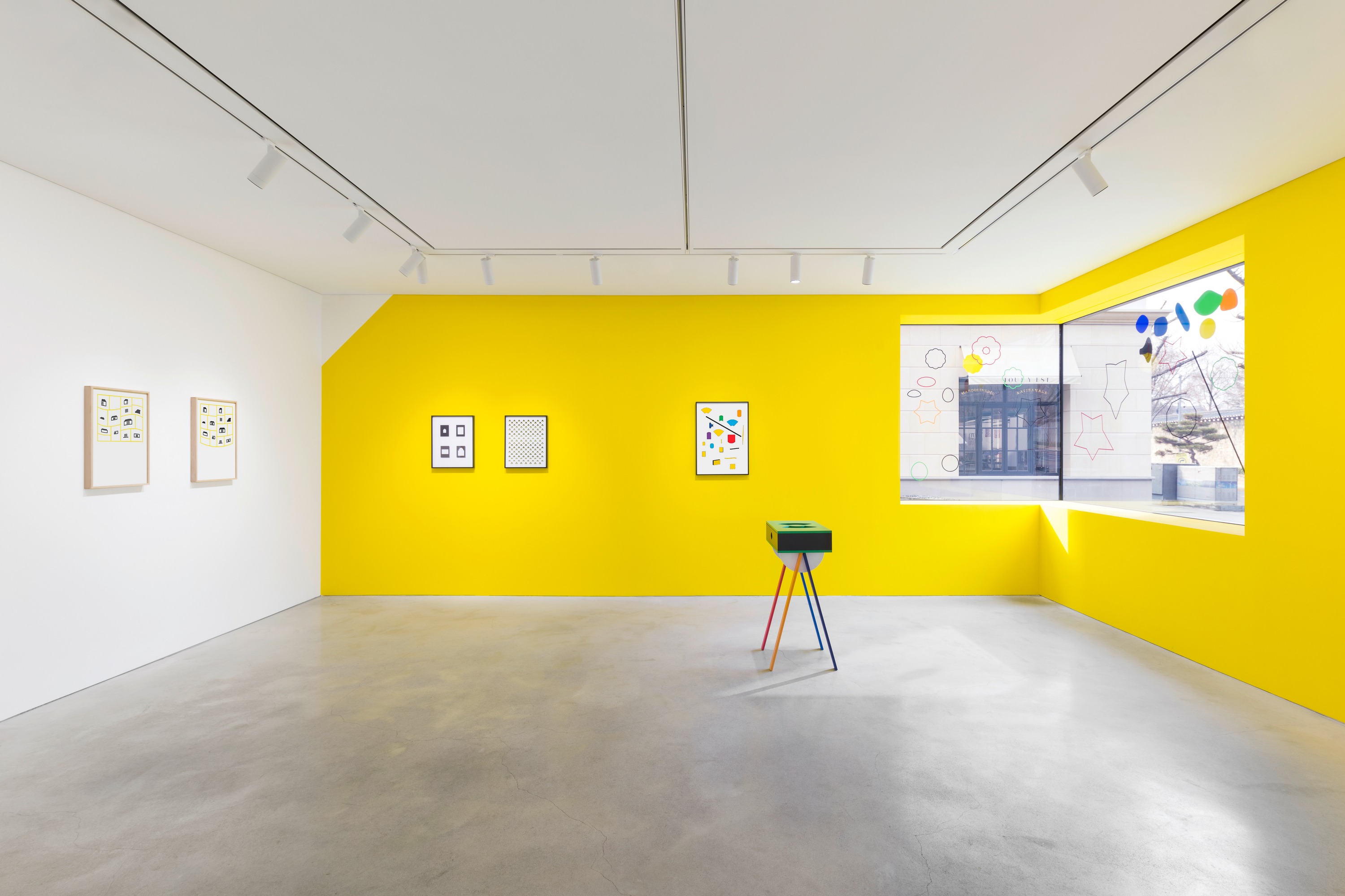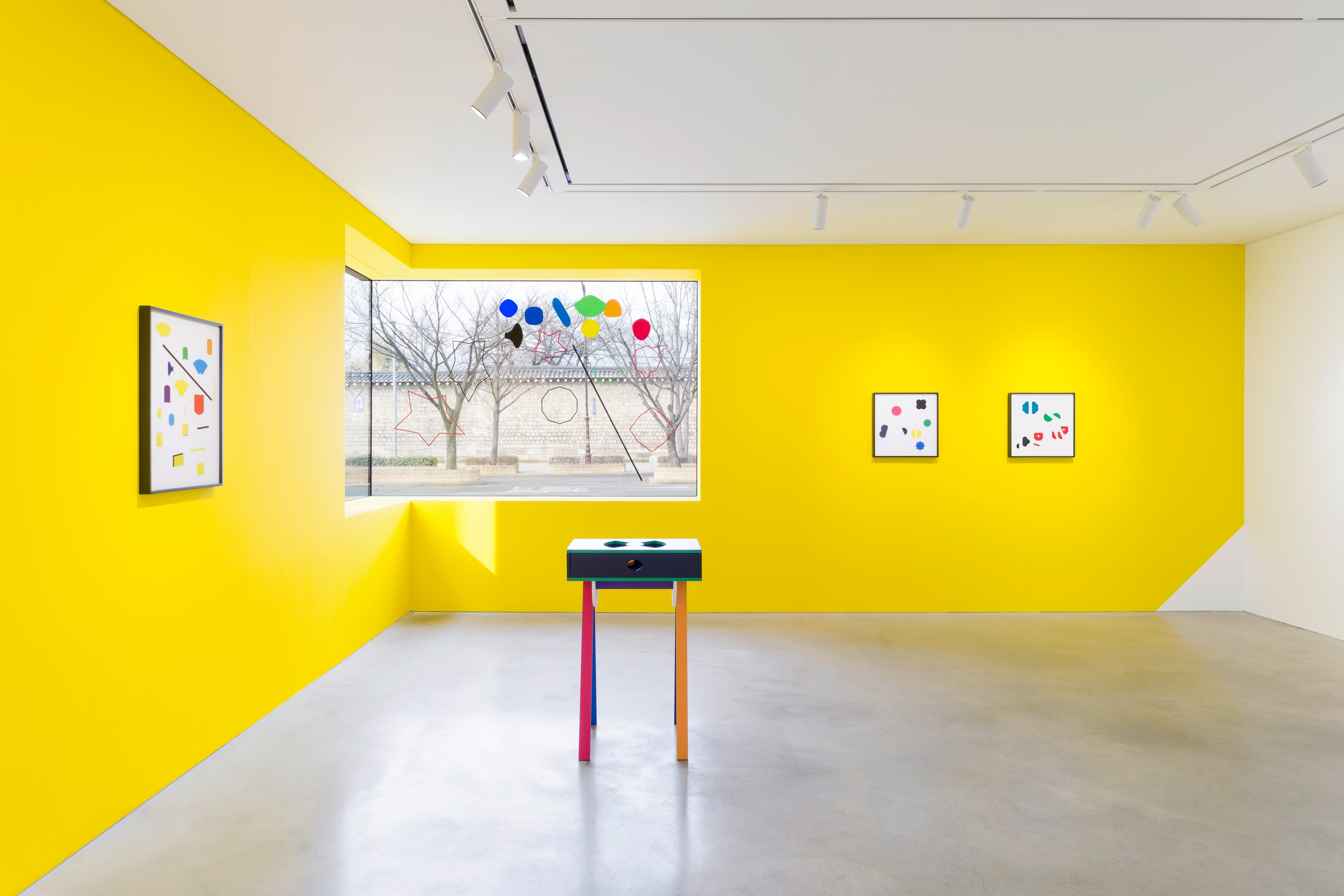 국제갤러리는 2023년 2월 9일부터 3월 19일까지 홍승혜의 개인전 《복선伏線을 넘어서 II(Over the Layers II)》를 개최한다. 1997년부터 컴퓨터를 사용해 작품을 제작해온 홍승혜는 윈도우 기본 내장 프로그램으로 깔려 있는 그림판에서 시작해 포토샵을 주로 운용하면서, 이 세상을 관통하는 시각적 원리와 규칙을 상정해 픽셀로 구성된 자신만의 무대를 꾸준히 확장해 왔다. 방법론이 곧 작업의 내용으로 귀결되곤 하는 작가에게 있어 지난 작업을 돌아보고 고찰하는 것은 또 하나의 작업방식이 된다. 개인전 제목으로도 쓰인 바 있는 ‘회상’은 홍승혜의 작업 방식을 관통하는 가장 근본적인 방법론인 셈이다. 끝없이 자신의 작업을 복기하며 과거 작업을 재료 삼아 새로운 층위를 쌓아가는 그에게 시간의 흐름은 가장 풍성한 자산이다. 홍승혜는 1997년 국제갤러리 개인전 《유기적 기하학》을 시작으로 컴퓨터 픽셀의 구축을 기반으로 한 실재 공간의 운영에 깊은 관심을 보여 왔다. 평면에서 벗어나 시공간의 레이어를 담고자 했던 2004년 국제갤러리에서의 전시 《복선伏線을 넘어서(Over the Layers)》의 후속편으로 구상된 본 전시에서 작가는 네모의 그리드를 탈피한다. 래스터(raster) 파일을 생산하는 포토샵에 더해 벡터(vector) 문법의 일러스트레이터를 새롭게 구사하게 되면서 홍승혜의 증식이 다시 한번 새로운 차원의 확장을 거친 셈이다. 픽셀로 깨질 염려 없이 축소와 확대의 저변을 넓히고, 픽셀 기반의 틀에서 벗어나 다채로운 모양새의 도형을 그리게 된 작가가 근 20여년 만에 선보이는 《복선伏線을 넘어서(Over the Layers)》 제2탄은 그새 폭발적으로 증식한 홍승혜의 레이어들이 만드는 무지개 너머의 세상으로 관람객을 안내하고자 한다. 자신의 작업을 ‘유기적 기하학’이라 설명하는 작가는 그 표현이 내포한 모순을 앞장서 피력해오기도 했다. 본디 정지된 순간의 절대적으로 안정된 상태인 ‘기하학’ 앞에 변화하는 운동의 조건을 칭하는 ‘유기적’이란 수식어는 모순적일 수밖에 없다는 것이다. 이러한 모순을 아우르며 매 전시 환경에 맞춰 자신만의 새로운 질서를 구축해내는 작가는 모순을 극복하는 유일한 방법이 그 모순을 받아들이는 것이라 주창한다. 모순의 양 극단을 포용하는 과정에서 마주하게 되는 예기치 못한 조건들을 자신만의 ‘이상향’을 구축하는 규칙으로 삼는 데서 홍승혜는 비로소 예술의 의의를 찾는다. 예술이 인간의 사고와 행동에 영향을 미치는 힘, 예술이 인간의 정신에 자유를 부여할 수 있는 힘에 흥미를 느끼는 작가에게 결국 유기적 기하학의 논리란 근원적인 예술론이자 삶의 방식이기까지 한 셈이다. 이렇듯, 1939년 빅터 플레밍 감독의 〈오즈의 마법사〉 영화 주제가 ‘Over the Rainbow’에서 착안한 전시 제목은 무지개를 구성하는 여러 겹의 레이어를 지시할 뿐 아니라 노래 가사가 읊듯 ‘무지개 저편에 날고 있는 파랑새’를 좇는 여정의 서막이기도 하다. 국제갤러리 서울점의 1관과 3관을 아우르는 이번 전시에서 홍승혜는 벽화부터 조각, 사운드, 조명에 이르기까지 자신의 다채로운 문법을 아낌없이 선보인다. 벽화는 가장 효율적으로 공간을 변주함과 동시에 회화를 실제의 건축에 접목시키는, 일종의 ‘홍승혜식 레디메이드’ 기법으로 자주 소환되어온 기법인데, 이번에는 특히 1관의 두 전시장 벽을 마티스에게 헌정하고자 한다. 말년에 색종이를 오려 붙여 벽면 가득 장식하던 마티스의 파피에 데쿠페(papier découpé)를 기리며 홍승혜는 1관 각 방의 벽면 모서리를 오려낸 〈레몬 자르기(Le Citron découpé/Hommage à Matisse)〉와 〈하늘 자르기(Le ciel découpé/Hommage à Matisse)〉를 제시한다. 1관의 바깥쪽 작은 공간에는 작가가 이번 전시를 계기로 새로이 배우기 시작한 어도비 일러스트레이터(Adobe Illustrator)에서 다양한 툴을 활용해 새로운 언어를 습득해 나가는 연습 과정을 작품화한 평면 작업들이 설치된다. 별, 꽃, 타원 등 사각형의 틀에서 벗어나 함께 자유로워진 작가의 색채와 선을 엿볼 수 있다. 한편 1관 안쪽 전시장에서는 그러한 평면 이미지들이 입체가 되어가는 과정이 펼쳐진다. 작가의 어린시절 별명에 착안한 자화상 〈홍당무〉와 함께 시작되는 전시 설치는 기계에 대한 애정을 표방하는 〈모던 타임스〉 벽면 조각품에서부터 하늘과 우주에 대한 관심을 엿볼 수 있는 별 기반의 여러 오브제에 이르기까지, 조형적으로 구현된 작가의 렉시콘(lexicon)이 공간에 흩뿌려져 있는 양상이다. 유기적인 기하학의 모순을 헤쳐 나가는 홍승혜의 작업방식에 대해 일찍이 “적응력이 뛰어난 생명적인 공간을 얻어내는 그녀만의 독특한 프로세스”를 그 주안점으로 꼽았던 평론가 황인은 그의 작업이 “공간을 최소한의 형태로 환원시키는 데에 주안점을 두기 보다는 그렇게 형성된 최소한의 형태나 공간에 약간은 불안한 질서를 부여하여 증식시키고 배양하고 있는 쪽”이라 서술한 바 있다. 이러한 홍승혜의 공간배양법 논리에 따라 1관 안쪽 방에서는 이른바 순수한 미술 조형물 뿐 아니라 테이블과 조명기구 등 디자인과 미술의 경계를 넘나드는 여러 오브제가 유희