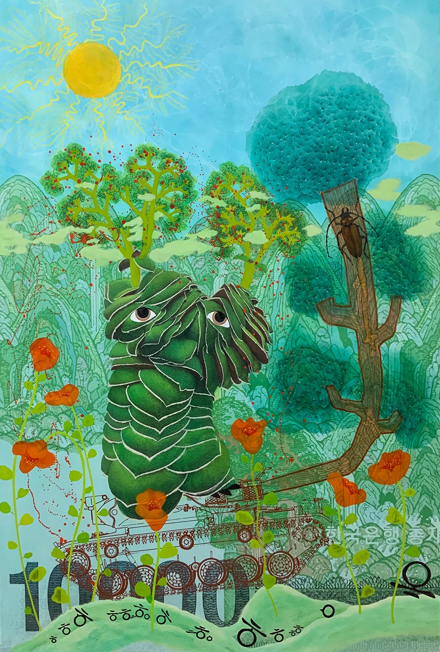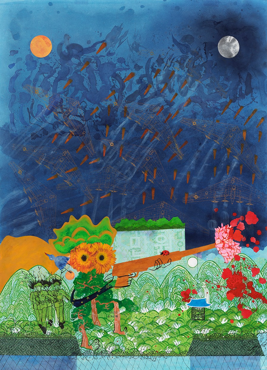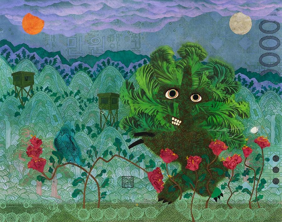 부조리한 놀이터에서의 천진한 놀이 김현수는 자연에서 채취한 식물들의 질감과 형태들을 인간적 시선으로 바라보면서 인간의 동물성과 자연의 식물성이 중화된 형태들을 만들었다. 그것은 식물의 동물화와 동물의 식물화가 서로 동등한 힘으로 진행됨으로써 이루어졌다. 그렇게 만들어진 작품들에서 원래의 모티브가 되었던 식물들은 자신들의 위풍당당함을 과시하며 제법 인간스럽고 동물성이 느껴진다. 그것은 식물의 발언을 경청하고 자신의 의지를 반영시키면서 그 접점을 찾아가는 과정에서 나온 것으로 자연과의 조심스러운 교제 단계가 심화되어 신나는 놀이의 차원으로 발전된 양상을 보여준다. 이것은 숭배의 대상으로서 자연의 역할을 놀이의 대상으로 전환시킴으로써 가능했고, 자신의 심리적인 상처가 어느 정도 치유되면서 생긴 자신감의 표출로 보인다. 그의 초기작에서 부조리한 사회 환경을 피하기 위한 장소로서 자연이 다루어졌다면, 이제는 그러한 현실을 어린이들의 놀이터처럼 다룸으로써 해학적 반전을 꾀하고 있는 것이다. 그것은 이데올로기나 자본주의를 인식하기 이전의 어린 시절에 대한 낭만적 기억을 환기시킴으로써 비롯된 것이다. 그의 근작들은 호기심 많던 어린 시절의 짓궂은 장난기와 열린 감각으로 산바람 강바람 맞으며 마음껏 뛰어놀던 어린 시절의 향수를 복원하고 있는 것이다. 어쩌면 그러한 유아적 환상이 사회화되기 이전의 순수한 자신의 본모습일지도 모른다. 자신의 무의식 깊숙한 곳에 자리했던 낭만적 향수를 끄집어냄으로써 최근 그의 작업은 활력과 생기를 얻고 있다. 그의 근작들의 주제가 되고 있는‘놀이’는 나와 대립된 상대와 어울려 하나로 어우러지는 가장 비정치적인 행위로 부조리한 사회현실에 대한 그의 낭만적 해법이다. 싸움은 상대를 정복하고 굴복시킴으로써 자신의 목적을 수행한다면, 놀이는 상대를 통해서 목적을 수행하는 것이다. 상대와의 관계가 일방적이 될수록 놀이의 흥미는 사라지는 법이다. 이러한 놀이의 철학에는 나와 남의 이분법적 경계를 허물고, 상대를 통해 존재하는 자연의 이치가 간직되어 있다. 이러한 놀이의 메커니즘을 통해 그는 허무주의나 염세주의적 태도에서 벗어날 수 있었고, 이분법적인 사고와 이로 인해 형성된 부조리하고 경직된 사회를 관조할 수 있는 여유를 얻은 듯하다. 그래서 그의 작업은 세속과 탈속, 현실의 부조리함과 낭만적 이상이 공존하는 놀이터가 되고 있다. 여기에 시각적 논리와 상관없이 마음의 즉흥적인 충동에 따라 천연덕스럽고 해학적으로 펼쳐지는 조형 방식은 인간의 순수한 본능을 자극한다. 화폐 속의 풍경에서 시작된 상상은 유년기의 추억과 천진한 낭만적 환상이 우연적으로 결합하며 예키지 않는 화면으로 귀결된다. 그것은 마치 조선시대 서민들이 그린 민화처럼 소박하고 자유롭다. 민화의 양식이 파격적인 것은 전통적인 양식규범을 따라야 한다는 제약에서 벗어나 자신의 소박한 소망을 담으려는 의식이 강하기 때문이다. 김현수는 본능에 따르는 자유로운 조형언어를 통해 인간의 문화와 자연의 섭리가 경계 없이 놀이로서 어우러지는 세계를 구현하고자 한다. 이것은 천진한 민성(民性)을 구현하고자 하는 의지이다. 한국인들은 전통적으로 부조리한 사회현실을 비판적으로 다루기보다는 소박하고 천진한 낭만과 소박한 민성을 표현하고자 했다. 민(民)의 철학적 의미는 본래 피지배계급을 의미하는 것이 아니라 사회적으로 계급화되기 이전의 순수하고 자유로운 인간의 본성을 의미하는 것이다. 민화뿐만 아니라 동물과 인간이 어우어진 이중섭의 가족도나 장욱진의 유아적 그림, 그리고 김기창의 바보 산수 등도 그러한 민성을 계승한 것이다. 김현수 근작 역시 자신의 소박한 민성을 드러냄으로써 민화의 정신성을 계승하고 있다. 그럼으로써 소재나 양식적으로 민화를 계승하는 구태의연함에서 벗어나 현대적인 조형어 법을 얻고 있다. 그의 작업에서 천진한 이상은 과거 조선인들의 소망이 아니라 새롭게 변화된 사회 환경을 살고 있는 자신의 꿈이자 동시대 한국인의 소망인 것이다. 최광진 평론 중 발췌 (출처 = 플레이스막2)