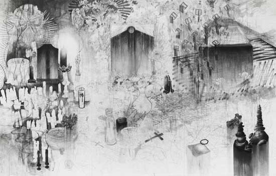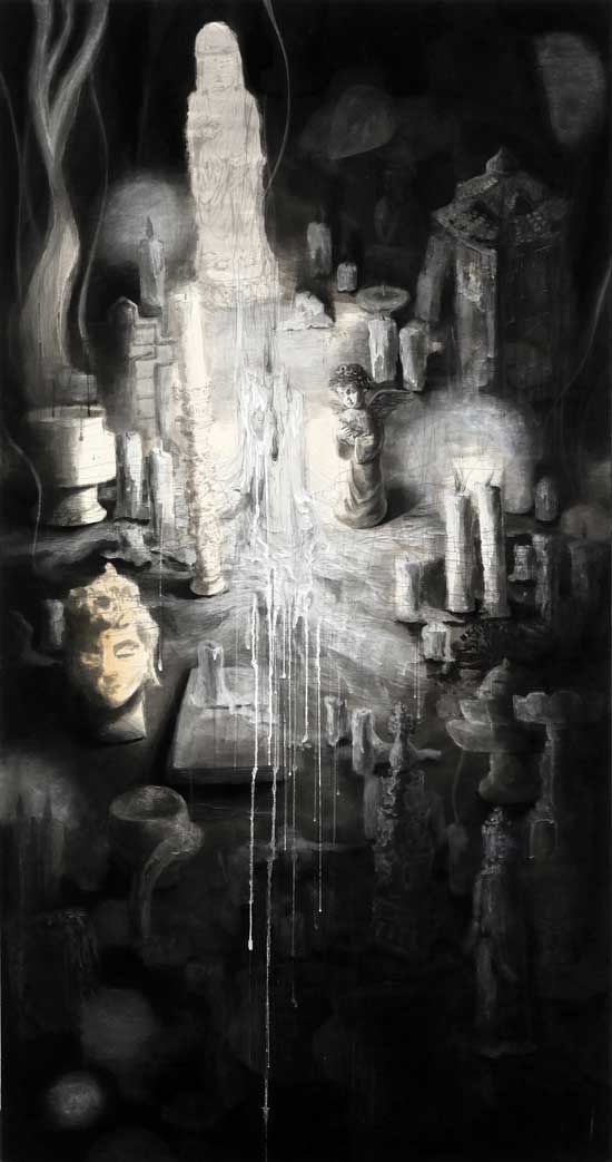 장소 : 갤러리 도스 제1전시관(B1) - Memento mori 김민영 / 갤러리 도스 큐레이터 대부분의 사람들은 일생의 과업을 모두 마치고 사랑하는 이들 곁에서 편안한 상태로 삶의 마지막 순간을 맞이하기를 원한다. 그러나 대상의 죽음은 남겨진 이들에게는 일생일대의 큰 슬픔과 고통을 안겨준다. 상실로 변해버린 일상의 적응 과정에서 여러 감정을 경험하며 때로는 무감각해지다가 분노와 같은 현실을 부정하는 감정이 생기곤 한다. 이렇듯 타인의 죽음은 자아의 실존에 많은 영향을 미친다. 대상은 현실에서 흔적도 없이 사라지지만 남겨진 이들의 마음속에는 결코 지워지지 않는 흔적이 어떠한 형태로든 남게 된다. 여생을 충실히 살아가기 위해서는 이러한 흔적으로 인해 침잠되는 것이 아니라 슬픔과 고통을 인정하고 극복해야만 한다. 이에 이나림 작가는 개인적인 경험 또는 자신과 관계 맺은 이들의 죽음에서 비롯된 슬픔을 짊어지고 내면의 발로를 통해 창작활동을 이어나간다. 궁극적으로 작품을 통해 보는 이들과 감정을 공유하고 발화하여 대면한 죽음으로부터 새로운 것을 읽어내게 만든다. 작업은 과거 작가가 꿈에서 경험한 어둠 속에서 녹아 흘러내리는 양초를 마주한 장면에서 시작된다. 그리고 화폭 위에 대상의 죽음과 관련한 의미 있는 문구, 글과 함께 담아내는 작품으로 발전시킨다. 문구와 글을 손으로 어루만지거나 안료를 흘러내리게 하는 행위는 지워짐과 그려짐이 반복되어 생기는 흔적을 통해 새로운 이미지로 탄생시키는 화면으로 구축된다. 이러한 과정은 사유하는 행위로만 존재하던 부재의 대상을 실재하는 이미지로 치환시키며 지속적으로 대상을 추모하고 주변 이들을 위로한다는 것이 가장 주목할 만한 점이다. 화면 곳곳에 배치된 도상들과 물건들은 타고 있는 양초의 형상으로 촛농이 녹아내리는 모습을 표현한다. 이는 남겨진 이들의 뜨거운 눈물처럼 한없이 흘러내리며 눈물이 멈춘 이후에 몰려올 무력한 감정을 공유하는 매개체의 역할로 표현된다고 볼 수 있다. 타고 있는 양초의 상태는 시간성을 가지고 있기 때문에 시간 앞에 제약된 삶을 극명하게 드러낸다. 죽음이라는 주제가 주는 다소 무거운 분위기를 양초 이미지로 그려내어 짙은 어둠을 환하게 밝혀주고 그 존재를 더욱 부각시켜 보는 이들과의 소통이 단절되지 않도록 희망과 극복을 상징하는 장치로 작용한다. 이처럼 양초는 자아의 안과 밖의 또 다른 모습으로 존재하기도 하며 언제나 삶과 함께하는 탄생과 죽음의 또 다른 초상이 되기도 한다. 작업은 주로 무채색의 안료를 사용하는데, 흑과 백 단색으로 실존하지 않는 세계를 표현하여 지난날의 향수, 순수하고 그리운 감정, 내면세계의 어두운 면 등 다채로운 계조를 보여준다. 이렇듯 색채에서 오는 절제가 더 많은 사색을 유도하고 끊임없는 생명력을 갖기 때문에 각각의 작품을 해석함에 있어서 새로운 관점을 만들어준다. 각 작품들의 제목은 한 편의 시를 읽은 듯 서정적인 측면을 함축하고 있으며 죽음을 덤덤하게 수용하는 태도가 느껴진다. 이는 존재의 부재에 의한 슬픔과 고통으로부터 충분히 애도하며 대상의 죽음을 잊지 않고 기억하는 데 든든한 버팀목이 되어준다. 이번 전시는 한 존재의 길고 긴 흐름 가운데 하나의 과정인 삶과 죽음의 관계를 이야기하고자 한다. 작품을 통해 보는 이들로 하여금 죽음과 대면하여 삶을 더 확실하게 지각할 수 있게 되고 이에 따라 작가가 지향하고자 하는 죽음에 대한 삶의 태도를 공감할 수 있을 것이다. 아울러 나를 둘러싼 대상들과 환경 그리고 그 안에서 그들과 함께 살아가는 자신의 역할에 대해 고찰하며 소중함을 느끼게 된다. 누구나 죽음으로부터 자유로울 수는 없다. 그러므로 죽음을 삶의 일부로 수용하여 대상이 어떤 사람이며 어떤 삶을 살았고 자신에게 어떤 의미였는지를 되돌아보며 죽음을 기억하는 것이 중요하다 할 수 있다. 작품에 빗대어 죽음을 들여다보고 이를 통해 자신의 삶을 되돌아봄으로써 존엄한 죽음 그리고 가장 이상적인 삶을 지향하기 위해 결의를 다지는 시간이 되어보기를 바란다. (출처 = 갤러리도스)