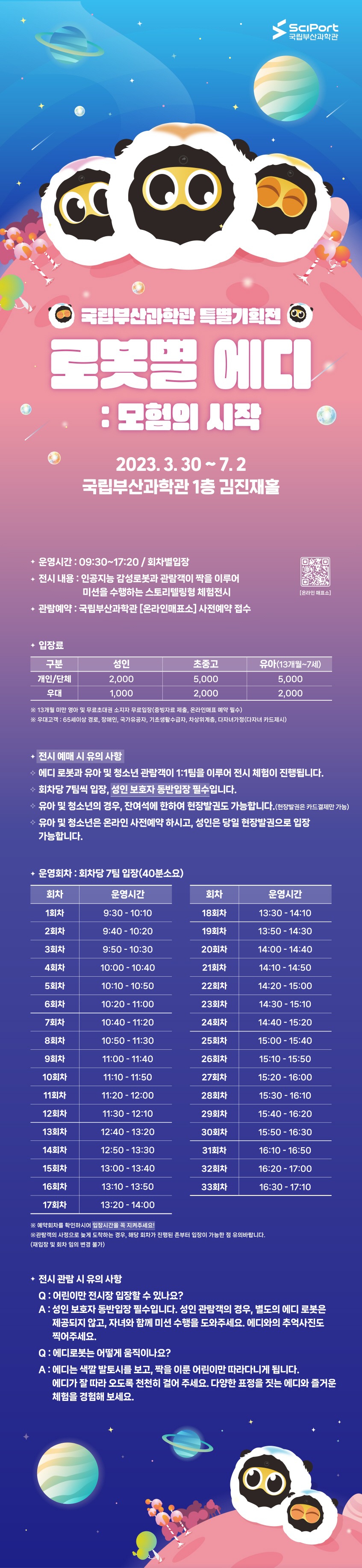 *사전예약 링크 : https://www.sciport.or.kr/kor/CMS/Contents/Contents.do?mCode=MN192 - 전시 내용 : 인공지능 감성로봇과 관람객이 짝을 이루어 미션 수행하는 체험 전시 예약문의 : 국립부산과학관 과학문화실 hall@sciport.or.kr (출처 = 국립부산과학관)