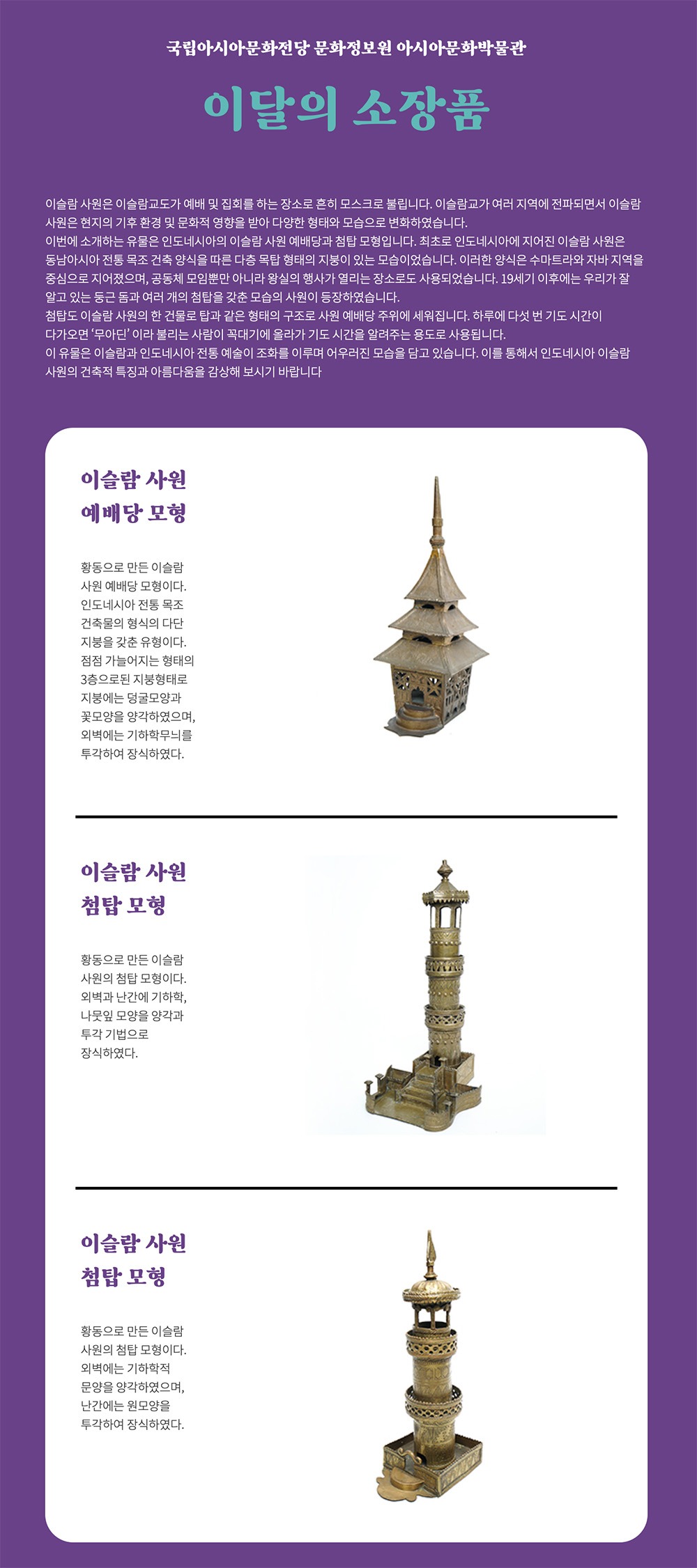 장소 : 문화정보원 아시아문화박물관 - 일년 동안 두 달에 한 번 새로운 주제를 선정해 박물관 소장품을 소개하는 전시입니다. 이번에 소개하는 유물은 인도네시아의 이슬람 사원 예배당과 첨탑 모형입니다. (출처 = 국립아시아문화전당)