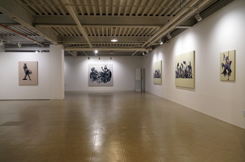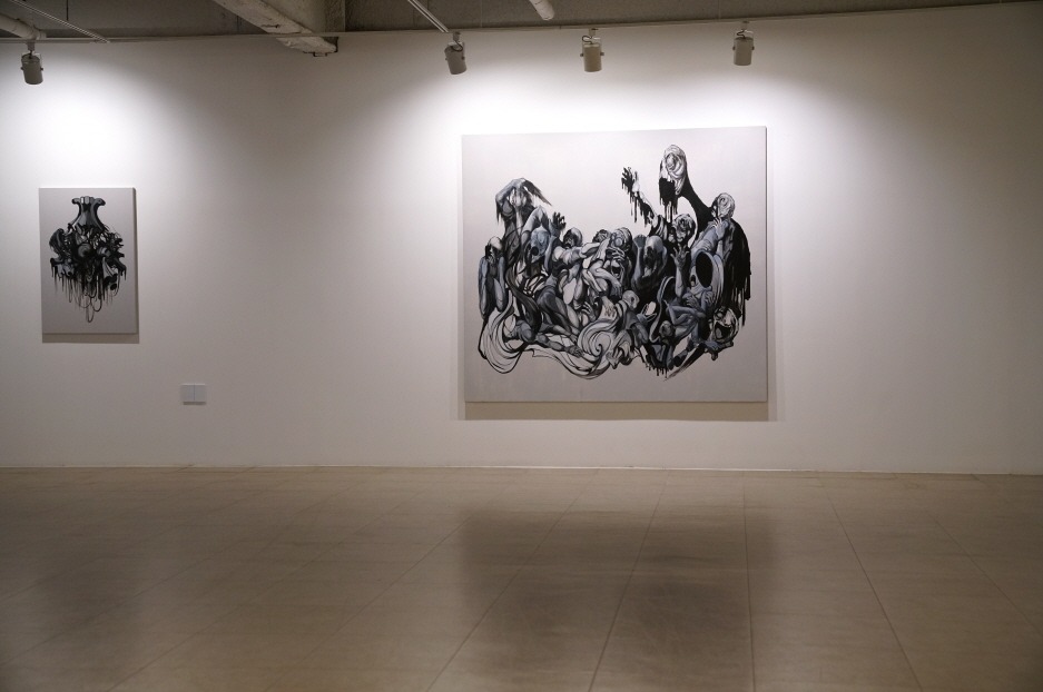 갤러리퍼플은 오는 6월 16일(금)부터 7월 29일(토)까지 심승욱 개인전 <픽! 팝! 푸! (Pick! Pop! Poo!)>를 개최한다. 심승욱 작가는 여러 사회적, 개인적 상황을 조각, 설치, 사진으로 재해석하면서 하나의 작품 안에 고귀함과 천박함, 희극과 비극, 무거움과 가벼움, 구축과 해체, 안정과 불안 등 양가적인 요소를 담는다. 이 요소들은 명확한 결론에 이르지 않는 모순을 유지하면서 언어로 규정할 수 없는 것들을 표현한다. <픽! 팝! 푸! (Pick! Pop! Poo!)>는 심승욱 작가가 사회적 현상들을 바라보며 느끼는 감정을 함축적 단어이자 의성어로 표현한 것이다. 이 단어들은 찍고, 터트리고, 배설하는 행위를 나타내며, 그 발음은 찌르고 터트리고 바람이 빠지는 청각적이고 촉각적인 느낌을 전달한다. 심승욱 작가는 우리가 숨쉬고 경험하며 축적하고 소비하는 모든 연속의 시간이 ‘픽! 팝! 푸!’와 같다고 느낀다. 이번 전시에서는 그동안 집중했던 조각, 설치, 사진작업에서 벗어나 회화작품을 선보인다. 정지된 내러티브를 보여주는 화면에 매력을 느끼고 회화를 통해 보다 자유롭고 불규칙하며 복잡한 모순을 보여주려 한 것이다. 심승욱 작가는 고전회화, 애니메이션, 만화책, 영화에서 가져온 요소들을 패러디하고 조합하여 다층적이고 모순적인 인간 존재와 현실, 그 이면 세계에 대한 사유를 펼쳐낸다. 이번 작품에 반복적으로 등장하는 먹는다는 행위는 생존본능에 충실한 생물로서 인간이 가진 욕구를 포함한다. 먹는 행위와 그 폭력적 욕구가 투영된 사회적 인간의 모습을 다양한 방식으로 담음으로써 인간의 심연에 내재한 욕망과 폭력을 냉소적으로 보여준다. 화면 안에는 불분명한 형태들이 뒤엉켜 있으며, 그 안에는 미와 추, 유쾌함과 불쾌함, 유희와 폭력이 공존한다. 또한 가볍고 밝은 색상과 어둡고 무거운 색상이 함께 사용되었다. 주요 색상으로 사용된 검정색은 화면에 시각적 통일감을 주지만, 작품에 이성적 질서를 부여하기보다는 오히려 그 전체를 비이성적이고 무질서한 심연의 세계로 끌어내린다. 화면에는 공간 표현이 생략되어 있기 때문에 이 형태들은 더욱 어떤 공간에도 속하지 않은 채 부유하는 느낌을 준다. 심승욱 작가의 작업은 인간존재와 사회현상, 대중문화, 예술과 미학적 담론에 대한 비판적 시선을 담고 있지만, 그 정확한 의미는 우리의 무의식이 그렇듯 명확히 규정되어 있지 않다. 작품은 그 의식할 수 없고 언어화할 수 없는 지점을 담고 있기 때문에, 작가는 작품의 의미나 작품 속 요소를 언어로 설명하기보다는 관람자가 각자 느끼는 직관적인 인상대로 받아들이기를 원한다. 관람자는 자신만의 경험과 지식, 방식에 따라 작품을 바라보고 각기 다른 부분을 발견해내며, 그에 따라 서로 다른 의미로 작품을 경험할 것이다. 작가는 작품을 말과 글로 설명하고 규정함으로써 언어와 의미의 틀에 가두기보다는 각자의 감각 안에서 경험되고 확장되기를 바란다. 그리고 그것이 언어가 아닌 예술을 통해 표현하고 소통할 수 있는 방식이라고 생각한다. (출처 = 갤러리퍼플)