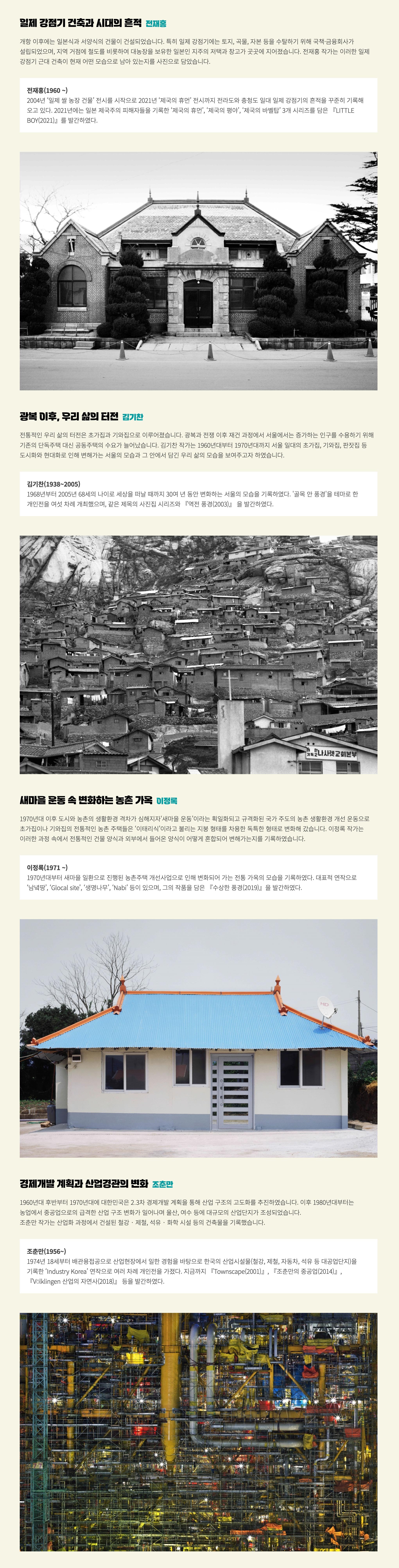 장소 : 문화정보원 기획전시실 2 - 이번 아시아문화박물관 기획전시는 대한민국 근현대 건축의 변화 과정과 그 안에 담긴 우리 삶의 단면을 조명하는 전시입니다. 국립아시아문화전당에서는 2014년부터 2016년까지 3년 동안 ‘한국의 사진가’라는 주제로 사진 작품을 수집했습니다. 이 중 근현대 건축을 담은 전재홍, 김기찬, 이정록, 조춘만 사진작가의 작품을 선별하여 선보이고자 합니다. 대한민국 근현대 건축은 사회·문화와 산업구조의 영향을 받아 변해왔습니다. 개항 이후 일제 강점기에는 일본의 자원 수탈을 위한 기반 시설을 건설하였습니다. 광복 이후 도시는 증가하는 인구로 인해 공동주택의 수요가 늘어났으며, 농촌의 전통 가옥은 ‘새마을 운동’이라는 생활환경 개선 사업으로 서양의 주거 양식을 차용한 독특한 형태의 가옥으로 변해갔습니다. 이후 1980년대에는 중공업 중심으로 산업 구조가 변화하여 대규모 산업 건물을 건설하였습니다. 이번 전시는 이러한 대한민국 근현대 건축의 변화를 네 명의 서로 다른 작가의 시선이 담긴 사진을 통해 바라볼 수 있도록 구성하였습니다. 작품 안에 담긴 그 시대의 사회상과 우리 삶의 흔적을 경험하시길 바랍니다. (출처 = 국립아시아문화전당)