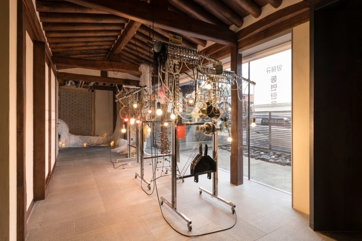 국제갤러리는 오는 8월 30일부터 10월 8일까지 양혜규 작가의 프레젠테이션 《동면 한옥》을 진행한다. 국제갤러리 한옥 공간에서 선보이는 이번 프레젠테이션은 본격적인 전시장으로서의 출발을 맞이하기 전 유보적 휴면 상태에 있는 본 공간의 상태를 적극 반영한다. 지난 2006년 8월, 양혜규는 인천의 한 민가에서 국내에서의 첫 개인전 《사동 30번지》를 선보였다. 인천이라는 서울의 위성도시, 그 중에서도 서해 연안 부두에 인접한 사동의 한 폐가에서 열린 이 전시는 여전히 다수의 미술인에 의해 기억되고 회자된다. 당시 작품이라 하기에는 미미한 요소들이 곳곳에 설치된 이 《사동 30번지》 전시를 위해 거쳐야 했던 기초적인 준비를, 작가는 스스로 두 가지로 정리한다. ‘청소한다’는 행위와 ‘전기를 연결한다’는 행위다. 수년 동안 사람이 살지 않았던 이곳은 주변에서 내다 버린 쓰레기로 가득 차 있었고, 전기와 수도는 끊긴 지 오래였다. 청소와 전기 문제가 해결된 후, 작가는 드디어 ‘유령 같은’ 삶을 상징하는 장치들을 삽입하기 시작했다. 깨진 거울, 조명기기, 벽걸이 시계, 종이접기로 만든 오브제, 형광 안료 등의 미미한 장치가 등장했다. 빨래가 없음에도 천으로 덮인 건조대가 펼쳐져 안방에 자리했고, 스트로보스코프 앞에 놓인 구형 선풍기는 슬로모션처럼 느리게 회전했으며, 장독대가 있던 자리에는 전망대가 들어섰다. 관객은 전망대에 놓인 아이스박스에 든 생수를 직접 마시거나, 이를 이용해 수도가 연결되지 않은 야외 수도가에 심어진 봉숭아와 국화에 물을 줄 수도 있었다. 이 전시에 처음 등장한 빨래 건조대와 링겔대는 이후 양혜규 작가의 조각을 표상하는 대표적인 오브제로 자리 잡았지만, 당시에는 비미술적인 재료와 낯선 오브제 여럿이 집 곳곳에 생소하다 못해 매우 낯선 환경을 조성하는 형국이었다. 그리고 이 이질적인 요소들을 모두 아우른 건 오랜 세월에 취약해진 낡은 가옥이었다. 이렇듯 확립되지 않은 여러 요소가 성긴 구성을 이루었던 《사동 30번지》에 비해 《동면 한옥》은 상대적으로 정립된 환경 속 보다 어엿한 작품의 형태를 갖춘 작업을 선보인다. 하지만 천장 조명을 마다하고, 야간에도 손전등을 의존하는 전시의 연출 방식은 어딘가 모르게 《사동 30번지》를 연상시킨다. 이와 같은 장소성은 물론, 시공 중인 한옥이라는 이 장소가 지닌 고유한 시간성은 켜켜이 쌓인 시간들과 더불어 과도기적 연상을 자아낸다. 이번 프레젠테이션에서 작가는 제목의 '동면'이 주는 느낌을 전시 연출의 주된 방법론으로 채택한다. 전시장에 들어서면 관객을 가장 먼저 자극하는 것은 여러 한약재 냄새와 점점이 흩어져 있는 전기 양초들이다. 한옥의 어느 구석에는 조각이 방치된 듯 바닥에 늘어져 있고, 또 다른 구석에는 저장용 항아리나 가마니처럼 조각 작업들이 가득 들어차 있다. 비교적 협소한 한옥 공간 내부에 높은 밀도로 전시된 작품들은 그 종류가 다양하고 제작 시기도 모두 상이하다. 전면 유리로 된 전시 입구에서 관람객을 가장 먼저 맞이하는 광원 조각 〈토템 로봇〉(2010)을 지나 오른쪽으로 돌면 인조 짚을 주재료로 직조한 〈중간 유형〉 연작(2015-)의 하나인 〈중간 유형 – 서리 맞은 다산의 오발 이무기〉(2020)와 만난다. 생명체의 머리가 바닥에서 들린 형국의 이 작품은 이제 막 상승하려는 건지, 아님 막 내려앉은 듯한 모습인지 알 수 없다. 한 팔은 먼 대들보 위에 걸쳐져 있고, 몸통 밑으로는 방울 촉수가 드리운다. 바닥 공간을 가득 메우고 있는, 아직 용이 되지 못한 전설 속 이무기를 연상시키는 이 신비한 생물체를 지나면 작가의 신작 중에서도 가장 최근에 제작된 〈소리나는 행성 주머니 – 홍예 식물 지도〉(2023)를 마주하게 된다. 거대한 벌집이나 열매를 연상시키는 이 매혹적인 생명체는 무지개빛 방울을 가득 단 몸체에 해저, 사막, 열대 등의 지역을 테마화하는 인조 식물을 담은 주머니로 구성되어 인공물과 자연을 동시에 아우른다. 벽에 설치된 흑경 조각 〈칠흑같이 회전하고 반사하며 흐르는 검은 큐브형 수도꼭지 – 비늘 굴린 정사각형 #17〉(2023)을 지나면, 〈중간 유형〉 연작 중에서도 덩치 큰 조각들이 꽉 들어찬, 상대적으로 침침한 뒤편의 공간을 맞이한다. 금속 방울로 덮인 회전 가능한 반구에 수도꼭지 손잡이를 부착한 근작 〈소리 나는 돌림 무엇이든 흐름 반구 #22〉(2022)와 빨래 건조대를 뼈대 삼아 방울로 감싸고, 표현할 수 있는 형태의 모든 경우의 수를 도출하고자 진행 중인 연작 〈소리 나는 접이식 건조대 – 마장 마술〉(2020) 등 다채로운 작품으로 그득한 이 공간은 빈틈없이 채워졌으나 어딘가 모르게 시간마저 저장된 듯한 그윽한 분위기를 자아낸다. 이어 관객의 시선은 그 공간 한편에 위치한 창문을 통해 한옥 뒤뜰에 나무를 감싸고 있는 〈중간 유형 – 탄소 맞은 수컷 칠발 이무기〉(2023)와 마주친다 입구에서 반대쪽으로 걸어 들어가면 기존에 전시장으로 사용되었기에 비교적 잘 정돈된 공간을 맞이한다. 이곳에는 조각 외에도 작가가 근 10여 년 동안 꾸준히 제작해온 모노프린트를 이용한 판화 작업과 