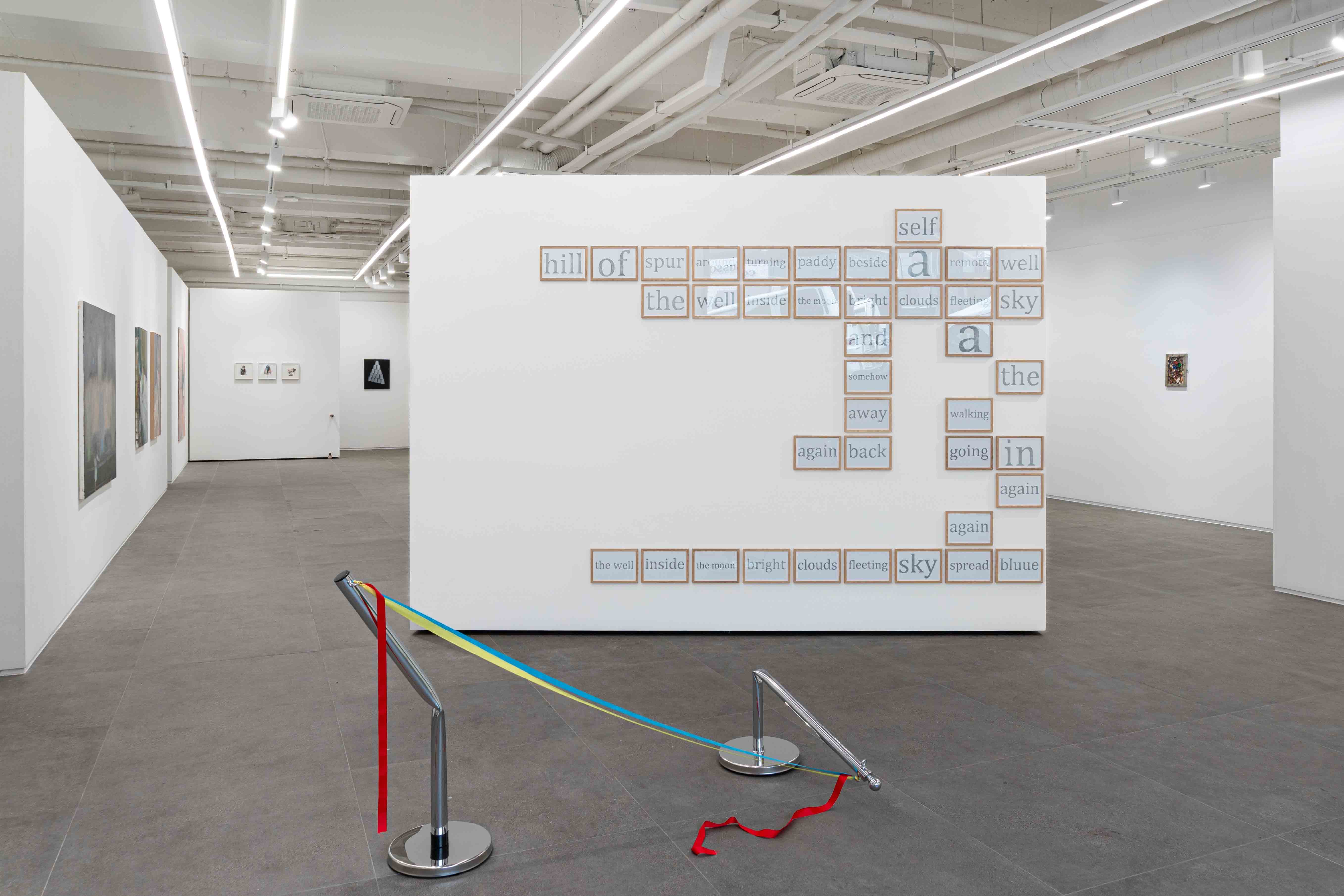 우리가 무의식적으로 따르는 가치들에 대해 질문하는 김민애는 본인 스스로 던지는 질문을 작품에 자연스럽게 담는다. 작품마다 주어진 전시 장소에 따른 형식의 변화는 있지만, 작가가 각 작품의 제작 시기마다 가졌던 질문들은 중첩된다. 영국에서 처음 선보여진 〈자 | 화_상〉(2013)은 그로부터 10년이 지나 한국에서 새로 선보여진다. 85개의 영단어 파편들이 모여서 이미지를 띄는 이 작품은 어디서도 언어적 의미가 정확히 해석되지 않는다. 당시 영국과 한국을 오가던 작가가 윤동주의 자기반성적 시 「자화상」의 영문본을 한국어순에 맞게 임의 배열한 것으로, 그가 재배치한 어구들이 제멋대로 내용을 확장하는 또 다른 편지이다. 의미없는 파편일지라도, 맥락과 함께 제 나름의 자리를 찾는 작품이 또 있다. 좌대 위에 올려진 수상자 미상의 트로피 조각 〈1. 안녕하세요 2. Hello에서 4-1〉(2020)은 해당 작품이 시작된 전시 《올해의 작가상》(국립현대미술관 서울관, 2020)의 시공간을 품은 작품명을 지닌다. 흥미롭게도, 이 독수리 형상의 트로피는 전혀 다른 맥락의 전시에서도 당당히 날개를 펼치고 있다. 이름없는 트로피는 단일의 승리자를 축하하기 위한 것이 아니기에, 전시를 함께 공유하는 작가들의 작품을 몸소 반사하며 더욱 빛난다.