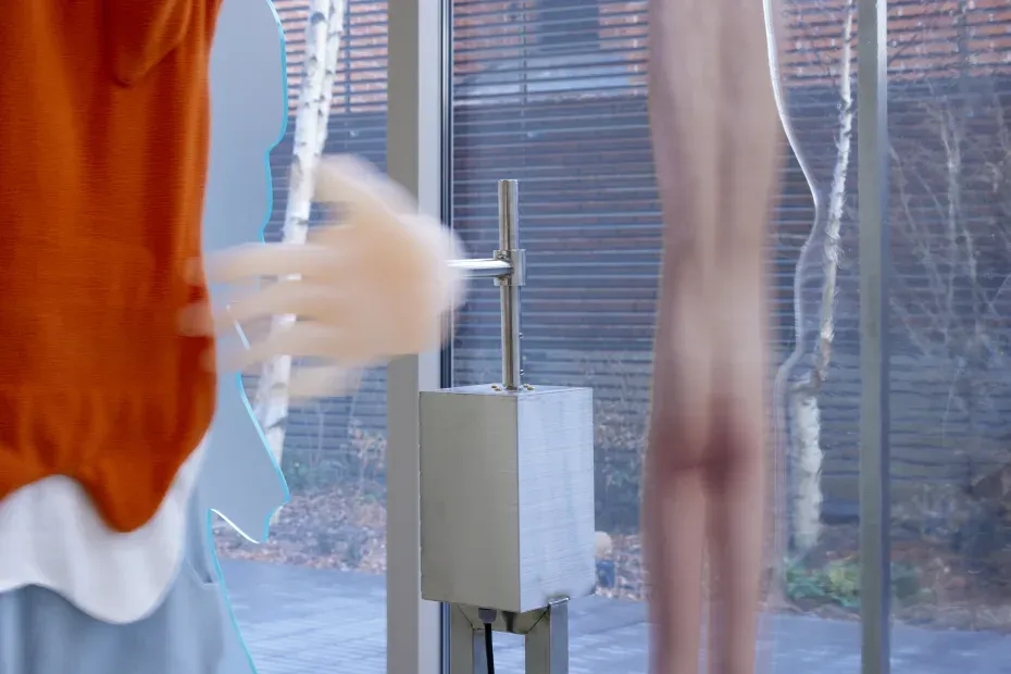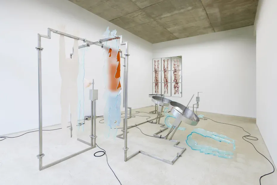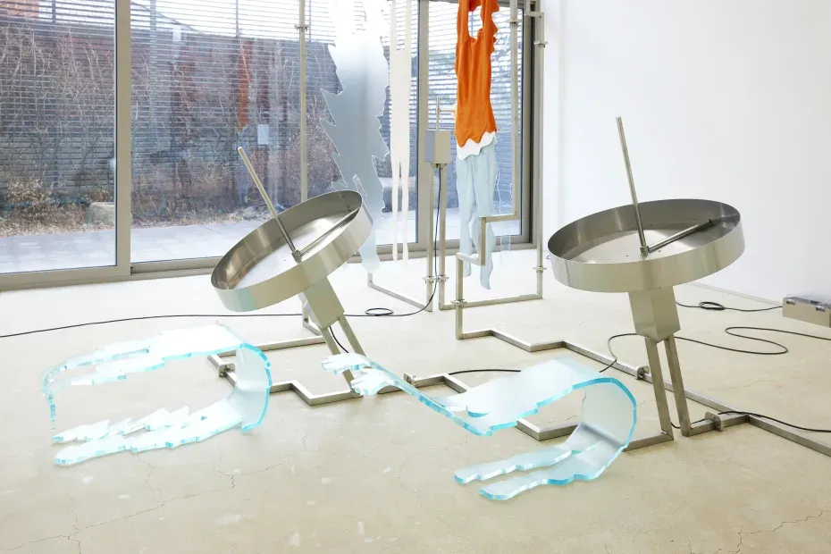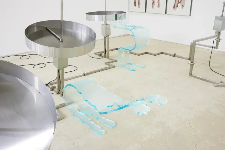 서신욱은 오늘날 자본주의 사회의 변화에 따라 산업화를 겪으며 개인을 변별하는 구분점이 사라지는 현상에 주목하고, 이를 키네틱 방식을 적용한 입체물을 통해 구현한다. 특히 이번 전시는 강철을 사용한 과거 작업에서 나아가 스테인리스를 주요 소재로 삼은 작업을 통해 한국의 산업과 사회 지형에 대한 이야기로 넓힌 서신욱의 탐구를 살핀다. 서신욱은 인간의 움직임을 미세하게 조정하는 공장의 ‘생산 라인’과 기계의 메커니즘을 조명한다. 1800년대 이후, 멈추지 않고 가동되는 기계를 보유한 공장의 모습은 동시대를 단적으로 빗대는 이미지로 여겨져 왔다. 그 이미지 속에는 분명 손, 발, 허리 등 신체를 움직여 동력을 내는 인간의 모습이 담겨 있다. 그러나 생산 라인이라는 건조한 이름으로 점철된 공장의 메커니즘은 우리에게 기계가 움직이는 모습을 드러낼 뿐, 인간의 업은 대체로 숨겨 버리고 만다. 이러한 논의는 철학자 루이 알튀세르(Louis Pierre Althusser)가 이데올로기 개념을 토대로 전개한 바 있는데, 그는 사회라는 시스템이 모든 개인에게 같은 것을 공유하도록 하여 자신이 구조에 일조하는 듯 상상하게 만든다고 지적했다. 이번 전시의 제목처럼 모두가 “동일한 새벽과 밤”을 지님으로써, 역설적이게도 현실에서는 개인보다 시스템의 구조가 강조되는 것이다. 서신욱의 작업은 이처럼 우리 앞에 적극적으로 전시되는 공장식 메커니즘, 그리고 이에 적용되며, 혹은 적응하며 달라지는 인간의 메커니즘이 대비되는 장면을 들춘다. 전시장에는 두 개의 컨트롤 박스로 연결되어 하나의 개체로 통합된 ‘유니바디(Unibody; Unified Body)’ 기계가 자리한다. 원형운동을 하는 다섯 개의 모터가 각각 짝을 이룬 입체물에 달려 있다. 세 개의 둥근 판에 체결된 모터는 판 위에 놓인 봉을 움직이고, 봉은 시계방향으로 돌며 여러 개의 구슬을 걸러내듯 이동시킨다. 그 아래 바닥에 놓인 아크릴은 인체를 형상화한다. 모양도 곡률도 다른 세 개의 인체는 움직임에 반응하는 상징적인 형태로, 판을 받치고, 쓰러져 가고, 쓰러지다 못해 완전히 꺾여버린 모습이다. 둥근 판으로 구성된 구역 한편에서는 모터가 달린 봉이 원형으로 돌며 프레임 위를 반복해서 지나간다. 반대편에 교차된 두 개의 프레임 중앙에는 실리콘으로 캐스팅한 손 모양의 입체물을 움직이는 모터가 결합되어 있는데, 모터를 통해 동력을 얻은 손은 네 개의 인체 형상을 계속해서 스친다. 여기에 설치된 인체 형상들은 하프집업과 청바지처럼 실제 의복에 활용되는 천, 피부를 닮은 표면을 지닌 가죽, 세밀하게 형태를 달리 만든 아크릴로 구현되어 현실 속 인간이 가진 면면을 상기시킨다. 이번 전시에서 선보이는 서신욱의 작업은 3D 프로그램의 ‘지오메트리 노드(Geometry Node)’ 기능, 나체 형상, 스테인리스 소재를 활용한 새로운 실험에 기반한다. 과거 정신분석학에 관심을 두고 뇌파의 움직임을 형상화했던 그는 신작에서 3D 프로그램 블렌더(Blender)의 기능 중 하나인 지오메트리 노드를 활용했다. 지오메트리 노드에서는 점, 선, 면을 모아 하나의 오브젝트를 구성한 지오메트리의 점을 조작해 선과 면을 다른 형태로 만들 수 있다. 이는 X, Y, Z 세 개 축을 중심으로 이동, 회전, 크기에 변화를 주며, 최소한의 입력값으로도 큰 변형을 일으킨다. 전시장에 놓인 유니바디에 체결되거나 벽에 걸린 거울에 인쇄된 나체의 형상은 이 기능을 적용해 만든 이미지로, 동일한 형상에 미세하게 다른 세 단계의 값을 입력해 도출한 결과를 보여준다. 한편 그는 유니바디의 프레임으로 기존에 사용하던 강철이 아닌 스테인리스를 사용했다. 두 재료 모두 건축이나 산업용 기계에 주로 쓰인다는 점에서 산업화, 공장의 이미지를 은유하지만, 특히 한국에서 강철보다 더 많이 소비되는 스테인리스는 이곳만의 산업과 사회에 대한 이야기를 드러낸다. 전시장에 자리한 신체들, 즉 실리콘 손과 외곽이 변형된 인체들은 산업화된 사회가 인간의 삶 위에 덧씌운 비극에 대해 말하고 있다. 그런데 어쩌면, 여기서 비극은 얇은 선 하나 정도의 미묘한 차이로 희극적인 장면으로 전환될지도 모른다. 하나로 연결된 기계들, 그것이 순환됨을 나타내는 화살표, 그리고 변형된 인체 앞에 선 자신을 들여다보게 하는 거울은 멀리 떨어져서 현실을 직시하고 자신을 둘러싼 시스템의 전체적인 모습을 목도하라 말하는 듯하다. 그런 반면 허무맹랑하게 움직이는 옷들, 돌고 돌다 때가 타고 닳기도 하는 말랑한 손은 짧은 유머를 발생시킨다. 코미디처럼 마냥 웃기지는 않은, 찰나의 웃음만을 남기는 순간들. 달리 말해 냉소가 어느 순간 이곳에 자리하게 된다. 그것이 냉소라는 점은 결국 또 메커니즘, 시스템이라는 전체적인 구조를 지닌 오늘날 산업과 사회의 모습을 한 번 더 직시하게 만든다. 글: 김진주 (출처 = 갤러리2)