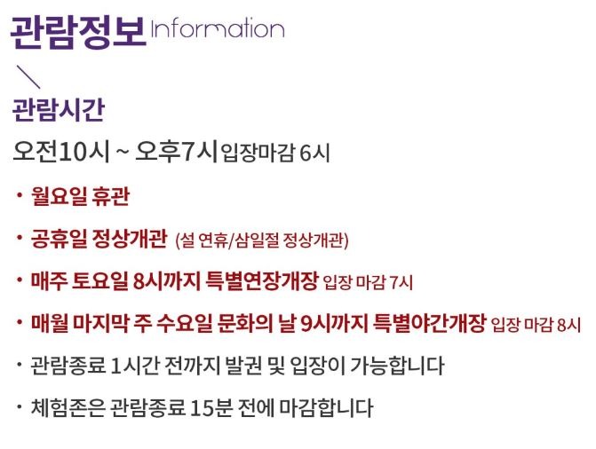관람료| 성인 13,000원 초중고생 11,000원 유아 9,000원