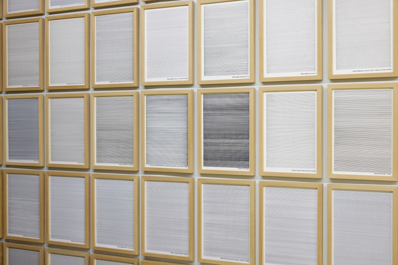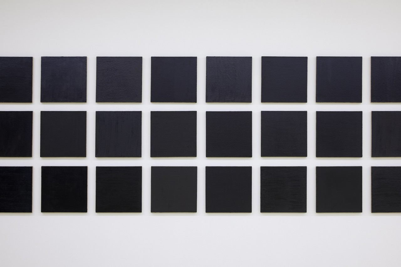 박미나 개인전 《검은》은 크게 세 개의 연작으로 나누어진다. <Black Pens>은 시판되고 있는 검은색 펜을 최대한 수집하고 이를 우리가 흔히 사용하는 A4 용지에 일률적인 간격으로 그어 나간 2006년부터 2024년까지 진행된 작업이다. 이렇게 완성된 498개의 드로잉 밑에는 펜의 상표와 고유번호가 적혀있고, 작가는 이를 따로 목록화 작업을 해 놓았다. <2014-Black>은 현재까지 판매되고 있는 검은색 유화물감을 수집하고 27.3x27.3cm의 정방형의 화면을 온전히 칠해 55개의 검은색 면을 만들었다. <2014-BGORRY>, <2024-BGORRY> 두 작업은 픽셀의 크기가 다를 뿐 6가지 색을 픽셀 하나하나에 채워 넣어 검은색을 색 분해해 놓은 것 같은 화면을 구성하고 있다. 그는 어떤 대상을 재현하는 방식이 아니라 회화가 가지고 있는 가장 기본적인 선과 색, 언어와 기호를 통해 회화의 본질에 대한 작업을 지속해서 해오고 있다. 그의 작업은 위에도 언급한 것처럼 재료를 수집하는 것에서 출발한다. 이번 전시에서도 자신이 파악하고 모을 수 있는 검은색의 펜과 유화 물감을 최대한 찾아서 모았다. 이러한 검은색이라는 재료는 색이라는 범주에서 이번 그의 작업이 가진 기본적인 범위가 된다. 이렇게 설정된 틀 안에서 그는 색을 칠하고 선을 긋는 행위에 온전히 집중한다. 이 글은 《검은》 전시에 집중하여 작가가 전시를 통해 무엇을 이야기하는가보다 관객의 입장에서 무엇을 보고 읽어나갈 수 있는지 살펴보려 한다. 따라서 이 글은 필자가 작가와 나눈 인터뷰를 바탕으로 하여 한 명의 관객의 시선으로 전시를 보면서 생각나는 단편들을 파편적으로 기술하는 일이 될 것이다.