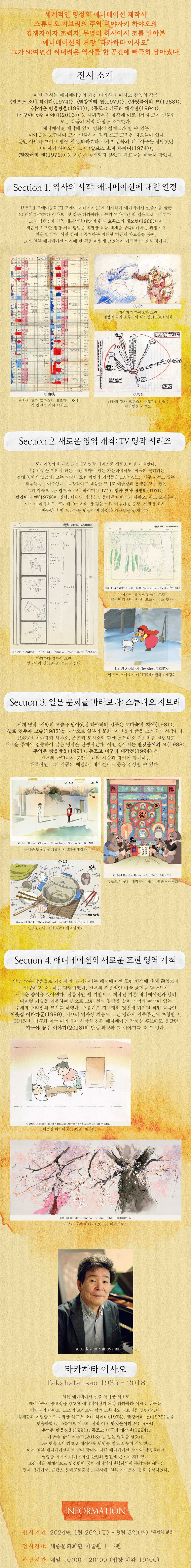 시간| 오전 10시 ~ 오후 8시 (입장마감 : 오후 7시) * 2024년 04월 26일(금요일)은 프레스 행사로 인하여 관람시간이 변경됩니다. 변경 관람시간 : 17:00 ~ 20:00 (입장마감 19:00) * 2024년 04월 26일(금요일) 관람 관객에 한해 선착순 200분께 '타카하타 이사오전' 서울 전시에서 한정 판매되는 A3포스터가 랜덤 증정됩니다. (공연시간 : 60 분 / 인터미션 없음)