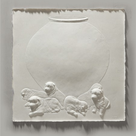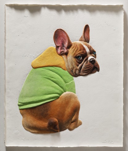 개에 관한 작업은 동물의 눈에 비친 인간세계를 풍자한 조지 오웰의 소설 ‘동물농장’에서 시작되었다. 잠을 자고, 장난치고, 예쁘게 앉아 경청하는 모습은 인간과 삶을 함께하는 개 그대로다. 마치 살아있는 듯 생생하고 섬세하다. 하지만 시선을 붙들어 매는 얼굴 속 눈동자는 인간의 것이다. 혹은 안경을 씌워 눈을 대리한다. 감정이 담긴 그 눈동자들이 인간과 다름없는 생명체로서의 묵직한 존재감을 전한다.