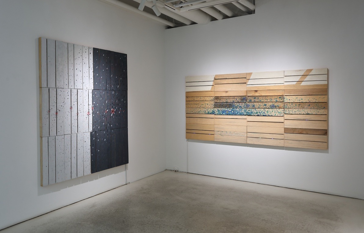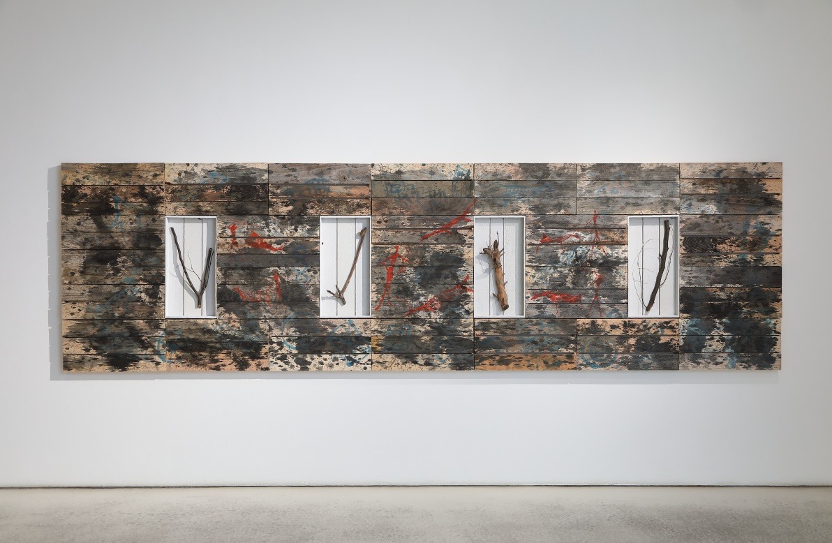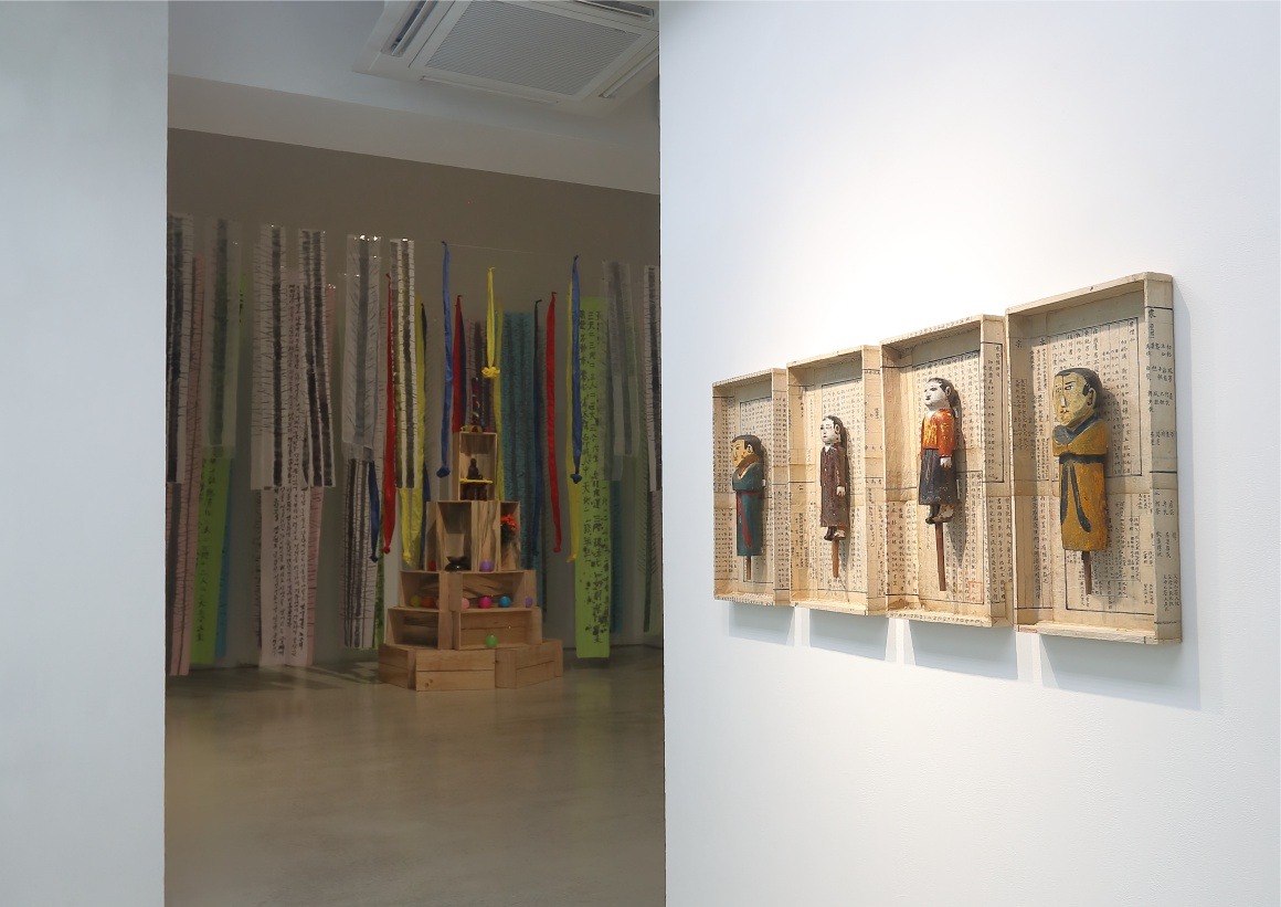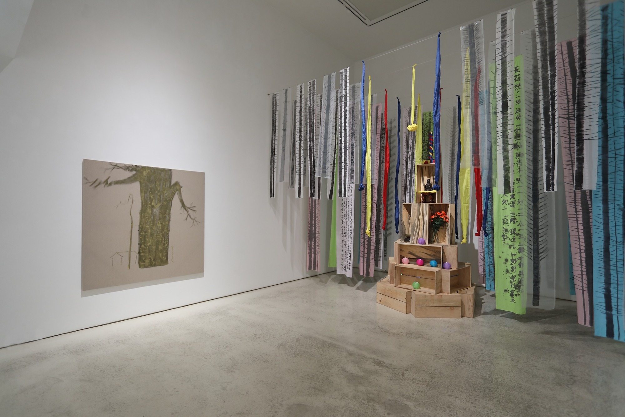 전시실 입구에 들어서면 한쪽 벽에 ‘신목(神木)’이라는 제목의 당산나무 그림이 자리하고 그 옆으로 설치작품 <서낭당>이 자리한다. 길다란 천 조각들에 그려진 나무들이 모이고 겹쳐져 하나의 숲을 이룬다. 나무와 나무 사이에는 반야심경(般若心經), 천부경(天符經), 정선아리랑 등의 글을 담은 천과 오방천이 함께 걸리며 신묘한 분위기를 자아낸다. 서낭당 나무 아래 돌탑은 그가 즐겨 쓰는 나무를 재료로 한 나무탑으로 탄생시켰다. 요즘은 쉽게 구할 수 없는 나무 과일상자의 형태를 재현하여 옛 향수를 재생시키고 친근한 조형미를 담았다. 담음이라는 본래의 쓰임이 사라진 나무 과일상자는 쓰임과 버림이라는 시작과 끝이 맞닿아 있음을 암시하는 소재이다.