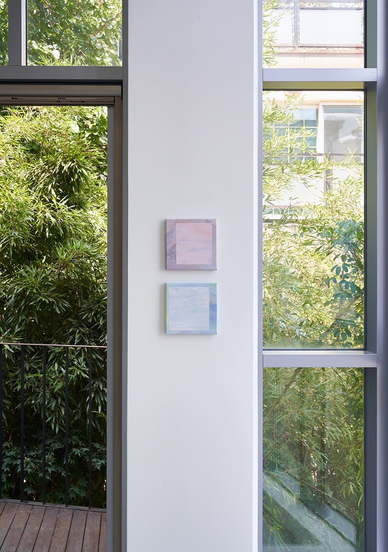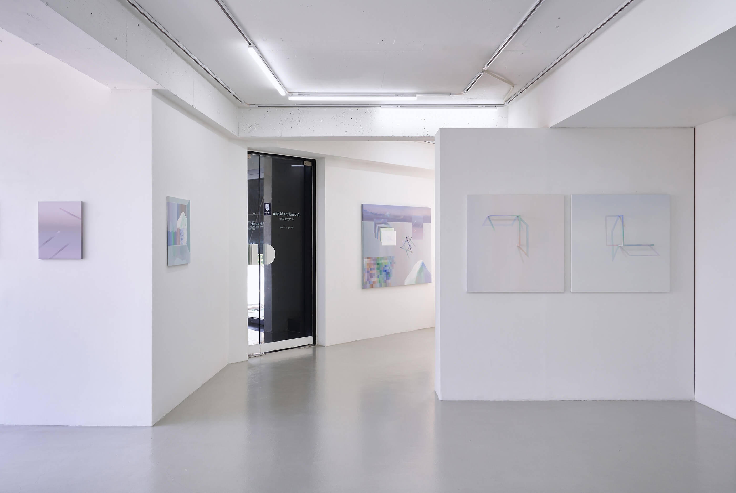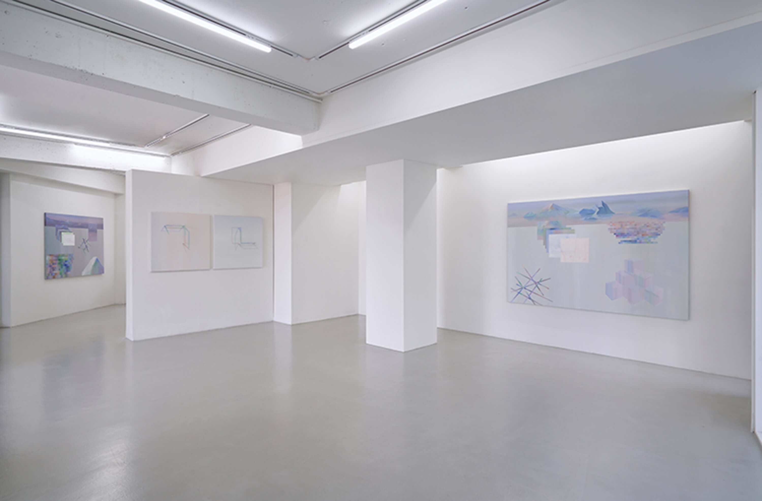 파이프갤러리는 최은혜의 개인전《Around the Middle》을 2024년 8월 23일부터 9월 25일까지 진행한다. 작가는 자신의 작품이 보이는 것과 보이지 않는 것, 물질적인 것과 비물질적인 것 사이에서 만들어지는 진동으로부터 출발한다고 이야기한다. 전시 타이틀《Around the Middle》역시 실재하는 것과 내면으로 인식하는 것의 중간 지점, 흘러가는 시간 속에서 혼합되는 이미지의 중간 지점쯤에서 포착한 조형적 요소들을 뜻한다. 전시는 작가가 직접 경험했던 공간의 잔상이나 자연의 순간적 인상을 내면의 기억과 주관적인 정서를 통해 변주하고 새로운 균형과 리듬감을 가진 회화적 언어로 재구성한 작업을 선보인다. 빛, 색채, 형태가 하나로 결합된 레이어는 자연적이거나 기하학적인 형태와 함께 눈으로 확인할 수 없는 비표상적인 지각이 서로 관계하며 보이는 것과 보이지 않는 것, 구상과 추상의 중간 지점에서 다시 새롭게 생성된다. 전시《Around the Middle》을 통해 개인의 주관적 경험과 현상 너머 새로운 인식에 대한 최은혜 작가만의 함축적이고 관념적인 시도를 감각하길 기대한다. - 사이: 중간 그 어딘가 강정하 (금호미술관 선임 큐레이터) 고요함 속의 움직임 수평선(지평선)을 경계로 아련하게 펼쳐지는 하늘과 바다(땅), 투명한 창을 경계로 나누어지는 안과 밖의 풍경은 단편적 공간을 점차 입체화시키며 확장해 나간다. 낯설고도 신비로운 이 공간 속을 유유히 부유하며 존재를 드러내는 자연(산)과 사물(도형)의 형상들은 서로를 침범하지 않고 거리를 유지하기도 하고 만나서 중첩되고 교차하며 다양한 시공간의 층위를 형성하기도 한다. 여기서 은은하고 부드러운 파스텔 톤의 색채들은 공간 전체를 물들이며 눈에 보이는 형상뿐만 아니라 빛과 대기, 온도 등 눈으로 볼 수 없는 비물질적인 것까지 감각적으로 담아내며 물리적 공간을 넘어 지각과 심상을 자극하는 다차원적 공간을 구축한다. 이처럼 현실과 비현실이 뒤섞인 듯 보이는 초현실적 세계는 언뜻 고요해 보이지만 형상과 색채들은 유기적인 관계 속에서 반짝이고 움직이며 아득한 공간 속의 무한성을 드러내고 있다. 공간에 대한 그리고 공간을 통한 사유 공간이란 개념은 역사와 시간을 대체하면서 20세기 후반 중요한 이론적 화두로 등장한다. 이러한 공간적 전회(spacial turn)[1]즉, 공간에 대한 그리고 공간을 통한 사유는 동시대 예술에서도 다양한 방식으로 나타난다. 작가 최은혜는 공간 개념에 대한 관심과 탐구를 시작으로 삶에서 마주한 구체적 장소와 풍경에 대한 개인적 경험 그리고 이러한 공간, 장소, 풍경에 대한 이미지를 받아들이고 체화하는 사유의 과정을 통해 그만의 세계를 만들어 나간다. 그는 일기를 쓰듯 매일매일 이미지를 수집하고 드로잉 한다. 집 주변 산책길에서 시선이 멈춘 곳, 레지던스 참여를 위해 머물렀던 아이슬란드에서 마주한 광활한 대자연의 풍경, 비행기 안에서 포착한 창밖의 하늘과 시간에 따라 변화하는 빛의 흔적 등이 작업의 자양분이 된다. 이러한 장면의 조각들을 사진과 드로잉으로 옮기고, 실제 모습과 선택적 기억이 함께 스며들고 내면의 감각을 사유하는 과정을 거친다. 이러한 공간에 대한 경험, 내적인 공간의 기록 등은 캔버스라는 화면 안에 형태와 색채로 변환되어 등장한다. 작가는 대상의 연속되는 움직임의 과정에서 발견되는 색채를 구현하기 위해 밝고 옅은 빛깔의 파스텔 톤을 사용하게 된다. 구체적인 가시성을 넘어 비가시적인 발생의 차원을 가시화하는 색채는 차원성을 확장한다. 이처럼 세계가 그림이 된다는 것은 보이는 세계의 실재성을 넘어서는 것이다. 작가는 공간에 대한 그리고 공간을 통한 사유를 통해 또 다른 깊이의 세계를 펼쳐 보인다. 사이: 중간 그 어딘가 작가는 자신의 작업에 대해 “어떤 실재하는 것과 기억하는 것 사이, 중간 지점에서 만들어지는 여러 가지 시간의 형태들을 공간에 재배치하는 것”이라고 말한다. 공(空), 간(間)은 빈 곳을 뜻함과 동시에 비어있는 사이를 말한다. 그는 아무것도 없는 텅 빈 공간 안에서 실제와 기억 사이, 현실과 비현실 사이, 이것과 저것 사이를 탐색하며 보이지 않지만 존재하는 이 사이의 틈새와 구조의 경계면을 드러내고자 한다. 여기서 사이 공간의 깊이와 층위를 만드는 통로의 역할을 하는 것이 바로 창문이다. <Layers of Landscape>(2024)와 <Around the Middle>(2024)에서도 발견할 수 있는 투명한 창은 안과 밖의 공간을 구분해 주는 경계이자 눈에 보이는 세계 너머 다른 세계로 인도하는 통로이다. 또한, 세계를 광경으로 바꾸는 하나의 도구인 거울로 자리하며 나와 너, 세계와 또 다른 세계 사이에 존재하는 관계를 비춘다. 창을 통해 바라보는 바깥 풍경이 사물을 인식하는 범위를 넓혀주는 것처럼 작가는 이러한 장치를 통해 우리의 시선을 머물게 하고, 사유할 수 있는 시간을 내어준다. 그렇다면 작가가 자신의 작업에서 공간과 함께 중요하게 언급하는 시간은 어떻게 이해할 수 있을까? 공간은 눈에 보이는 틀이지만 시간은 그렇지 않다. 시간에게 공간은 캔버스이며, 시간은 공간 위에 그림을 그린다. <Midnight Reflections>(2024)은 작가