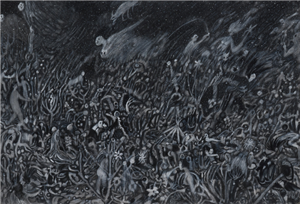 특히 2022년 이태원 참사는 제 작업에 큰 영향을 주었습니다. 당시 수백 명의 사람들이 좁은 골목에서 서로 얽히고 설키며 압사하는 비극적인 사건은 단순한 사고 이상의 의미로 다가왔습니다. 사람들이 공포와 혼란 속에서 극도로 위험한 상황에 처했지만, 그 누구도 이 상황을 막을 수 없었습니다. 이런 비극은 개인이 느끼는 극한의 공포뿐만 아니라, 많은 사람들이 모여 있어도 서로 어찌할 수 없는 무력한 상황을 보여주었습니다. 더 충격적이었던 것은 같은 시간 다른 사람들은 여전히 술을 마시고 춤을 추며 축제를 이어가고 있었다는 점이었습니다. 이러한 대조적인 장면은 개인의 고통과 무관심 속에서 돌아가는 사회의 이면을 극명하게 보여주었습니다. 우연의 숲 시리즈를 시작하던 시기에 작업 중 우연히 생긴 얼룩을 보며 할로윈 분장을 한 사람들이 떠올랐고, 그 이미지를 자연스럽게 작업에 담게 되었습니다. 이를 통해 한 개인의 무의식도 집단의 무의식 속에서 분리될 수 없음을 깨달았고 숨기고 방치해 온 개인과 사회의 트라우마적 기억과 무의식을 마주하고자 했습니다.
