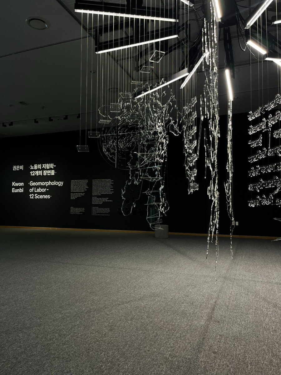 시각 예술 분야에서 활발한 활동을 이어가고 있는 권은비는 예술을 통해 다양한 사회 문제에 비판적으로 접근하면서, 이미지와 사운드를 통해 공동의 기억에 접근하는 다수의 작품을 선보여 왔다. 소장품섬을 통해 선보이는 〈노동의 지형학-12개의 장면들〉(2021)은 작품의 제목을 통해 상상해볼 수 있듯이, 자본과 권력이 공간을 어떻게 배치하는지, 그리고 그 안에서 노동이 어떻게 분절되고 은폐되는지, 유산자와 무산자의 계급이 어떻게 나누어지는지와 같은 문제를 조형적 언어로 탐구해 보는 작품이다. 이 작품을 이해하기 위해서는 아크릴 조각, 설명글, 음성 해설 세 가지를 서로 연동시키는 작업이 필요하다. 관람객은 서로 교차하거나 어긋나는 아크릴 조각과 지나가는 사람들의 그림자, 소리를 저마다의 관점과 경험에 빗대어 인식하면서, 파편화되어 흩어진 노동의 장면을 하나로 모으는 일에 함께하게 될 것이다.