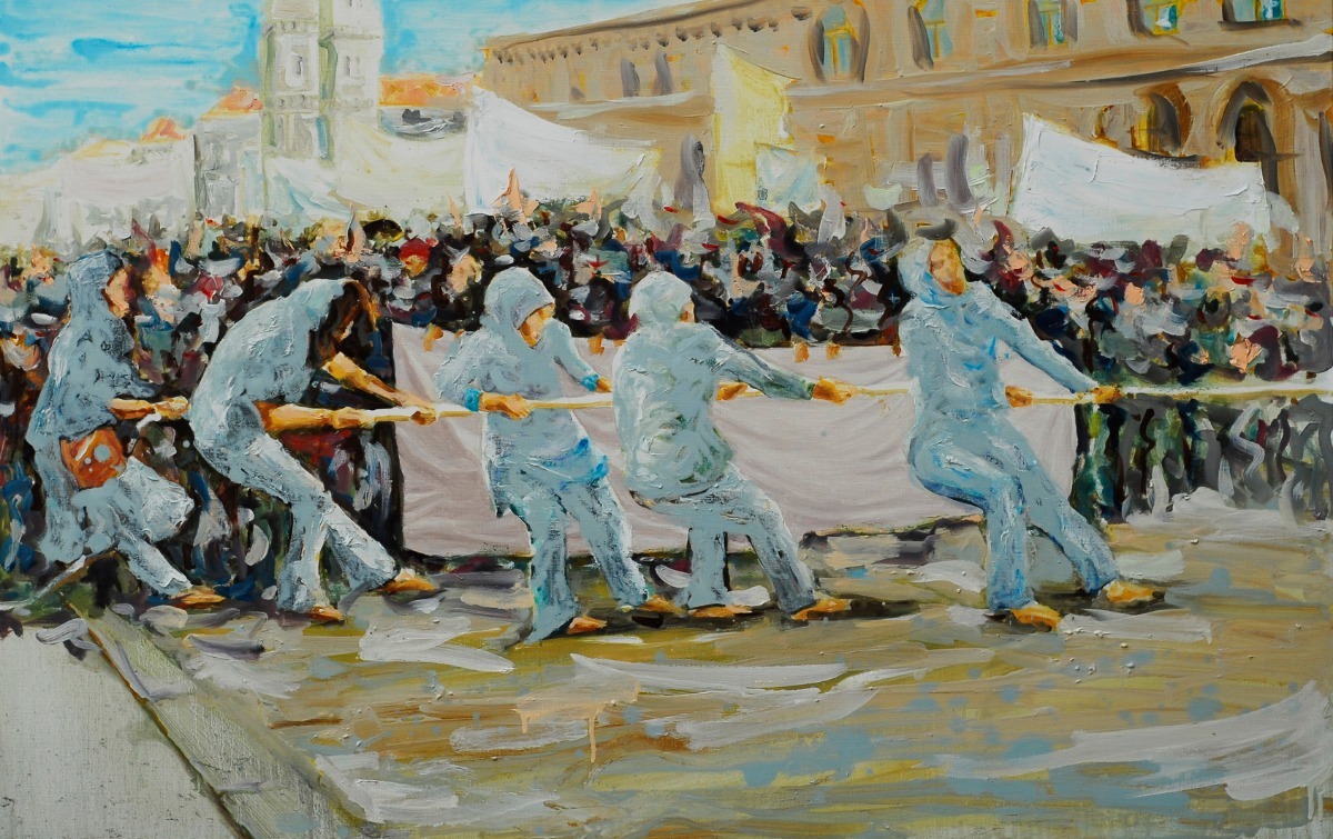 또한, 양경렬은 정치의 시발이 되는 ‘광장과 아고라’라는 장소적 상징성을 매개로 한 정치와 권력에 대해서 사회 구조와 부조리를 해부하기도 한다. 그는 〈줄다리기하는 남자〉, 〈벌거벗은 임금님〉 시리즈를 통해 집단 속에 잠재한 무력함과 인위적인 갈등 구조를 포착해 내면서 광장과 권력, 그리고 사회적 긴장에 대한 자신의 메시지를 은유적으로 표현하고 있다. 또한, 〈Piece〉 시리즈는 감정과 기억의 파편들이 재배열되면서 현실 사이의 모호한 경계가 구조화되고 왜곡되는 현상들을 확인시켜 준다.