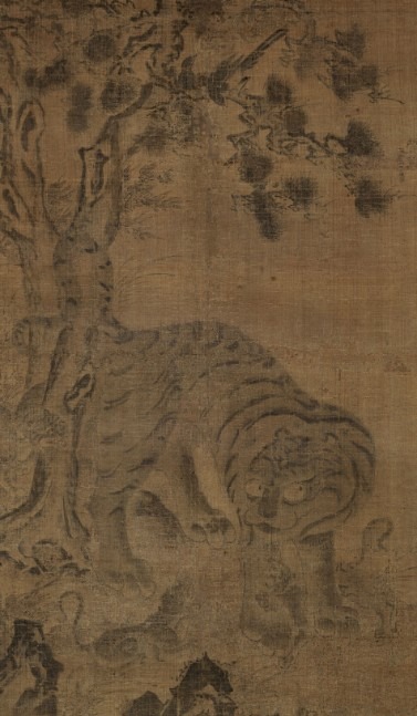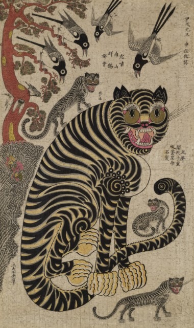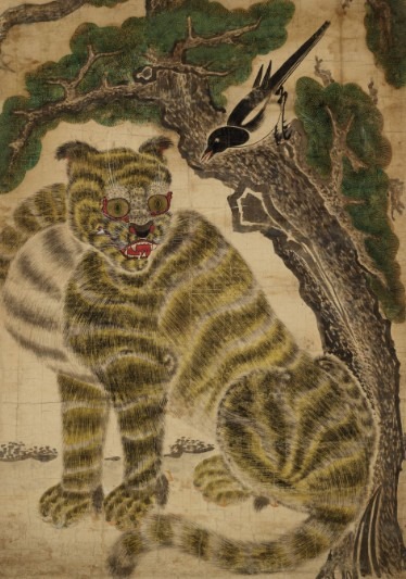 이를 잘 보여주는 작품이 이번 전시에 처음으로 공개되는 1592년작 <호작도>입니다. 전형적인 까치호랑이의 모습을 하고 있으면서도 민화가 아닌 일반 회화 형식으로 그려진 이 작품은 까치호랑이 도상의 연원들을 모두 포함하고 중요하다. 까치호랑이 도상은 19세기에 이르러 민화로 이어져 크게 유행했는데, 이 과정에서 민화 특유의 단순하면서도 자유로운 표현, 해학적이 모습과 다양한 의미들이 더해져 당시 대중문화를 대표하게 되었습니다. 산신이 까치를 시켜 호랑이에게 신탁(神託)을 전달한다는 것으로 해석되기도 하였고, 호랑이를 탐관오리로, 이를 무시하고 지저귀는 까치를 민중으로 해석하여 당시 세태를 풍자하기도 하였다.