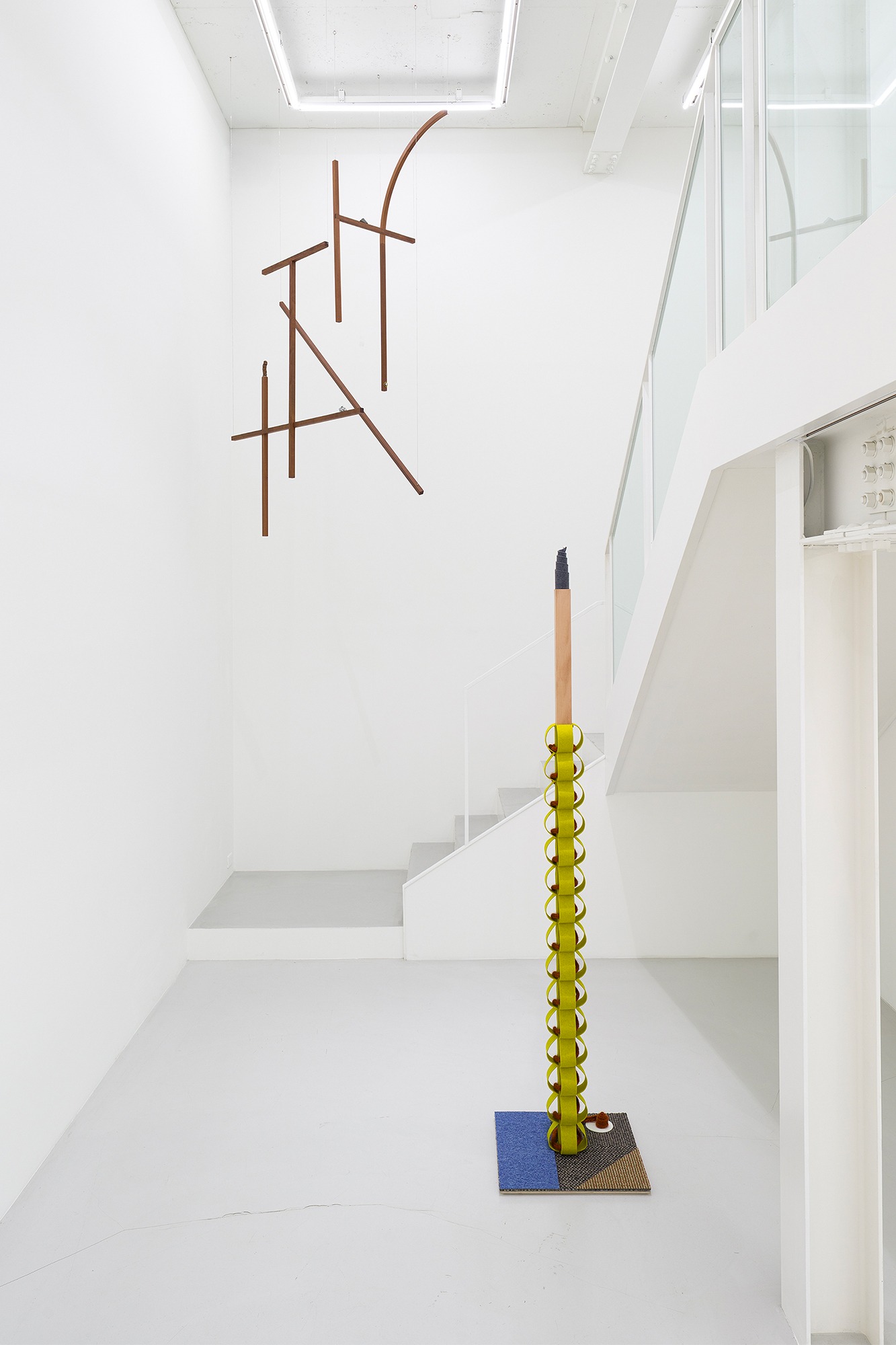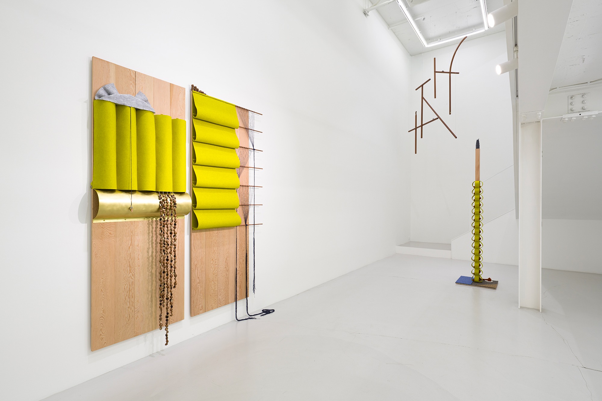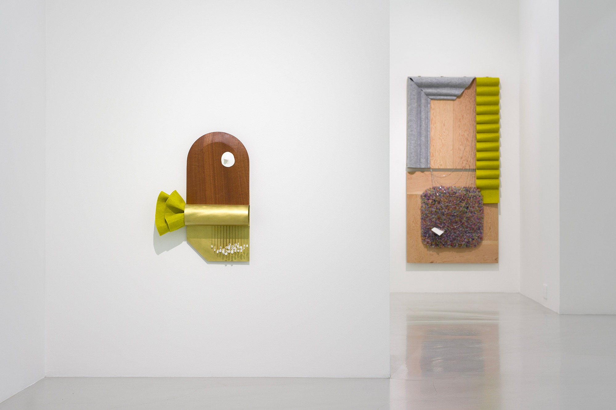 안소연 (미술평론가) 환대라는 단어가 물리적 형태를 취한다면 어떤 모습일까요? 깃발, 등불, 환영하는 몸... 공간에 들어서자마자 가장 먼저 만나는 사물이나 사람은 언제나 특별하다. 이 경험은 이 추상적인 물체 안에 신체를 긴장시키고 높이는 특정 질서, 몸짓, 물질적 감각이 있다는 기대를 불러일으키는 깨끗한 직사각형 형태의 작품인 위층(2025)으로 시작됩니다. 수직과 수평이 교차하는 순서, 점진적인 돌출과 후퇴의 배열, 투명성과 불투명성 사이의 균형을 통해서만 추상화를 통해서만 인식할 수 있는 일종의 형태가 존재한다. 누군가가 오고 가는 것은 물체 자체조차 불안하게 만드는 것 같습니다. 사물의 위치, 방향, 크기, 무게는 형태가 형성될 때까지 아주 조금씩 변합니다. 이러한 움직임 내에서 상황은 대상에 들어갑니다. 이은누의 개인전 '가사'에 들어서면 위층의 환대와 함께 이은누의 '오브제'가 벽과 바닥, 천장에 세심하게 배치된 내부 장면을 만나게 된다. 크고 작은 것들 사이에서, 무릎 근처에 놓인 것, 눈높이에 놓인 것, 머리 위로 닿는 것, 심지어 포옹을 불러일으킬 것 같은 모양과 두께를 가진 바닥에 서 있는 것까지, 나는 이 공간의 구석구석을 만진 '거인'의 몸을 상상하기 시작한다. 위층과 완벽하게 일치하는 내 시선의 맨 끝에는 프레임(2025)이 서 있습니다. 잘 광택이 나는 나무 패널에는 서로 다른 물체가 겹겹이 쌓여 깊이의 미묘한 차이가 있습니다. 여러 패널이 결합되어 있기 때문에 잘못 정렬된 나뭇결은 마루판이나 원목 가구의 표면을 연상시킵니다. 두 가지 색상의 펠트, 금속 체인, 스티치 자수를 부착하는 Lee의 행동은 신중하고 정확해 보입니다. 장식용 몰딩 곡선처럼 회색 펠트를 대각선으로 자르고 다양한 간격으로 구부린 다음 나무 패널의 한쪽 가장자리를 깔끔하게 덮습니다. 그 옆에 올리브색 펠트를 블라인드처럼 수직으로 떨어지는 규칙적인 주름으로 접어 인접한 가장자리에 드레이프하고 나머지 공간을 채우기 위해 금속 사슬을 걸고 있습니다. 컬러 실이 있는 바닥의 바느질 자수의 둥근 직사각형은 나무 바닥의 카펫이나 깔개의 질감을 연상시킵니다. 실 사이에 끼워진 하얀 봉투는 그 거인의 몸에 대한 상상력을 다시 불러일으킵니다. *출처: 갤러리 SP