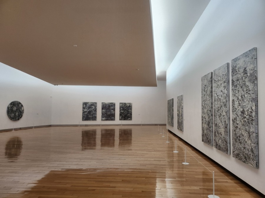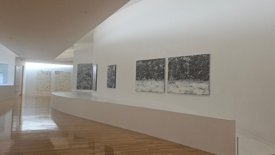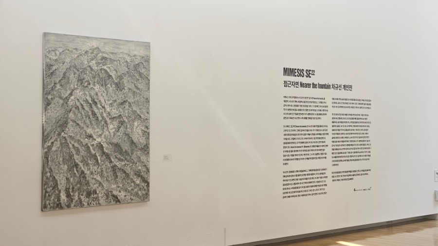 미메시스 아트 뮤지엄에서는 차규선의 개인전 「점근자연 Nearer the fountain」을 개최한다. 차규선은 캔버스에 흙이나 물감 등으로 안료 막을 덮고, 그 표면을 긋거나 긁거나 씻어 내는 <분청회화> 기법으로 풍경을 그린다. 그가 흙 위에 그리는 심상 풍경은 작가가 내면화 한 풍경을 시(詩)를 쓰듯 간결한 선으로 꺼내 놓는 산수화다. 이번 전시는 차규선이 30여 년간 작품에 정진하면서 자기 내면에 생겨난 <시>를 회화에 포착하여 평면으로 구축해 온 차규선만의 시적 세계를 조명해 볼 기회가 될 것이다. 전시 제목인 <점근자연 Nearer the fountain>은 차규선이 회화 작업을 통해 닿고자 하는 근본적인 것, 즉 자연과 그것에 도달하려 온 힘을 다하는 자기 의지를 담는다. 중국 동진 시대의 명장 환온(桓溫)과 문인 맹가(孟嘉)가 예술의 본질을 논하며 예술은 점점 자연에 가까울수록 그 본질에 다가선다고 한 고사에서 연유하는 <점근자연(漸近自然)>은, 회화를 통해 자연이라는 궁극적 원형에 도달하고자 하는 차규선의 근본적 태도에 맞닿아 있다. <Nearer the fountain>의 <샘fountain>은 오랫동안 예술로 추구하여 근원이 된 자연을 샘∙물로 대치하며, 작가가 목적지로 삼아 가까이 다가가려 하지만 결코 닿을 수 없는 지점을 의미하기도 한다. 이번 전시는 그 누구도 도달했다고 말할 수 없는 이상(理想)으로서의 자연을 담고자 하는, 한 예술가의 멈추지 않는 여정으로 우리를 초대한다. ㅡ 형다미 / 미메시스 아트 뮤지엄 선임 큐레이터 ‘MIMESIS SE’는 ‘MIMESIS Solo Exhibition’의 약자로, 미메시스 아트 뮤지엄에서 열리는 22번째 개인전임을 뜻한다. 차규선의 <분청회화>는 캔버스에 흙을 바르고 그 위에 흰색 물감을 덮은 뒤, 채 마르기 전에 긁어내어 분청사기를 회화적으로 변용∙확장한 화법이다. 작가는 흰색 물감의 면이 마르기 전, 화면의 전체 구성을 미리 떠올린 뒤 한 번에 그려 내며, 작업이 시작되면 중도에 멈추지 않고 몰입하면서 몇 시간 만에 완성해야만 한다. 이 몰입의 순간 긋는 획 하나하나는 사의(寫意)를 담아 (자신을 포함한) 만물에 내재한 본질로서의 자연을 표상하며, 이는 문인화적 특성을 띈다. 한 획으로 그어진 선은 나무 한 그루가 되고 곧이어 산세로 이어지는데, 전통 수묵화와 닮은 듯하나 닮지 않았다. 차규선의 선묘는 전통 산수에서 먹의 농담과 필법으로 사의(寫意)를 담은 풍경을 그려내는 방식과 맞닿아 있으면서도, 긁혀 나간 자리 아래로 드러난 캔버스 면과 그 옆에 뭉쳐진 물감의 물질성을 지닌다. 이는 감상자에게 그림 속과 바깥 사이를 오가게 하는 입체적 감각으로 와닿는다. 작가가 오랜 시간 탐구해 온 화법은 단색조를 기반으로 하기에, 그 재료가 변주되는 과정이 더욱 선명하게 드러난다. 초기의 풍경들은 빠른 필획과 뿌리기로 거칠게 휘몰아치는 숲의 바람을 담아냈다가도, 하얀 물감을 물로 뭉근하게 씻어 내어 안개 낀 듯 몽환적인 설경을 그리기도 하는 등 격정적이고 변화무쌍한 양상을 보여 준다.(「풍경」, 2008년 등) 작품은 작가의 심경을 솔직히 담아내는 기록으로도 보인다. 평생 살아 익숙한 지역을 떠나 제주라는 생소한 환경에 머무르며 썼던 일기는 캔버스 위에서 글씨로 표현되기도 하였다.(「제주일기」, 2011년 등) 작가는 일상에서 발견한 자연의 아름다움과 세속의 추함을 마주하며 그것에 반응하는 자기 내면에 집중하여 그림으로 담거나 가끔 일기나 편지의 한 구절처럼 제목을 짓기도 한다. 세상에 염증을 느끼며 그린 작품의 제목을 <어디서 무엇이 되어 다시 만나지 말자>로 지어 시인인 친우에게 보내자 그 화답으로 온 말을 제목으로 삼은 「그래도 볼 수 있을 때 봅시다」(2025)는 자신의 그림을 다시 새롭게 바라보게 된 (의도치 않은) 경험이 담겨 있다. 일상에서 나눈 대화가 작품을 그려 낸 과정과 겹치며, 삶 속에 작품을, 작품 속에 삶을 중첩시키는 작가의 모습 역시 그곳에 비친다. 차규선은 흙을 칠하고 하얀 분을 발라 매일의 시(詩)를 그린다. 손가락을 들어 흙바닥에 선을 긋는 인간의 그리기 본능이 지금까지도 새롭게 감각된다는 점이 인상적이다.